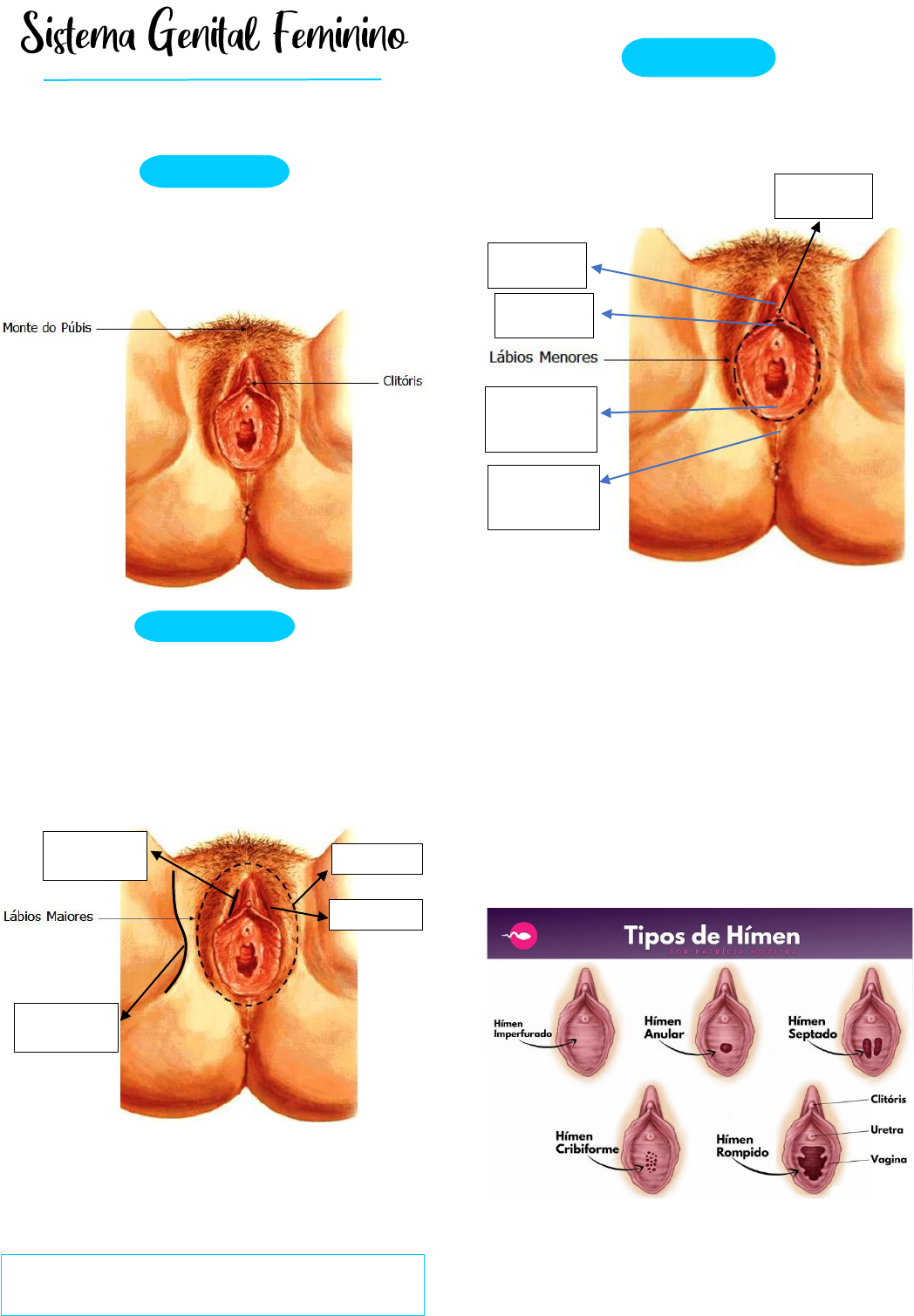 Localizados no períneo anterior Monte do púbis Região encoberta por pelos em frente à sínfise púbica. É também formado por uma camada de tecido adiposo (com a finalidade de proteção da parte óssea) que se estende para baixo e para trás e forma os grandes lábios/lábios maiores. Lábios Maiores Duas pregas laterais que são continuações posteriores do monte do púbis. Tem uma face lateral (voltada para o sulco genitofemoral) coberta por pelos pubianos e uma face medial (voltada para os pequenoa lábios) lisa e apresenta mucosa. Possui em torno de 7 cm . • Sulco interlabial: entre os lábios maiores e menores • Comissura anterior dos lábios: formada a partir da união dos lábios menores Lábios menores Medialmente aos lábios maiores, possuem cerca de 3 cm, desprovidos de pelos pubianos e de gordura, compostos por mucosa • Prepúcio e frênulo do clitóris: pregas dos lábios menores • Quando os lábios menores se encontram posteriormente, formam a fossa do vestíbulo da vagina • O espaço delimitado entre os lábios menores recebe o nome de Vestíbulo da Vagina. É onde desemboca o óstio externo uretral, o óstio da vagina e os ductos das glândulas vestibulares. • Comissura posterior: localizada na região posterior dos lábios menores • Hímen: estrutura parcialmente obliterada encontrada no óstio da vagina; • Carúnculas himenais: “franjas” nas laterais do orifício indicando que o hímen foi rompido. Órgãos genitais externos/pudendo feminino/vulva Face lateral Face medial Sulco genitofemoral Em idosas acamadas por muito tempo, pode ocorrer fissuras nesses sulcos Sulco interlabial Prepúcio do clitóris Frênulo do clitóris Fossa do vestíbulo da vagina Frênulo dos lábios do pudendo Glande do clitóris GABRYELLA FREITAS | UFPE Anatomia Aplicada à Clínica O hímen imperfurado é a causa mais frequente de obstrução ao fluxo menstrual e seu diagnóstico é feito pela inspeção da genitália externa e confirmado pela ultrassonografia. Ele pode eventualmente provocar sintomas de abdome agudo, porém o melhor tratamento é uma himenotomia e esvaziamento do hidrometrocolpo. Órgãos eréteis do pudendo feminino Bulbo do Vestíbulo Dois corpos que ficam próximos aos lábios maiores envolvidos pela túnica albugínea. Ficam entumecidos durante a excitação sexual, comprimindo o canal vaginal • Na parte mais posterior desse bulbo do vestíbulo, encontra-se as glândulas de Bartholin Clitóris Possui em torno de 7 cm e é dividido em corpo do clitóris na região mediana e a glande na ponta do corpo. Glândulas do vestíbulo: Glândula Vestibular Maior • Serve para lubrificação da região, que aumenta durante a excitação sexual, importante para evitar atritos dolorosos. A maioria dos anticoncepcionais diminuem essa lubrificação. Anatomia Aplicada à Clínica Quando as glândulas de Bartholin passam por algum processo de obstrução de suas saídas, com a formação de cisto, a paciente é diagnosticada com a bartolinite. Vascularização dos órgãos externos • Ramos da artéria pudenda interna Inervação • Nervo pudendo Anatomia Aplicada à Clínica O bloqueio do nervo pudendo pode ser utilizado em pro- cedimentos cirúrgicos da vulva, vagina e do períneo para dessensibilizar esse nervo. Bulbo do vestíbulo Glândulas de Bartholin GABRYELLA FREITAS | UFPE