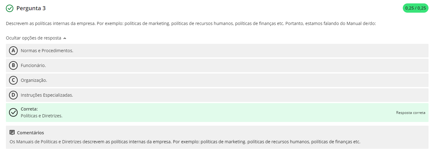 Pergunta 3 Descrevem as políticas internas da empresa. Por exemplo: políticas de marketing, políticas de recursos humanos, políticas de finanças etc. Portanto, estamos falando do Manual de/do: