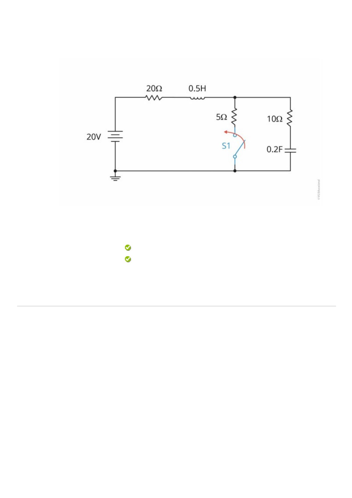 03/10/2020 Blackboard Learn https://anhembi.blackboard.com/webapps/late-Course_Landing_Page_Course_100-BBLEARN/Controller# 1/9 Pergunta 1 Resposta Selecionada: Resposta Correta: Feedback da resposta: Avalie o circuito a seguir, observe que a chave no circuito estava aberta por um longo tempo e fica fechada no t=0. Responda, qual é a tensão sobre terminais do capacitor para t<0 ? O cálculo correto da tensão sobre os terminais do capacitor é importante para obter a equação que define a tensão para t>0. Figura - Circuito RLC com fonte de tensão Fonte: Elaborada pelo autor. Assinale a alternativa correta. 20 V 20 V Resposta correta. A alternativa está correta, pois para t<0 a chave está aberta, então podemos desconsiderar o resistor de 5 ohms. Consideramos o indutor como curto- circuito e o capacitor como circuito aberto. Então, a corrente no circuito será igual a zero. A tensão sobre os terminais do capacitor será igual a tensão da fonte de tensão (20 V). Pergunta 2 Analise o circuito a seguir, observe que a chave no circuito abaixo estava fechada por um longo tempo e fica aberta no t=0. Sendo assim, sobre a tensão no capacitor para t>0, assinale a alternativa correta. Definir o tipo de resposta do circuito RLC é necessário para obter a equação da tensão sobre terminais do capacitor. 1 em 1 pontos 1 em 1 pontos 03/10/2020 Blackboard Learn https://anhembi.blackboard.com/webapps/late-Course_Landing_Page_Course_100-BBLEARN/Controller# 2/9 Resposta Selecionada: Resposta Correta: Feedback da resposta: Figura - Circuito RLC em corrente contínua Fonte: Elaborada pelo autor. A seguir, assinale a alternativa que apresenta a resposta correta. ) ) Resposta correta. A alternativa está correta, pois para t>0, quando a chave está aberta, teremos um capacitor, um indutor e um resistor de 5 ohms em série. Calculamos valor de e . e temos caso de subamortecimento. ) Pergunta 3 Avalie o circuito ilustrado a seguir, observe que a chave no circuito estava fechada por um longo tempo e fica aberta no t=0. Sendo assim, responda qual opção é correta sobre a corrente no indutor para t>0 ? A equação a seguir define a tensão sobre terminais do capacitor para t>0: )) 1 em 1 pontos 03/10/2020 Blackboard Learn https://anhembi.blackboard.com/webapps/late-Course_Landing_Page_Course_100-BBLEARN/Controller# 3/9 Resposta Selecionada: Resposta Correta: Feedback da resposta: Figura - Circuito RLC em corrente contínua Fonte: Elaborada pelo autor. Assinale a alternativa correta. Resposta correta. A alternativa está correta, pois para t<0, a chave está fechada por muito tempo. Então, no circuito equivalente, consideramos o capacitor como circuito aberto e o indutor como curto-circuito. A corrente do indutor será igual a . A tensão sobre terminais do capacitor para t<0 será igual a . Para t>0, quando a chave está aberta, teremos um capacitor, um indutor e um resistor de 5 ohms em série. ) = Pergunta 4 Avalie o circuito a seguir, observe que a chave no circuito abaixo estava aberta por um longo tempo e fica fechada no t=0. Nesse sentido, responda qual opção é correta sobre a corrente no indutor para t>0 ? O circuito contém uma fonte independente de tensão CC e uma fonte dependente de corrente. 1 em 1 pontos 03/10/2020 Blackboard Learn https://anhembi.blackboard.com/webapps/late-Course_Landing_Page_Course_100-BBLEARN/Controller# 4/9 Resposta Selecionada: Resposta Correta: Feedback da resposta: Figura - Circuito RLC Fonte: Elaborada pelo autor. A seguir, assinale a alternativa que apresenta a resposta correta. Resposta correta. A alternativa está correta, pois quando a chave está aberta, a corrente no indutor está igual a zero e também, a corrente da fonte dependente está igual a zero. Então: . Nessas condições, podemos concluir que: . Após o fechamento da chave, temos que descrever a corrente no indutor através de uma equação diferencial. Logo teremos: . Observamos que e a resposta do circuito é amortecimento supercrítico. Após calcular as constantes, a resposta do circuito será descrita na seguinte forma: . Pergunta 5 Analise o circuito abaixo, onde um resistor de 6Ω, um indutor de 2H e um capacitor de 0,5F estão em série. O circuito não tem fonte de tensão ou fonte de corrente. Considerando a importância de estudo de resposta natural do circuito RLC (por exemplo, na área de projeto de filtros), qual opção é correta sobre a resposta natural do circuito a seguir? 1 em 1 pontos 03/10/2020 Blackboard Learn https://anhembi.blackboard.com/webapps/late-Course_Landing_Page_Course_100-BBLEARN/Controller# 5/9 Resposta Selecionada: Resposta Correta: Feedback da resposta: Figura - Circuito RLC Fonte: Elaborada pelo autor. Assinale a alternativa que apresenta a resposta correta. A resposta natural é com amortecimento supercrítico , , A resposta natural é com amortecimento supercrítico , , Resposta correta. A alternativa está correta, pois tem que ser considerado e, também, que as raízes são números reais e negativos, assim, conclui-se que a resposta natural do circuito é com amortecimento supercrítico. As raízes e serão calculadas tendo valores para e para . Pergunta 6 Resposta Selecionada: Resposta Correta: Feedback da resposta: Qual é a opção correta sobre a potência instantânea e média em um sistema de energia elétrica? Considerando que a potência instantânea p(t) dissipada por um componente é o produto da tensão instantânea v(t) sobre os terminais do componente e a corrente instantânea i(t) que passa através dele. Assinale a alternativa correta. Potência média, é a média da potência instantânea ao longo de um período. Potência média, é a média da potência instantânea ao longo de um período. Resposta correta. A alternativa está correta, pois por causa da variação da potência instantânea ao longo do tempo, a medição da potência média é mais conveniente. A potência elétrica é medida utilizando um instrumento chamado w