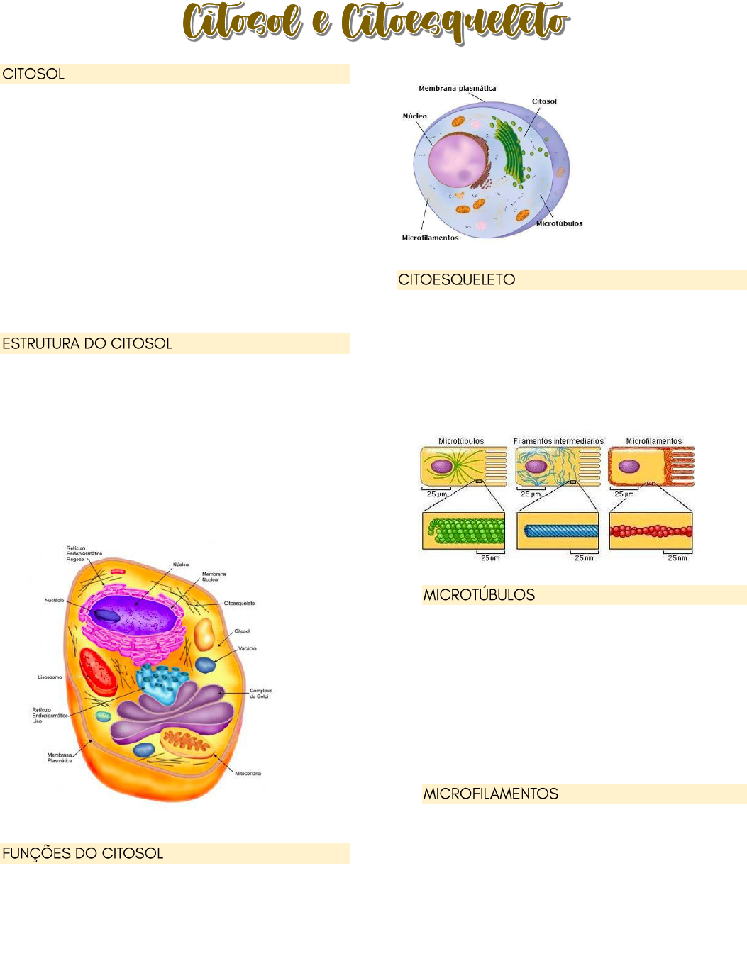 • O citosol está localizado no citoplasma. • O citosol corresponde à parte líquida do citoplasma, sendo chamada, também, de matriz citoplasmática ou hialoplasma. • Composto por água, íons, glicose, ácidos nucleicos, aminoácidos, proteínas dissolvidas, além de lipídios. • É o local onde estão localizadas as moléculas e organelas celulares. • Onde ocorrem várias reações químicas que fazem parte do metabolismo celular. • Faz com que ele possua uma consistência coloidal, ou seja, gelatinosa. • Na região periférica do citoplasma, próxima à membrana, a consistência é mais densa (estado gel) • No centro, a consistência é mais líquida (estado sol). • Podem ocorrer mudanças de estado de gel para sólido e vice-versa. (tixotropismo) Esquema de uma célula eucariótica apontando a localização do citosol e do citoesqueleto. • Levar os cloroplastos para a parte mais externa do citoplasma facilitando a captação da luz e calor vindos do meio externo. • Realiza o aumento do intercâmbio de materiais dentro da célula, entre suas estruturas celulares e com o meio externo. • “Esqueleto” da célula • Armação proteica filamentosa imersa no citosol • Responsáveis pela forma e pela sustentação das células. • Possui 3 diferentes tipos de filamentos proteicos: microtúbulos, microfilamentos e filamentos intermediários. • Rede de estruturas proteicas que fazem a sustentação da célula e organelas e permitem seu movimento. • Responsáveis pela formação de centríolos, cílios e flagelos. • Possui estruturas cilíndricas e rígidas, formadas por uma proteína chamada tubulina. • Presentes em células eucariontes. • Formados pela proteína globular actina, que apresenta a capacidade de contração e relaxamento. • Juntamente com a miosina, formam os principais componentes contráteis das células musculares. • Modifica a forma da célula e movimenta suas estruturas celulares. • São formados por queratina. • Faz o ancoramento de estruturas celulares • Presentes em células epiteliais e seus derivados, como unhas e cabelo. • Sua função é conferir força mecânica às células e participar de suas junções. 1. (Ufes) Assinale a alternativa que não aponta características ou funções do citoesqueleto. a) Constitui-se de uma rede de filamentos de origem proteica, como os microtúbulos, os microfilamentos e os filamentos intermediários. b) Forma um arcabouço interno, que sustenta o volume citoplasmático e mantém suas organelas em locais apropriados, no interior da célula. c) Fornece maquinaria necessária para os movimentos intracelulares, tais como o transporte de organelas de um lugar para outro no citoplasma e a segregação dos cromossomos. d) Determina a capacidade das células eucarióticas e procarióticas em adotar uma variedade de formas e executar movimentos coordenados. e) Está envolvido, pela ação dos filamentos de actina e dos microtúbulos, em processos ativos, como a contração muscular e os batimentos dos cílios e flagelos. 2. Sabemos que o citoesqueleto é formato basicamente de três tipos de fibra: microtúbulos, microfilamentos e filamentos intermediários. Os microtúbulos são formados por subunidades proteicas chamadas de a) colágeno. b) actina. c) miosina. d) queratina. e) tubulina. 3. (UFPEL) O citoesqueleto é formado por um conjunto de filamentos (actina, filamentos intermediários e microtúbulos) presentes no citoplasma das células. Ele é responsável por várias funções celulares e, por isso, é uma estrutura altamente dinâmica que se modifica conforme a necessidade das células. De acordo com o texto e seus conhecimentos, é incorreto afirmar que: a) O fuso mitótico é constituído por citoesqueleto e, durante a mitose, ele se liga aos centrômeros dos cromossomos metafásicos. b) O citoesqueleto participa da contração e distensão das células musculares, da ciclose e do movimento ameboide das células. c) O citoesqueleto está envolvido na determinação da forma da célula e sua sustentação, assim como na organização interna das organelas. d) O citoesqueleto está presente nos cílios e nos flagelos, ambos com função de movimento, porém os cílios são mais curtos e ocorrem em maior número por célula. e) Os centríolos não apresentam na sua constituição o citoesqueleto, apesar de estarem envolvidos no movimento dos cromossomos durante a divisão celular. 4. Os microfilamentos estão presentes no citoesqueleto exercendo funções como manutenção da forma da célula e contração muscular. Esses microfilamentos são formados por a) queratina. b) colágeno. c) pepsina. d) actina. e) tubulina. 5. Nas células eucarióticas, o citoplasma representa a região localizada entre a membrana plasmática e o envoltório nuclear. O material que forma essa região é viscoso, rico em água e íons e recebe o nome de: a) suco celular. b) citosol. c) organela celular. d) cisterna. e) líquido intracelular. 6. Quando observamos o citoplasma de uma célula, percebemos que sua porção mais periférica é mais gelatinosa do que aquela mais interna. Essa região menos fluida é denominada de: a) plasmalema. b) ectoplasma. c) protoplasma. d) mieloplasma. e) endoplasma. 7. (PUC-RS) O citoplasma celular é composto por organelas dispersas numa solução aquosa denominada citosol. A água, portanto, tem um papel fundamental na célula. Das funções que a água desempenha no citosol, qual não está correta? a) Participa do equilíbrio osmótico. b) Catalisa reações químicas. c) Atua como solvente universal. d) Participa de reações de hidrólise. e) Participa do transporte de moléculas. 8. (UFMT) Os primeiros seres vivos da Terra surgiram na água há cerca de 3,5 bilhões de anos. Sem a água, acreditam os cientistas, não existiria vida. Ela forma a maior parte do volume de uma célula, daí sua importância no funcionamento dos organismos vivos. Na célula, A) o p