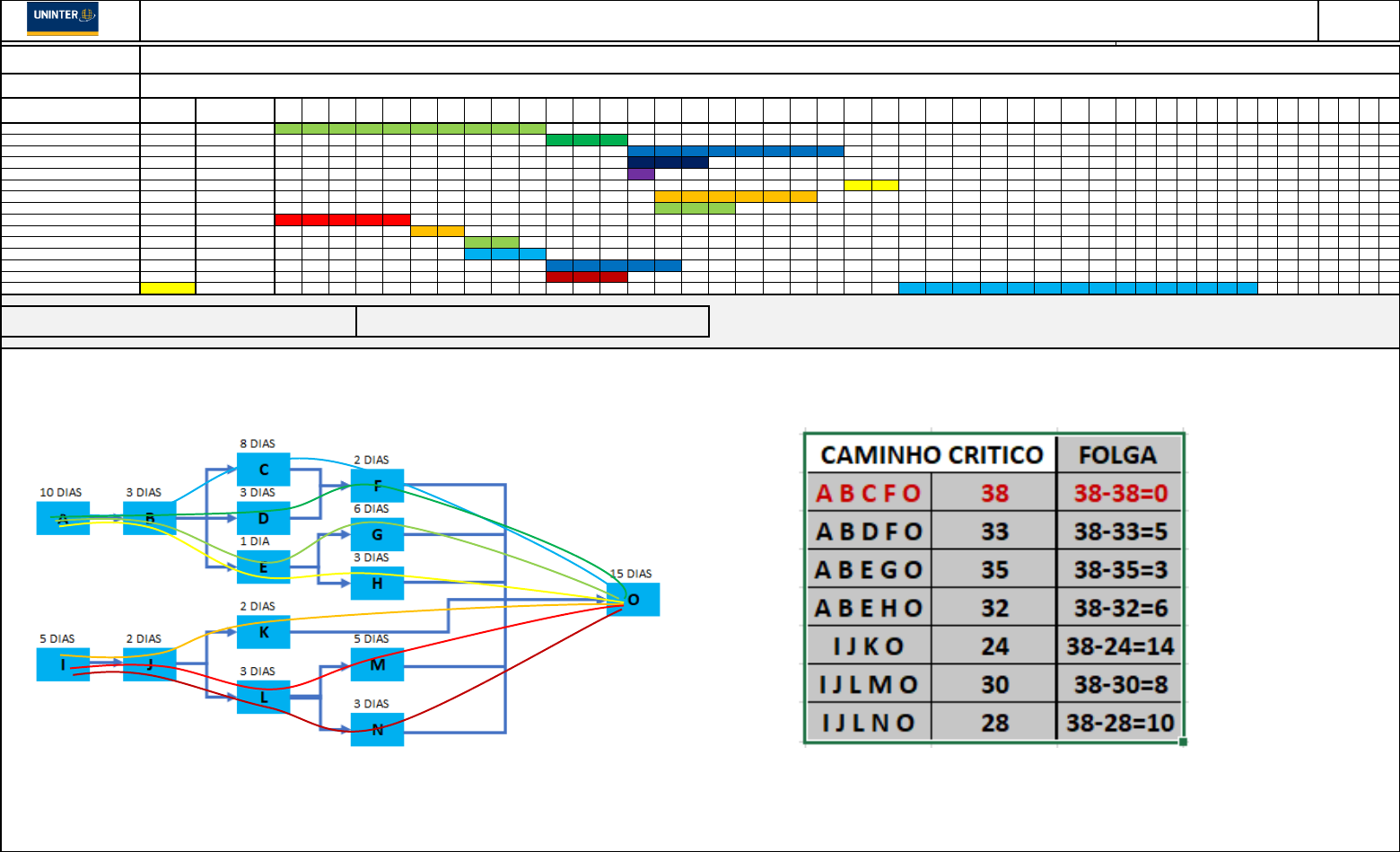 Duração Dependência 1 2 3 4 5 6 7 8 9 10 11 12 13 14 15 16 17 18 19 20 21 22 23 24 25 26 27 28 29 30 31 32 33 34 35 36 37 38 39 40 41 42 43 44 45 10 - 3 A 8 B 3 B 1 B 2 C, D 6 E 3 E 5 - 2 I 2 J 3 J 5 L 3 L 15 F, G, H, K, M, N E F M N O L H I J K Gestão de Projetos Prof. Everton 4233945 Luciano Camatti ATIVIDADE PRÁTICA GESTÃO DE PROJETOS - A_1 2024 G NOME: RU: TEMPO TOTAL DO PROJETO: 38 Atividade A B C D