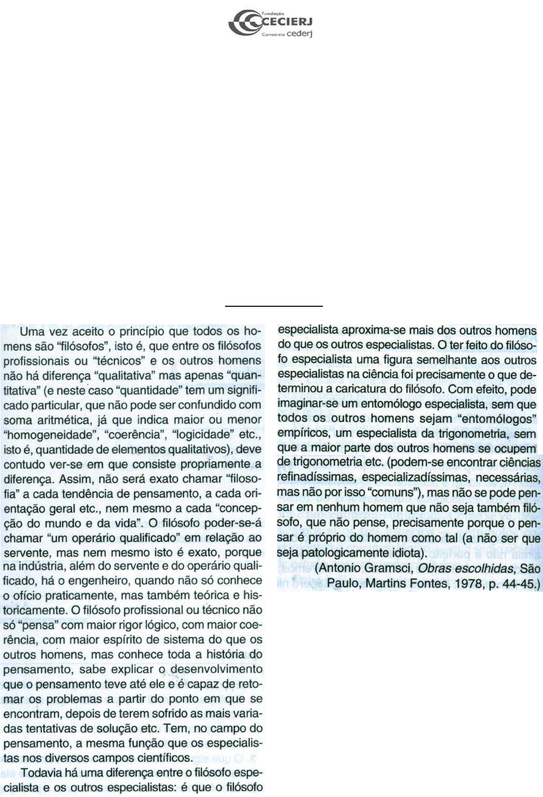 Fundação Centro de Ciências e Educação a Distância do Estado do Rio de Janeiro Centro de Educação Superior a Distância do Estado do Rio de Janeiro Disciplina: Fundamentos da Educação I Avaliação a Distância 2 (2013- 2) Coordenador: Prof. Giovane do Nascimento Tutora a distância: Erica Costantini Polo: ________________________________________ Curso: ___________________ Aluno (a): ___________________________________________Nota: ______________ Atividade: Leia os textos abaixo e responda as questões propostas. Texto 1: O Filósofo Texto 2: A Filosofia da Educação Questões Texto 1: 1. Como Gramsci distingue o filósofo especialista do homem comum, capaz de ter uma concepção do mundo e da vida? (2,5) 2. Em que sentido o filósofo especialista não se confunde com o especialista em qualquer outra área do conhecimento? (2,5) Questões Texto 2: 3. Explique por que a função da filosofia da educação não é atemporal nem visa abordar a educação em abstrato, com seres hipotéticos e distanciados do vivido. (2,5) 4. Por que toda educação é política? (2,5) Boa leitura! As respostas podem ser realizadas em uma folha a parte.