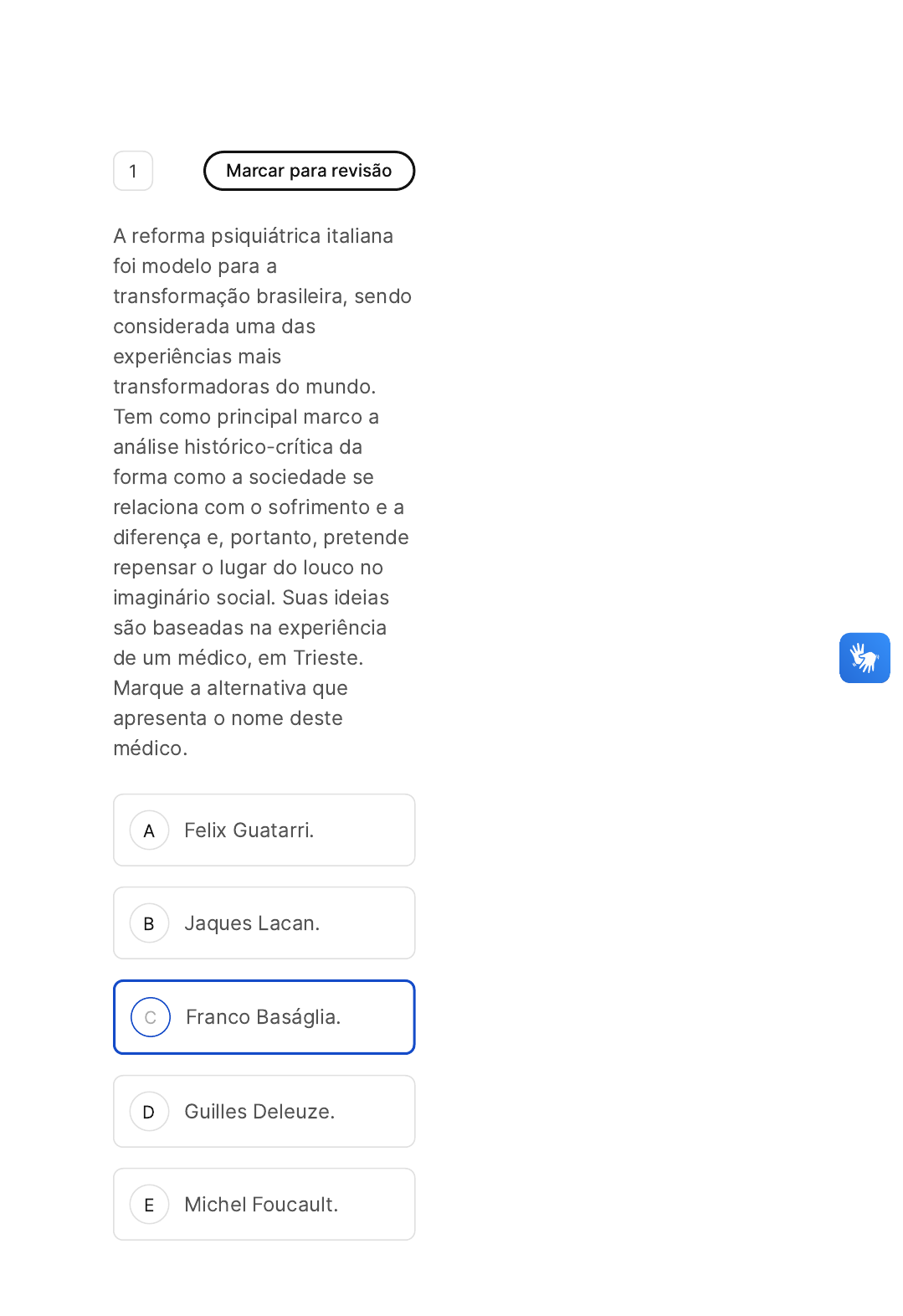 A B C D E 1 Marcar para revisão A reforma psiquiátrica italiana foi modelo para a transformação brasileira, sendo considerada uma das experiências mais transformadoras do mundo. Tem como principal marco a análise histórico-crítica da forma como a sociedade se relaciona com o sofrimento e a diferença e, portanto, pretende repensar o lugar do louco no imaginário social. Suas ideias são baseadas na experiência de um médico, em Trieste. Marque a alternativa que apresenta o nome deste médico. Felix Guatarri. Jaques Lacan. Franco Baságlia. Guilles Deleuze. Michel Foucault. A B C D E 2 Marcar para revisão O CAPS, Centro de Atenção Psicossocial, é o equipamento que presta cuidado em Saúde Mental a diversos segmentos da população, através de equipe multiprofissional. Sobre o funcionamento do CAPS, marque a alternativa correta. O CAPS faz acolhimento de pacientes em crise. Todo município em território nacional deve ter pelo menos um CAPS. Nenhum equipamento do sistema CAPS trabalha com dependência química. O CAPS pode realizar internações prolongadas, se necessário. O CAPS atende somente pacientes estáveis. A B C D E 3 Marcar para revisão Entre os seus pressupostos, o CAPS�AD traz definido uma estratégia de saúde voltada para a atenção integral e universal das pessoas com dependência química, com ações que se articulam na área da saúde e da assistência social. O nome dessa estratégia é: Grupos de apoio. Comunidades terapêuticas. Política proibicionista. Paradigma da abstinência. Redução de danos. 4 Marcar para revisão A TCI é uma modalidade terapêutica que consiste em um espaço de acolhimento do sofrimento, partilha das inquietações, problemas ou situações difíceis, tanto quanto alegrias, vitórias ou histórias de A B C D E superação. Quanto aos princípios e desenvolvimento da Terapia Comunitária Integrativa �TCI�, considere as alternativas corretas: I� As rodas de Terapia Comunitária Integrativa �TCI�, presencial ou on-line, podem ser efetivadas por qualquer membro da comunidade. II� Os terapeutas comunitários são formados por polos reconhecidos pela Associação Brasileira de Terapia Comunitária �Abratecom). II� As rodas de Terapia Comunitária Integrativa �TCI� precisam ser efetivadas necessariamente por terapeutas comunitários. Marque a alternativa correta: II e III são corretas Apenas a I é correta I, II e III são corretas Apenas a III é correta I e III são corretas 5 Marcar para revisão A B C Em 2002, visando à reorientação do modelo de atenção, foi criado o Projeto de Expansão e Consolidação da Saúde da Família �PROESF�, voltado para os municípios com mais de 100 mil habitantes. Sua criação teve diferentes objetivos, identifique as opções verdadeira �V� e falsa �F�� � � Integrar procedimentos de outros níveis de complexidade do Sistema Único de Saúde SUS e, aperfeiçoar tecnologias de gestão com o objetivo de aumentar a resolubilidade do sistema; ( � Consolidar a Política de Atenção Básica em Saúde �PNAB� no país; ( � Ampliar e reestruturar as várias iniciativas voltadas para o desenvolvimento de recursos humanos no modelo Estratégia de Saúde Familiar; ( � Limitar o número de profissionais da Equipe Interdisciplinar de profissionais que atuam na Atenção Básica por Estado; F, V, F e V; V, F, F e V; F, V, V e V; D E A B V, V, F e F. V, V, V e F; 6 Marcar para revisão Não é fácil envolver os pais/famílias dos estudantes nos objetivos do Programa Saúde na Escola. A baixa adesão se dá não apenas nesse programa em particular, mas na própria dificuldade de comunicação entre a escola e os familiares dos estudantes. Nesse sentido a Psicologia Comunitária pode contribuir fundamentalmente utilizando de instrumentos para realização de diagnóstico demográfico; promovendo atendimentos médicos de rotina no âmbito a Atenção Básica; C D E fortalecendo os vínculos entre a escola e a comunidade esclarecendo a importância dessa parceria para o fortalecimento comunitário; a administração de medicamentos e realização de ações mais simples voltadas para o enfrentamento de doenças na comunidade. fazendo visitas domiciliares regulares para acompanhamento de gestantes e lactantes; 7 Marcar para revisão Sobre as características da subjetividade individual e social podemos estabelecer algumas diferenças. Complete o enunciado: Ser sujeito e participar atividade da vida social no tempo e espaço é a principal característica da formação da subjetividade social. A Subjetividade Social é fruto do sistema integral de ____________________ (grupais e 00 hora : 28 min : 46 seg Ocultar Questão 10 de 10 Respondidas �10� Em branco �0� Finalizar prova 1 2 3 4 5 6 7 8 9 10 Prova AV Intervenções Do Psicólogo Na Comunidade Sair A B C individuais) que se articulam em diferentes níveis da vida social nas diferentes instituições, grupos e associações de uma comunidade. A subjetividade social expressa, portanto, a integração dos ____________________ individuais com as _____________________ presentes nos múltiplos espaços sociais formadores de comunidade. Marque a alternativa que completa as lacunas corretamente. Esquemas de poder / valores sociais/ redes valorativas. Representações sociais/ empoderamentos/ subjetividades individuais. Configurações subjetivas / valores individuais / representações sociais. D E Fluxos simbólicos/ valores subjetivos/ redes de inclusão e exclusão. Configurações subjetivas / sentidos subjetivos / configurações subjetivas. 8 Marcar para revisão Comunidades sustentáveis são aquelas que prezam pela sustentabilidade, através da preservação de recursos naturais somada a uma conscientização social coletiva favorável ao bem-estar da população. A sustentabilidade comunitária pode ser considerada uma filosofia de vida dos moradores da comunidade uma vez que se trata de uma meta a