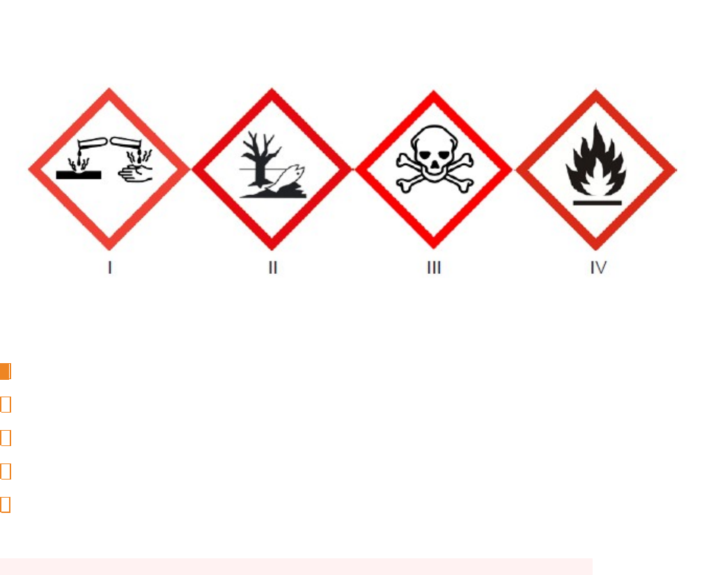 Os pictogramas de perigo são utilizados nos rótulos dos frascos de produtos químicos para que o usuário possa ter condições de identificar os perigos que podem ser gerados por essa substância. Analise os pictogramas numerados abaixo, indique se as afirmativas são verdadeiras (V) ou falsas (F) e assinale a alternativa que apresenta a sequência correta, de cima para baixo. Disponível em: <http://www2.iq.usp.br/iqrecicla/pdv 0705.html>. Acesso em: 23 jan. 2018. ( ) I indica a presença de uma substância corrosiva. ( ) II indica que há peixes mortos no local. ( ) III alerta para o risco de morte que pode ser causado pela substância. ( ) IV indica a presença de fogo. Alternativas A V – F – V – V B V – F – V – F C F – V – V – F D F – V – F – V E V – F – F – V Responder Você errou! Resposta: B