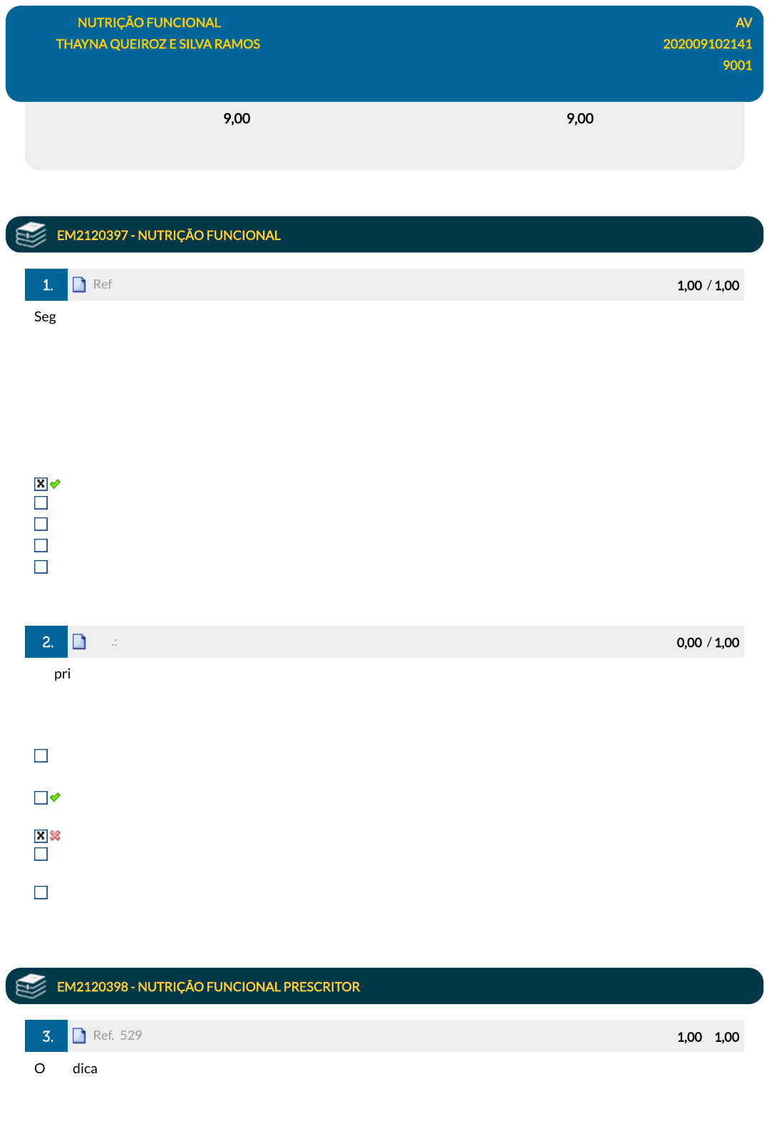 02/04/24, 17:58 EPS https://simulado.estacio.br/alunos/ 1/4 Disciplina: NUTRIÇÃO FUNCIONAL AV Aluno: THAYNA QUEIROZ E SILVA RAMOS 202009102141 Turma: 9001 DGT1221_AV_202009102141 (AG) 22/11/2023 15:30:25 (F) Avaliação: 9,00 pts Nota SIA: 9,00 pts Dispositivo liberado pela Matrícula 202009102141 com o token 127781 em 22/11/2023 15:30:19. EM2120397 - NUTRIÇÃO FUNCIONAL 1. Ref.: 7633806 Pontos: 1,00 / 1,00 Segundo a pesquisa do orçamento familiar (POF) 2017-2018, alimentos ultraprocessados fornecem, em média, cerca de 27% do total de calorias diárias dos adolescentes. Este é um dado preocupante considerando que a maioria destes alimentos são ricos em sódio, gorduras trans e saturadas, e pobre em vitaminas, minerais, �bras e �toquímicos. Neste sentido, é fundamental reconhecer estes alimentos ultraprocessados. (BRASIL. Pesquisa de orçamentos familiares 2017-2018 : análise do consumo alimentar pessoal no Brasil. Rio de Janeiro: IBGE, 2020) Marque a opção que corresponde somente à alimentos ultraprocessados. Biscoitos assados de milho. Milho enlatado. Iogurte integral. Farinha de trigo com fermento. Macarrão. 2. Ref.: 7658045 Pontos: 0,00 / 1,00 Os princípios da nutrição funcional permeiam e interagem entre dois processos: os bioquímicos e desequilíbrios nutricionais. Sobre esses princípios, marque a alternativa correta. A ação dos nutrientes e sua absorção no âmbito celular são independentes da adequação na ingestão para adequação dos desequilíbrios nutricionais. A saúde plena pode ser atingida através de tratamentos que devem ter o objetivo de modular os possíveis desequilíbrios ocorridos. O tratamento centrado no paciente é centrado na doença na busca do equilíbrio bioquímico. Saúde como vitalidade positiva refere-se ao perfeito estado de bem-estar físico, mental e social, buscando sempre a correção dos desequilíbrios ocorridos de acordo com a de�nição de cada nutrólogo. Coletividade bioquímica é um dos princípios básicos da terapia nutricional funcional. EM2120398 - NUTRIÇÃO FUNCIONAL PRESCRITOR 3. Ref.: 5298686 Pontos: 1,00 / 1,00 Os medicamentos �toterápicos são de�nidos pela Anvisa como aqueles que são obtidos a partir de derivados vegetais e cujos riscos e mecanismos de ação e onde agem no nosso corpo são conhecidos. Esses medicamentos são feitos exclusivamente de matéria-prima vegetal. A prescrição de medicamentos �toterápicos, de produtos javascript:alert('C%C3%B3digo da quest%C3%A3o: 7633806.'); javascript:alert('C%C3%B3digo da quest%C3%A3o: 7633806.'); javascript:alert('C%C3%B3digo da quest%C3%A3o: 7658045.'); javascript:alert('C%C3%B3digo da quest%C3%A3o: 7658045.'); javascript:alert('C%C3%B3digo da quest%C3%A3o: 5298686.'); javascript:alert('C%C3%B3digo da quest%C3%A3o: 5298686.'); 02/04/24, 17:58 EPS https://simulado.estacio.br/alunos/ 2/4 tradicionais �toterápicos e de preparações magistrais de �toterápicos, como complemento de prescrição dietética, é permitida ao nutricionista desde que seja portador do título de especialista em �toterapia. Neste contexto, julgue os itens abaixo quanto às competências cabíveis ao nutricionista especialista em �toterapia e informe a alternativa INCORRETA: Reconhecer e adotar condutas que permitam eliminar os riscos sanitários e a toxicidade potencial da �toterapia e que potencializem os efeitos terapêuticos dessa prática, considerando as interações entre os �toterápicos e entre estes, os alimentos e os medicamentos; Inserir o componente de sua especialidade na proposta terapêutica individual ou coletiva, adotada por equipes multipro�ssionais de atendimento à saúde. Identi�car indicações terapêuticas da �toterapia na prevenção de agravos nutricionais e de saúde e na promoção ou recuperação do estado nutricional de indivíduos e coletividades. Reconhecer e indicar os processos extrativos e de formas farmacêuticas adequadas à prática da �toterapia, aplicada à nutrição humana. Identi�car o processo produtivo das plantas medicinais, chás medicinais, medicamentos �toterápicos, produtos tradicionais �toterápicos e preparações magistrais de �toterápicos. 4. Ref.: 5298683 Pontos: 1,00 / 1,00 A Resolução do Conselho Federal de Nutricionistas nº 680/2021 regulamenta a prática da Fitoterapia pelo nutricionista e trouxe novas mudanças. Marque a alternativa verdadeira. O título de especialista em �toterapia pela ASBRAN pode ser obtido por meritocracia, mas será necessário pontuar 32 pontos na análise curricular. O título de especialista em �toterapia obtido pela ASBRAN será oferecido a todos nutricionistas que cursaram pós em �toterapia. Para precisão de chás e plantas medicinais o nutricionista precisa de especialização em �toterapia. A prescrição de chás e de plantas medicinais é permitida a todos nutricionistas sem título de especialista. É permitida a prescrição de fórmulas magistrais de �toterápicos aos nutricionistas que iniciaram ou concluíram pós-gradução em �toterapia depois de 2016. 5. Ref.: 5298679 Pontos: 1,00 / 1,00 FAUEL - Nutricionista (Pref Franc Beltrão)/2018 - As vitaminas lipossolúveis são absorvidas passivamente e devem ser transportadas com os lipídeos dietéticos. Sobre estas vitaminas, relacione as colunas abaixo e marque a sequência CORRETA, de cima para baixo: I. Vitamina A II. Vitamina D III. Vitamina E IV. Vitamina K ( ) Sua de�ciência manifesta-se como raquitismo em crianças e como osteomalácia em adultos. ( ) Seu principal sinal de de�ciência é a hemorragia, que em casos graves pode causar anemia fatal. A condição fundamental é a hipoprotrombinemia, caracterizada pelo tempo de coagulação prolongado. ( ) Além desta vitamina ser encontrada nos produtos de origem animal, os vegetais contêm um grupo de compostos conhecidos como carotenoides, que podem produzir retinoides quando metabolizados no organismo. Embora existam