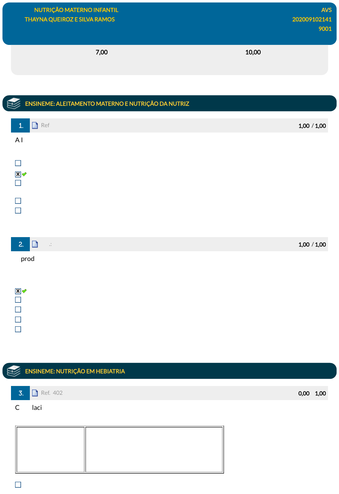 02/04/24, 18:01 EPS https://simulado.estacio.br/alunos/ 1/4 Disciplina: NUTRIÇÃO MATERNO INFANTIL AVS Aluno: THAYNA QUEIROZ E SILVA RAMOS 202009102141 Turma: 9001 DGT1222_AVS_202009102141 (AG) 23/06/2023 15:32:41 (F) Avaliação: 7,00 pts Nota SIA: 10,00 pts Dispositivo liberado pela Matrícula 202009102141 com o token 120549 em 23/06/2023 15:32:37. ENSINEME: ALEITAMENTO MATERNO E NUTRIÇÃO DA NUTRIZ 1. Ref.: 4026319 Pontos: 1,00 / 1,00 A Iniciativa Hospital Amigo da Criança soma-se aos esforços da Política Nacional de Saúde Integral da Criança (PNAISC) coordenados pelo Ministério da Saúde, para: Trabalhar pela adoção de leis que protejam o trabalho da mulher que está amamentando. Apoiar rotinas de serviços que promovam o aleitamento materno. Combater a livre propaganda de leites arti�ciais para bebês, bem como bicos, chupetas e mamadeiras. Esclarecer sobre o controle higiênico-sanitário na manipulação de leites arti�ciais. Informar pro�ssionais de saúde e o público geral. 2. Ref.: 4026315 Pontos: 1,00 / 1,00 A produção de leite humano passa por 3 fases. Nos primeiros dias, é produzido o colostro, depois o leite de transição até que, após o 15º dia, é produzido o leite maduro. O colostro, em relação ao leite maduro, apresenta: Menor teor de gorduras e menos calorias. Não apresenta variação no teor de gorduras e calorias. Maior teor de gorduras e mais calorias. Maior teor de gorduras e menos calorias. Menor teor de gorduras e mais calorias. ENSINEME: NUTRIÇÃO EM HEBIATRIA 3. Ref.: 4026324 Pontos: 0,00 / 1,00 Correlacione as colunas abaixo e marque a alternativa correta em relação aos métodos de avaliação dietética: 1. Consumo atual 2. Consumo habitual ( ) recordatório de 24 horas ( ) questionário de frequência de consumo alimentar ( ) história alimentar ( ) registro alimentar 1,2,1,2 javascript:alert('C%C3%B3digo da quest%C3%A3o: 4026319.'); javascript:alert('C%C3%B3digo da quest%C3%A3o: 4026319.'); javascript:alert('C%C3%B3digo da quest%C3%A3o: 4026315.'); javascript:alert('C%C3%B3digo da quest%C3%A3o: 4026315.'); javascript:alert('C%C3%B3digo da quest%C3%A3o: 4026324.'); javascript:alert('C%C3%B3digo da quest%C3%A3o: 4026324.'); 02/04/24, 18:01 EPS https://simulado.estacio.br/alunos/ 2/4 2,1,1,2 2,2,1,1 1,2,2,1 1,1,2,2 4. Ref.: 4026326 Pontos: 0,00 / 1,00 Em relação ao estado nutricional de adolescentes, assinale a alternativa correta, de acordo com a recomendação da OMS, 2016: - 2 escore z ≤ IMC/ I < - 1 escore z : magreza +2 escore z < IMC/ I ≤ + 3 escore z : sobrepeso IMC/ I > +3 escore z : obesidade + 1 escore z < IMC/ I ≤ + 2 escore z : sobrepeso +1 escore z < IMC/ I ≤ + 2 escore z : eutro�a ENSINEME: NUTRIÇÃO EM OBSTETRÍCIA 5. Ref.: 7793813 Pontos: 1,00 / 1,00 É muito importante o acompanhamento nutricional da gestante, devendo ser realizado em todas as consultas. A avaliação antropométrica tem por objetivo identi�car as inadequações prévias à gestação, assim como o ganho de peso inadequado durante a gestação. Sobre o acompanhamento nutricional da gestante, analise as asserções I e II. I - Durante a gravidez o corpo da mulher passa por várias alterações, tanto anatômicas quanto �siológicas que são importantes para melhor acomodação do feto durante os nove meses de vida intrauterina. Conhecer essas alterações é indispensável ao nutricionista. Porque II - O conhecimentos das alterações gestacionais subsidia o nutricionista a escolher a melhor conduta nutricional no pré-natal. Marque a alternativa que apresenta a relação correta entre as asserções I e II. A asserção I é verdadeira e a asserção II é falsa. A asserção I é falsa e a asserção II é verdadeira. As asserções I e II são falsas. As asserções I e II são verdadeiras, mas a asserção II não é uma justi�cativa para a asserção I. As asserções I e II são verdadeiras e a asserção II é uma justi�cativa para a asserção I. 6. Ref.: 3993007 Pontos: 0,00 / 1,00 Classi�que como verdadeiro (V) ou falso (F) as sentenças abaixo relacionadas ao metabolismo de carboidratos durante a gestação: ( ) A insulina da mãe passa para o �lho através da placenta para regular a glicemia fetal. ( ) A glicose é transferida para o feto através da difusão facilitada. javascript:alert('C%C3%B3digo da quest%C3%A3o: 4026326.'); javascript:alert('C%C3%B3digo da quest%C3%A3o: 4026326.'); javascript:alert('C%C3%B3digo da quest%C3%A3o: 7793813.'); javascript:alert('C%C3%B3digo da quest%C3%A3o: 7793813.'); javascript:alert('C%C3%B3digo da quest%C3%A3o: 3993007.'); javascript:alert('C%C3%B3digo da quest%C3%A3o: 3993007.'); 02/04/24, 18:01 EPS https://simulado.estacio.br/alunos/ 3/4 ( ) Ocorre menor utilização periférica materna de glicose e resistência tecidual materna à insulina. ( ) A hiperglicemia materna estimula a maior produção de insulina fetal, podendo levar à macrossomia. Identi�que a sequência correta: V, V, V, F V, F, F, F F, F, V, V F, V, V, V F, V, V, F ENSINEME: NUTRIÇÃO EM PEDIATRIA 7. Ref.: 4134288 Pontos: 1,00 / 1,00 A introdução da alimentação complementar e oportuna pode ter impactos positivos ao longo de toda vida do indivíduo. Dentre as diretrizes mais atuais, propostas pelo MS, está a orientação para oferecer: Alimentação batida e liquidi�cada para evitar engasgos. A introdução da alimentação complementar de acordo com os horários de refeição da família, evitando o consumo do caroço de feijão e verduras cruas na alimentação. Alimentação variada no horário que a criança se interessa. Alimentação de acordo com os horários de refeições da família, em intervalos regulares. Diferentes alimentos ao longo do dia, independente do horário, sempre que a criança quiser. 8. Ref.: 4137259 Pontos: 1,00 / 1,00 O recém-nascido de baixo peso, muito baixo peso e muitíssimo baixo peso, segundo a OMS são que aqueles que apresentam, respectivamente os pesos (gramas