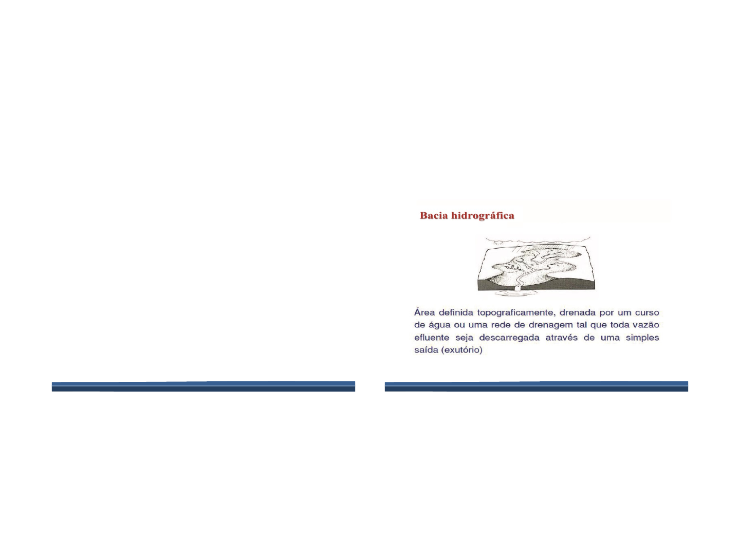 14/08/2023 1 BACIA HIDROGRÁFICA ▪ Uma região em que a chuva ocorrida em qualquer ponto drena para a mesma seção transversal do curso-d’água. ▪ Área de captação natural das precipitações, que faz convergir os escoamentos para um único ponto de saída: o exutório. ▪ Para definir uma bacia: • Curso d’água • Seção transversal de referência (exutório) • Informações de topografia. 14/08/2023 2 14/08/2023 3 14/08/2023 4 14/08/2023 5 14/08/2023 6 14/08/2023 7 Características físicas de uma bacia hidrográfica ✓ área da bacia; ✓ forma; ✓ densidade de drenagem; ✓ declividade; ✓ Hierarquia fluvial. 03/04/2019 14/08/2023 8 Área de drenagem É a área inclusa entre os seus divisores topográficos. A área de uma bacia é o elemento básico para o cálculo das outras características físicas. A área da bacia do Rio Paraíba do Sul é de aproximadamente 56.500 km2 03/04/2019 Fundamental para definir o potencial de geração de escoamento da bacia hidrográfica, uma vez que o seu valor multiplicado pela lamina da chuva precipitada define o volume de agua recebido pela bacia. (TUCCI, 2004, p. 46). Forma da bacia É uma das características da bacia mais difíceis de serem expressas em termos quantitativos. Ela tem efeito sobre o comportamento hidrológico da bacia, como por exemplo, no tempo de concentração. Tc é definido como sendo o tempo, a partir do início da precipitação, necessário para que toda a bacia contribua com a vazão na seção de controle. Ou seja... A mesma quantidade de chuva pode gerar a inundação de uma bacia hidrográfica ou não, a depender do seu tamanho ou formato, bem como da energia potencial de escoamento das águas e de sua capacidade de infiltração. Em igualdade de outros fatores, uma bacia circular e compacta apresenta maior tendência para a ocorrência de cheias do que uma bacia estreita e alongada. Arredondada Radial ou Ramificada Elíptica 03/04/2019 14/08/2023 9 Existem vários índices utilizados para se determinar a forma das bacias, procurando relacioná-las com formas geométricas conhecidas: a) índice de compacidade (Kc): é a relação entre o perímetro da bacia e a circunferência de um círculo de mesma área que a bacia. Kc = 1: bacia perfeitamente circular; Kc >1: bacia alongada. Quanto menor o Kc, mais circular é a bacia, menor o tempo de concentração e maior a tendência de haver picos de enchente. Bacias com formatos diferentes, com mesma área e sujeitas a uma precipitação de mesma intensidade 03/04/2019 Bacias que se aproximam geometricamente de um círculo convergem o escoamento superficial ao mesmo tempo para um trecho relativamente pequeno do rio principal. Caso não exista outros fatores que interfiram, os mesmos valores de Kc indicam maior potencialidade de produção de picos de enchentes elevados. 03/04/2019 14/08/2023 10 Bacia Arredondada Toda a água escoada alcança a saída ao mesmo tempo (enchente maior). Bacia elíptica Escoamento distribuído no tempo (enchente menor). Bacia radial ou ramificada Conjunto de sub-bacias que convergem em uma saída (enchente varia de acordo com a velocidade de escoamento em cada sub-bacia). Kc > 1,50 bacia não sujeita a grandes enchentes. 03/04/2019 Kc: 1,25 – 1,50 bacia com tendência mediana a grandes enchentes; Kc: 1,00 – 1,25 bacia com alta propensão a grandes enchentes; b) Fator de forma (Ff): É a relação entre a largura média da bacia e o seu comprimento axial medido ao longo do curso d’agua desde a desembocadura até a cabeceira mais distante do divisor de água. Onde: • Ff próximo ou maior que 1: indica que a bacia é arredondada (ou circular) • Ff < 1 : a bacia tem forma mais alongada Quanto menor o Ff, mais comprida é a bacia e portanto, menos sujeita a picos de enchente, pois o Tc é maior. 1,00 – 0,75 - sujeito a enchentes 0,75 – 0,50 - tendência mediana < 0,50 - não sujeito a enchentes L i n L = i=1 ; n LAX 03/04/2019 Ff = L 14/08/2023 11 20 25 28 29 32 29 26 17 50 f K = (25,75) = 0,515 kf= (20+25+28+29+32+29+26+17)/8 50 03/04/2019 c) Índice de Conformação (Fc): Compara a área da bacia com a área do quadrado de lado igual ao comprimento axial. Caso não existam outros fatores que interfiram, quanto mais próximo de 1 (um) o valor de Fc (isto é, quanto mais a forma da bacia se aproximar da forma do quadrado do seu comprimento axial) maior a potencialidade de produção de picos de cheia. L2 03/04/2019 cF = A Onde: A = Área da bacia L= Comprimento axial Quanto mais a área da bacia se aproximar da área do quadrado do comprimento axial do seu rio principal, provavelmente mais próxima será da forma de um quadrado, covergindo todo o escoamento ao mesmo tempo para uma mesma região. 14/08/2023 12 Comparação de tipos diferentes de bacias pelos seus índices de forma 03/04/2019 Índice de compacidade Fator de forma Índice de conformação Calcular o coeficiente de compacidade, o fator de forma e o índice de conformação para uma bacia cujo perímetro é 11,3 km, área de 800 ha e comprimento axial de 4,5 km. Foram determinados 7 valores de largura ao longo da bacia, iguais a 1,5 Km; 2,6 Km; 3,5 Km; 4,5 Km; 4,3 Km; 2,8 Km e 1,1 Km 14/08/2023 13 Densidade de drenagem (Dd): Expressa a relação entre o comprimento total dos cursos d’água (sejam eles efêmeros, Bacias com drenagem pobre → Dd < 0,5 km/km2 Bacias com drenagem regular → 0,5 ≤ Dd < 1,5 km/km2 Bacias com drenagem boa → 1,5 ≤ Dd < 2,5 km/km2 Bacias com drenagem muito boa → 2,5 ≤ Dd < 3,5 km/km2 Bacias excepcionalmente bem drenadas → Dd ≥ 3,5 km/km2 (VILLELA e MATOS, 1975) intermitentes ou perenes) de uma bacia e a sua área total. A densidade de drenagem é um indicador do relevo superficial e das características geológicas da bacia [...] permite avaliar a eficácia de drenagem de uma bacia, ou seja, a eficiência na concentração do escoamento superficial no exutório da bacia. Quanto maior a densidade de drenagem, mai