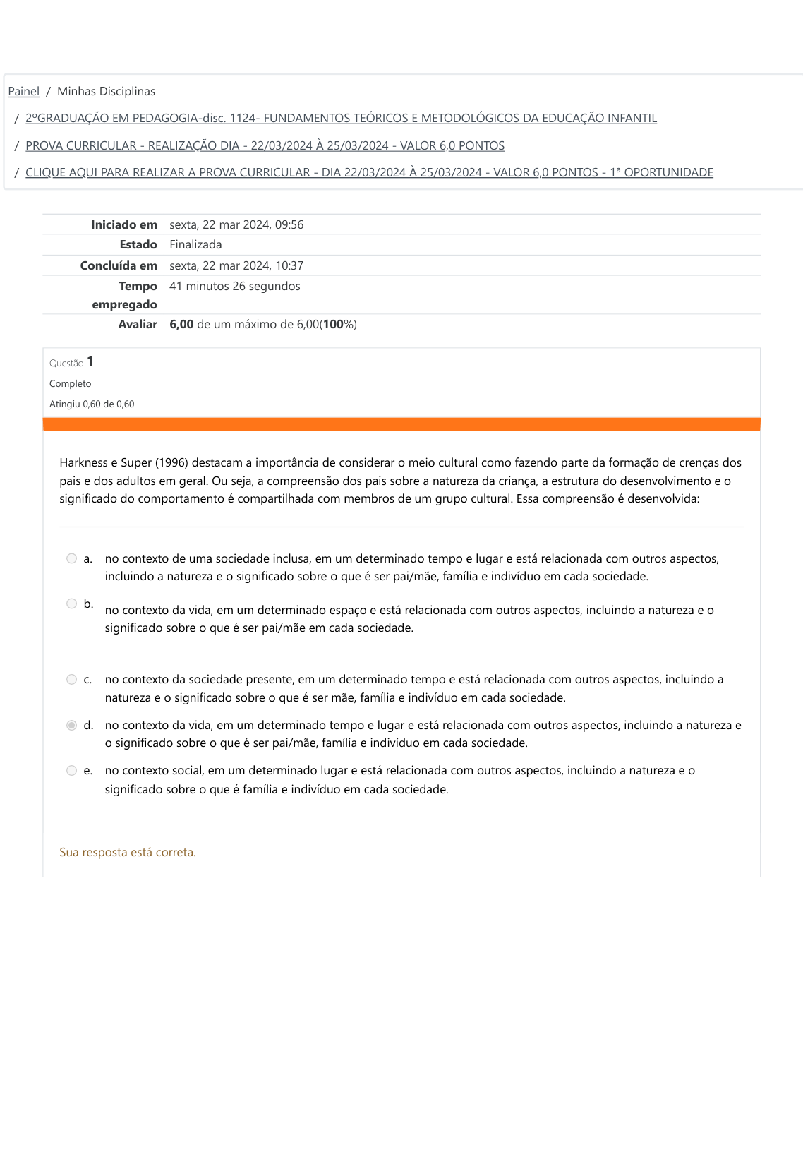 Iniciado em sexta, 22 mar 2024, 09:56 Estado Finalizada Concluída em sexta, 22 mar 2024, 10:37 Tempo empregado 41 minutos 26 segundos Avaliar 6,00 de um máximo de 6,00(100%) Questão 1 Completo Atingiu 0,60 de 0,60 Harkness e Super (1996) destacam a importância de considerar o meio cultural como fazendo parte da formação de crenças dos pais e dos adultos em geral. Ou seja, a compreensão dos pais sobre a natureza da criança, a estrutura do desenvolvimento e o significado do comportamento é compartilhada com membros de um grupo cultural. Essa compreensão é desenvolvida: a. no contexto de uma sociedade inclusa, em um determinado tempo e lugar e está relacionada com outros aspectos, incluindo a natureza e o significado sobre o que é ser pai/mãe, família e indivíduo em cada sociedade. b. no contexto da vida, em um determinado espaço e está relacionada com outros aspectos, incluindo a natureza e o significado sobre o que é ser pai/mãe em cada sociedade. c. no contexto da sociedade presente, em um determinado tempo e está relacionada com outros aspectos, incluindo a natureza e o significado sobre o que é ser mãe, família e indivíduo em cada sociedade. d. no contexto da vida, em um determinado tempo e lugar e está relacionada com outros aspectos, incluindo a natureza e o significado sobre o que é ser pai/mãe, família e indivíduo em cada sociedade. e. no contexto social, em um determinado lugar e está relacionada com outros aspectos, incluindo a natureza e o significado sobre o que é família e indivíduo em cada sociedade. Sua resposta está correta. Painel / Minhas Disciplinas / 2ºGRADUAÇÃO EM PEDAGOGIA-disc. 1124- FUNDAMENTOS TEÓRICOS E METODOLÓGICOS DA EDUCAÇÃO INFANTIL / PROVA CURRICULAR - REALIZAÇÃO DIA - 22/03/2024 À 25/03/2024 - VALOR 6,0 PONTOS / CLIQUE AQUI PARA REALIZAR A PROVA CURRICULAR - DIA 22/03/2024 À 25/03/2024 - VALOR 6,0 PONTOS - 1ª OPORTUNIDADE https://www.eadunifatecie.com.br/course/view.php?id=24209 https://www.eadunifatecie.com.br/course/view.php?id=24209 https://www.eadunifatecie.com.br/my/ https://www.eadunifatecie.com.br/course/view.php?id=24209 https://www.eadunifatecie.com.br/course/view.php?id=24209#section-11 https://www.eadunifatecie.com.br/mod/quiz/view.php?id=851273 Questão 2 Completo Atingiu 0,60 de 0,60 Questão 3 Completo Atingiu 0,60 de 0,60 A legislação legitima as ações e assegura as políticas de atendimento. No Brasil dispomos de legislação avançada na área da educação introduzida pela: a. "Lei de Diretrizes e Bases da Educação Nacional (LDB)"- Lei nº 9.394 , de 20 de dezembro de 1996. b. "Estatuto da Criança e do Adolescente (ECA)"- Lei nº 8.069, de 13 de julho de 1990, e a "Lei de Diretrizes e Bases da Educação Nacional (LDB)"- Lei nº 9.394 , de 20 de dezembro de 1996. c. Constituição Federal de 1988 e o "Estatuto da Criança e do Adolescente (ECA)"- Lei nº 8.069, de 13 de julho de 1990. d. "Lei de Diretrizes e Bases da Educação Nacional (LDB)"- Lei nº 9.394 , de 20 de dezembro de 1996 e o "Estatuto da Criança e do Adolescente (ECA)"- Lei nº 8.069, de 13 de julho de 1990. e. Constituição Federal de 1988, o "Estatuto da Criança e do Adolescente (ECA)"- Lei nº 8.069, de 13 de julho de 1990, e a"Lei de Diretrizes e Bases da Educação Nacional (LDB)"- Lei nº 9.394 , de 20 de dezembro de 1996. Sua resposta está correta. Com o advento da Lei nº 8.069 /90 - Estatuto da Criança e do Adolescente (ECA), os Municípios passaram a ter responsabilidade pelos direitos da infância e adolescência, através da criação de suas redes de apoio que são: a. O Conselho Municipal, do Fundo Municipal e o Conselho Tutelar. b. O Conselho Legislativo, do Fundo Municipal e o Conselho Tutelar. c. O Conselho Legislativo, do Fundo Executivo e o Conselho Tutelar. d. O Conselho Municipal, do Fundo Executivo e o Conselho Deliberativo. e. O Conselho Escolar, do Fundo Municipal e o Conselho Deliberativo. Sua resposta está correta. http://www.jusbrasil.com.br/legislacao/1035083/lei-de-diretrizes-e-bases-lei-9394-96 http://www.jusbrasil.com.br/legislacao/1035083/lei-de-diretrizes-e-bases-lei-9394-96 http://www.jusbrasil.com.br/legislacao/1031134/estatuto-da-crian%C3%A7a-e-do-adolescente-lei-8069-90 http://www.jusbrasil.com.br/legislacao/1031134/estatuto-da-crian%C3%A7a-e-do-adolescente-lei-8069-90 http://www.jusbrasil.com.br/legislacao/1031134/estatuto-da-crian%C3%A7a-e-do-adolescente-lei-8069-90 http://www.jusbrasil.com.br/legislacao/1035083/lei-de-diretrizes-e-bases-lei-9394-96 http://www.jusbrasil.com.br/legislacao/1035083/lei-de-diretrizes-e-bases-lei-9394-96 http://www.jusbrasil.com.br/legislacao/155571402/constitui%C3%A7%C3%A3o-federal-constitui%C3%A7%C3%A3o-da-republica-federativa-do-brasil-1988 http://www.jusbrasil.com.br/legislacao/1031134/estatuto-da-crian%C3%A7a-e-do-adolescente-lei-8069-90 http://www.jusbrasil.com.br/legislacao/1031134/estatuto-da-crian%C3%A7a-e-do-adolescente-lei-8069-90 http://www.jusbrasil.com.br/legislacao/1031134/estatuto-da-crian%C3%A7a-e-do-adolescente-lei-8069-90 http://www.jusbrasil.com.br/legislacao/1035083/lei-de-diretrizes-e-bases-lei-9394-96 http://www.jusbrasil.com.br/legislacao/1035083/lei-de-diretrizes-e-bases-lei-9394-96 http://www.jusbrasil.com.br/legislacao/1031134/estatuto-da-crian%C3%A7a-e-do-adolescente-lei-8069-90 http://www.jusbrasil.com.br/legislacao/1031134/estatuto-da-crian%C3%A7a-e-do-adolescente-lei-8069-90 http://www.jusbrasil.com.br/legislacao/1031134/estatuto-da-crian%C3%A7a-e-do-adolescente-lei-8069-90 http://www.jusbrasil.com.br/legislacao/1031134/estatuto-da-crian%C3%A7a-e-do-adolescente-lei-8069-90 http://www.jusbrasil.com.br/legislacao/155571402/constitui%C3%A7%C3%A3o-federal-constitui%C3%A7%C3%A3o-da-republica-federativa-do-brasil-1988 http://www.jusbrasil.com.br/legislacao/1031134/estatuto-da-crian%C3%A7a-e-do-adolescente-lei-8069-90 http://www.jusbrasil.com.br/legislacao/1031134/estatuto-da-crian%C3%A7a-e-do-adolescente-lei-8069-90 http://