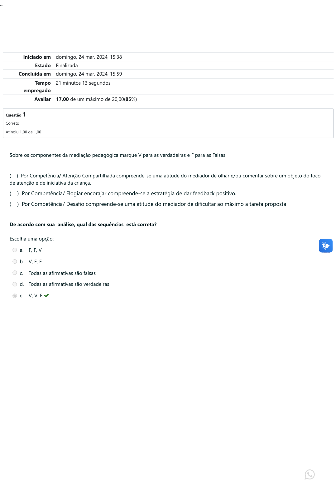 24/03/24, 14:59 Distúrbios de Aprendizagem ou Dificuldades de Ensino? - Avaliação: Revisão da tentativa https://ava.faculdadeimes.org.br/mod/quiz/review.php?attempt=276527&cmid=15409 1/18 ... Iniciado em domingo, 24 mar. 2024, 15:38 Estado Finalizada Concluída em domingo, 24 mar. 2024, 15:59 Tempo empregado 21 minutos 13 segundos Avaliar 17,00 de um máximo de 20,00(85%) Questão 1 Correto Atingiu 1,00 de 1,00 Sobre os componentes da mediação pedagógica marque V para as verdadeiras e F para as Falsas. ( ) Por Competência/ Atenção Compartilhada compreende-se uma atitude do mediador de olhar e/ou comentar sobre um objeto do foco de atenção e de iniciativa da criança. ( ) Por Competência/ Elogiar encorajar compreende-se a estratégia de dar feedback positivo. ( ) Por Competência/ Desafio compreende-se uma atitude do mediador de dificultar ao máximo a tarefa proposta De acordo com sua análise, qual das sequências está correta? Escolha uma opção: a. F, F, V b. V, F, F c. Todas as afirmativas são falsas d. Todas as afirmativas são verdadeiras e. V, V, F https://whatsa.me/5533991112773/?t=Ol%C3%A1,%20tenho%20d%C3%BAvidas.... 24/03/24, 14:59 Distúrbios de Aprendizagem ou Dificuldades de Ensino? - Avaliação: Revisão da tentativa https://ava.faculdadeimes.org.br/mod/quiz/review.php?attempt=276527&cmid=15409 2/18 Questão 2 Incorreto Atingiu 0,00 de 1,00 Questão 3 Correto Atingiu 1,00 de 1,00 Sobre o Projeto de desenvolvimento individual (PDI), marque V (verdadeiro) ou F (falso): ( ) Trata-se de um instrumento obrigatório para acompanhamento, avaliação e regulação da aprendizagem. ( ) Trata-se de um instrumento regulamentado legalmente pela Resolução CEE 460, de 12 de dezembro de 2013. ( ) O PDI se configura como ferramenta pedagógica opcional para o educador identificar as dificuldades de aprendizagem. ( ) A elaboração do referido PDI exige que o professor busque estudar as características da necessidade educativa do aluno, identificando se a mesma é oriunda de uma dificuldade, ou se já se configura como distúrbio da aprendizagem. De acordo com sua análise, qual das sequências está correta? Escolha uma opção: a. V, V, V, F b. V, V, F, V c. F, F, F, F d. F, V, V, V e. V, V, V, V O conhecimento relativo às fases do desenvolvimento infantil pode facilitar tanto aos educadores quanto aos pais e familiares. De acordo com esse anunciado, marque com V (verdadeiro) ou F (falso) as sentenças abaixo: ( ) perceberem se o processo de ensino aprendizagem da criança encontra-se em consonância com seu estágio de desenvolvimento humano. ( ) identificarem se o processo de ensino aprendizagem da criança apresenta algum atraso ou altas habilidades etc. ( ) o conhecimento relativo às fases do desenvolvimento infantil só interessa aos pais da criança. De acordo com sua análise qual das sequências está correta? Escolha uma opção: a. Todas as afirmativas são verdadeiras b. Todas as afirmativas são falsas c. V, V, F d. F, F, V e. V, F, V https://whatsa.me/5533991112773/?t=Ol%C3%A1,%20tenho%20d%C3%BAvidas.... 24/03/24, 14:59 Distúrbios de Aprendizagem ou Dificuldades de Ensino? - Avaliação: Revisão da tentativa https://ava.faculdadeimes.org.br/mod/quiz/review.php?attempt=276527&cmid=15409 3/18 Questão 4 Correto Atingiu 1,00 de 1,00 Marque V ou F para as questões abaixo: ( ) No século XXI vivemos a era do livre acesso à informação e à comunicação mediados pelo aceso ao conhecimento em tempo real por meio das tecnologias da informação e da comunicação (TIC). ( ) Diante do livre acesso à comunicação, à informação em tempo real, o conhecimento foi relativizado e por isso o processo de avaliação do conhecimento apreendido pelos educandos deste século não precisa ser relativizado. ( ) A dificuldade de ensinar de alguns educadores parece se configurar antes de tudo como dificuldade de aprender. De acordo com sua análise, qual das sequências está correta? Escolha uma opção: a. Todas as afirmativas são verdadeiras b. Todas as afirmativas são falsas c. V, F, V d. F, F, V e. V, V, F https://whatsa.me/5533991112773/?t=Ol%C3%A1,%20tenho%20d%C3%BAvidas.... 24/03/24, 14:59 Distúrbios de Aprendizagem ou Dificuldades de Ensino? - Avaliação: Revisão da tentativa https://ava.faculdadeimes.org.br/mod/quiz/review.php?attempt=276527&cmid=15409 4/18 Questão 5 Correto Atingiu 1,00 de 1,00 1 Competência/ Desafio Uma atitude do mediador de olhar e/ou comentar sobre um objeto do foco de atenção e de iniciativa da criança; 2 Competência/ Elogiar- encorajar DIC - Apresentar Dicas. Ex: É como escrever a fé, do café. 3 Competência/ Regulação na Tarefa FEP - Dar Feedback Positivo - Oh! Como é bom ter alunos inteligentes. 4 Atenção partilhada DES - Oferecer Desafios Mediação da busca da adaptação a situações novas e complexas. O desafio. Hoje nós fizemos qual medida de comprimento? E depois levanta a mão quem conseguiu fazer a lição. Sobre os componentes da mediação pedagógica enumere a segunda coluna de acordo com a primeira. De acordo com sua análise, qual das sequências está correta? Escolha uma opção: a. 3,1,2,4 b. 2,3,4,1 c. 1,3,2,4 d. 1,2,3,4 e. 4,3,2,1 https://whatsa.me/5533991112773/?t=Ol%C3%A1,%20tenho%20d%C3%BAvidas.... 24/03/24, 14:59 Distúrbios de Aprendizagem ou Dificuldades de Ensino? - Avaliação: Revisão da tentativa https://ava.faculdadeimes.org.br/mod/quiz/review.php?attempt=276527&cmid=15409 5/18 Questão 6 Correto Atingiu 1,00 de 1,00 Marque com V ou F os aspectos que compõem o processo de aprendizagem. ( ) o meio ambiente ( ) o educando ( ) o educador ( ) o estado emocional ( ) a cor da pele De acordo com sua análise, qual das sequências está correta? Escolha uma opção: a. Todas as afirmativas são falsas b. Todas as afirmativas são verdadeiras c. V, V, F, F, F d. V, F, V, V, V e. V, V, V, V, F https://whatsa.me/5533991112773/?t=Ol%C3%A1,%20tenho%20d%C3%BAvidas.... 24/03/24, 14:59 Distúrbio