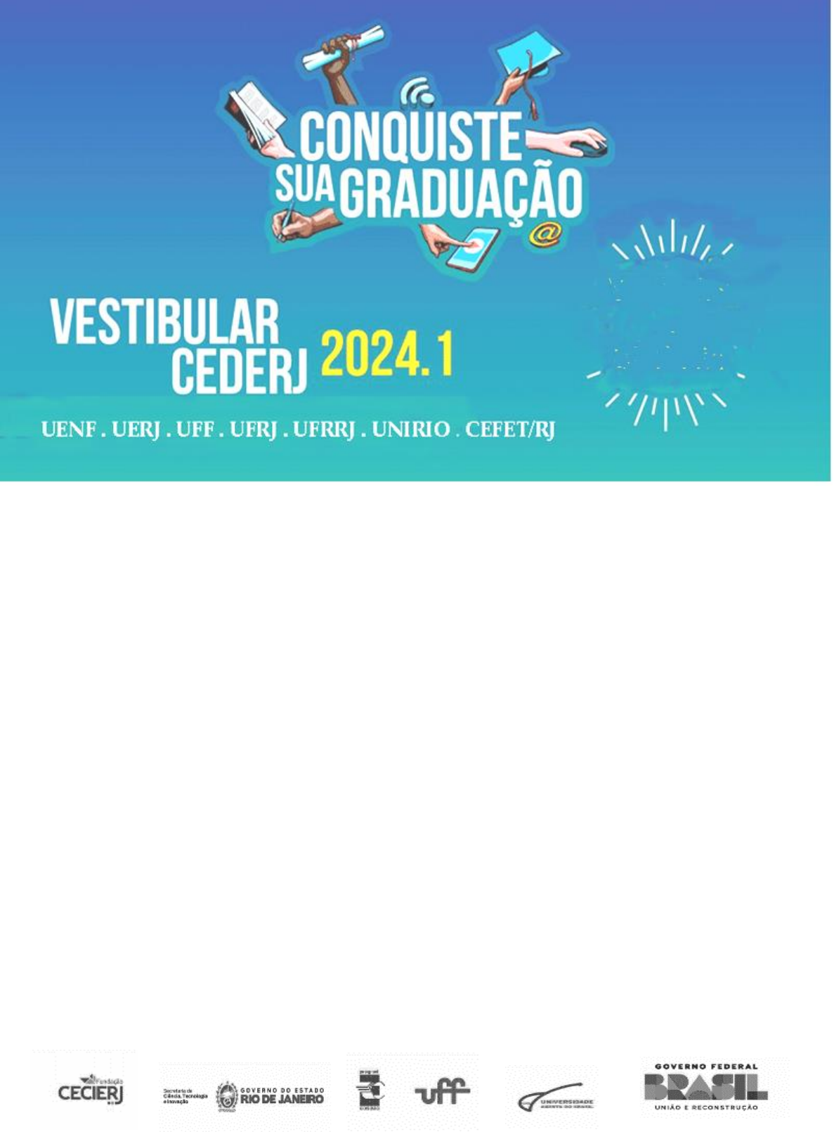 1 VESTIBULAR 2024-1 Caderno de Questões Vestibular CEDERJ 2024.1 1. Você deve ter recebido do fiscal, junto com este Caderno de Questões, um documento contendo na frente o Cartão de Respostas da Prova de Múltipla Escolha e no verso a Folha de Redação. 2. O Caderno de Questões contém quarenta e cinco questões de múltipla escolha do núcleo comum do Ensino Médio, com três questões de Língua Espanhola e três questões de Língua Inglesa (também de múltipla escolha), uma proposta de Redação, espaço para rascunho e uma Tabela Periódica (última página). 3. Confira, no Caderno de Questões, se as informações do item anterior estão corretas e se as questões estão legíveis. Confira, também, no Cartão de Respostas, se seu nome, número de inscrição e número do documento de identidade estão corretos. 4. Utilize apenas caneta esferográfica de corpo transparente com tinta azul ou preta para o preenchimento do Cartão de Res- postas e para redigir a Redação. 5. Você deverá responder às quarenta e cinco questões da Prova de Múltipla Escolha e redigir a Prova de Redação em língua portuguesa. 6. Cada questão de múltipla escolha contém quatro opções de respostas (A) (B) (C) (D), sendo apenas uma delas a correta. A questão que não apresentar opção assinalada ou a que apresentar mais de uma opção assinalada receberá pontuação zero, mesmo que dentre elas se encontre a correta. 7. Na prova de Redação não assine nem registre nada que o identifique, pois, esta ação poderá acarretar em sua eliminação (item 9.2.1 do edital). 8. As questões de língua estrangeira têm numeração de 43 a 45. Responda apenas às questões do idioma estrangeiro que você escolheu no ato de sua inscrição e que consta do seu CCI. 9. Não use qualquer instrumento que sirva para cálculo ou desenho, como também qualquer material que sirva de consulta (item 5.8 do edital). 10. Desligue seu celular e mantenha-o inserido juntamente com o relógio, no saco de pertences entregue pelo fiscal e que deverá ser lacrado. O celular só poderá ser religado na saída do local de prova. 11. Você dispõe de 3(três) horas para realizar esta prova, incluindo o preenchimento do Cartão de Respostas e transcrição da Redação. 12. Após o início da prova, você deverá permanecer na sala por, no mínimo, sessenta minutos. 13. Se você terminar a prova depois de 2(duas) horas de seu início, poderá levar este Caderno de Questões. 14. Ao término da prova, entregue ao fiscal o documento oficial contendo o Cartão de Respostas assinado e a Folha de Redação. Se terminou a prova com menos de duas horas, entregue também este Caderno de Questões. 15. Caso necessite de mais esclarecimentos, solicite a presença do Chefe de Local. Graduação a Distância 2 VESTIBULAR 2024-1 3 VESTIBULAR 2024-1 PROVA DE MÚLTIPLA ESCOLHA LÍNGUA PORTUGUESA Texto 1 A incapacidade de ser verdadeiro Carlos Drummond de Andrade Paulo tinha fama de mentiroso. Um dia chegou em casa dizendo que vira no campo dois dragões da independência cuspindo fogo e lendo fotonovelas. A mãe botou-o de castigo, mas na semana seguinte ele veio contando que caíra no pátio da escola um pedaço de lua, todo cheio de buraquinhos feito de queijo, e ele provou e tinha gosto de queijo. Desta vez Paulo não só ficou sem sobremesa como foi proibido de jogar futebol durante quinze dias. Quando o menino voltou falando que todas as borboletas da Terra passaram pela chácara de Siá Elpídia e queriam formar um tapete voador para transportá-lo ao sétimo céu, a mãe decidiu levá-lo ao médico. Após o exame, o Dr. Epaminondas abanou a cabeça: – Não há nada a fazer, Dona Coló. Este menino é mesmo um caso de poesia. ANDRADE, Carlos Drummond de. A incapacidade de ser verdadeiro. Em: Poesia e prosa. Rio de Janeiro: Nova Aguilar, 1988. Disponível em: https://astravessias.org/blog/a-incapacidade-de- ser-verdadeiro-carlos-drummond-de-andrade/ Acesso em: 30 set 2023. 01 Carlos Drummond de Andrade, considerado um dos maiores poetas brasileiros, também escreveu contos e crônicas. O texto “A incapacidade de ser verdadeiro” é (A) uma crônica, com estrutura predominantemente descritiva. (B) um conto, com estrutura predominantemente narrativa. (C) um poema, com estrutura predominantemente argumentativa. (D) uma dissertação, com estrutura predominantemente expositiva. 02 “Paulo tinha fama de mentiroso.” (Linha 1) De acordo com o texto, Paulo era (A) efetivamente mentiroso, como se comprova em “caíra no pátio da escola um pedaço de lua”. (Linhas 6-7) (B) distraído demais, como se comprova em “A mãe botou-o de castigo”. (Linha 5) (C) realmente doente, como se comprova em “a mãe decidiu levá-lo ao médico”. (Linhas 15-16) (D) muito criativo, como se comprova em “Este menino é mesmo um caso de poesia”. (Linhas 18-19) 03 “Paulo tinha fama de mentiroso. Um dia chegou em casa dizendo que vira no campo dois dragões da independência cuspindo fogo e lendo fotonovelas.” (Linhas 1-4) As formas verbais sublinhadas no trecho acima, “tinha“ (Linha 1), “chegou” (Linha 1) e “vira” (Linha 2) estão, respectivamente, no pretérito imperfeito do indicativo, no pretérito perfeito do indicativo e no pretérito mais-que- perfeito do indicativo e exprimem: (A) ação desenvolvida no passado/ação concluída no passado/ação ocorrida antes de outra ação passada (B) ação que acabou de ocorrer/ ação continuada no passado/ação habitual no passado (C) ação ocorrida antes de outra ação passada/ação desenvolvida no passado/ ação que acabou de ocorrer (D) ação inacabada no presente/ ação passada habitual/ ação posterior à época em que se fala 04 Os vocábulos “incapacidade” (título), “verdadeiro” (título), “gosto” (Linha 9), formam-se, respectivamente, pelos processos de: (A) derivação parassintética; derivação prefixal; derivação imprópria. (B) derivação 