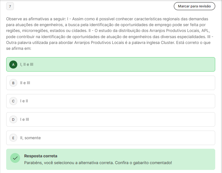 Observe as afirmativas a seguir: I - Assim como é possível conhecer características regionais das demandas para atuações de engenheiros, a busca pela identificação de oportunidades de emprego pode ser feita por regiões, estados ou cidades. II - estudo da distribuição dos Arranjos Produtivos Locais, APL, pode contribuir na identificação de oportunidades de atuação de engenheiros das diversas especialidades. III - Outra palavra utilizada para abordar Arranjos Produtivos Locais é a palavra inglesa Cluster. Está correto que se afirma em: