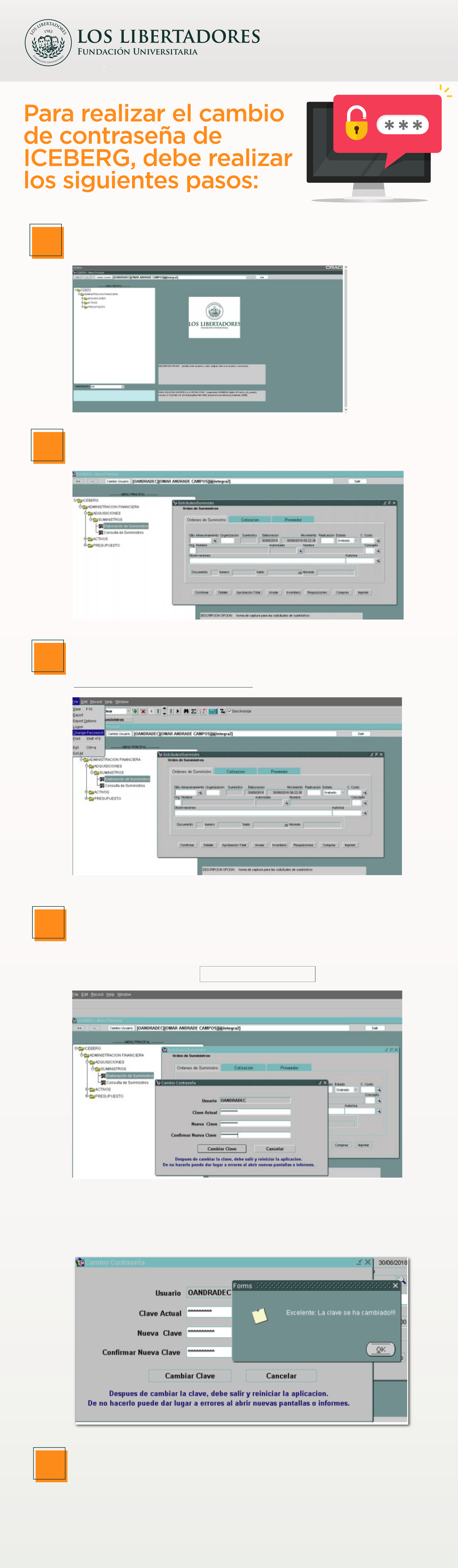 1 2 Para realizar el cambio de contraseña de ICEBERG, debe realizar los siguientes pasos: Ingresar al sistema de información ICEBERG con el usuario respectivo. Ingresar a cualquier opción y/o pantalla del menú a la que tenga acceso su usuario. 3 Después de ingresar a la pantalla respectiva se selecciona la opción del menú superior File – Change Password. 4 Esta opción abre una ventana solicitando la actual contraseña, la nueva contraseña y confirmación de la nueva contraseña, des- pués de ingresar esta información se debe oprimir el botón Cambiar Clave 5 Después de realizar el cambio de contraseña, recuerde que debe salir y volver a ingresar a la aplicación. De no hacerlo puede dar lugar a errores al abrir nuevas pantallas o informes. Al oprimir este botón sale un aviso que indica que la contraseña fue cambiada, como lo indica la siguiente pantalla.
