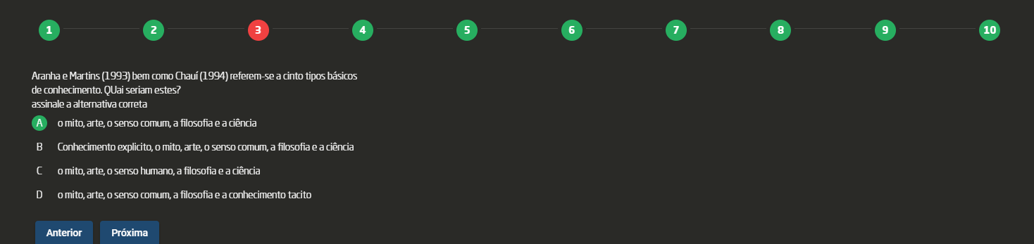 A mito, arte, senso comum, a filosofia e a ciência B Conhecimento explicito, mito, arte, senso comum, a filosofia e a ciência C mito, arte, senso humano, a filosofia e a ciência D mito, arte, senso comum, a filosofia e a conhecimento tacito