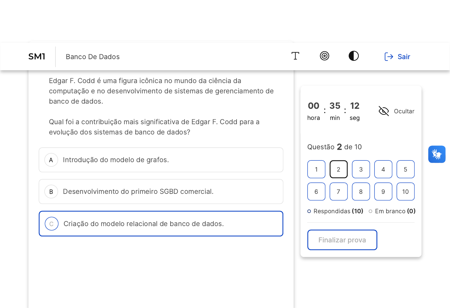 28/03/2024, 19:28 estacio.saladeavaliacoes.com.br/prova/6605eba59089d67d3ea6b5a9/ https://estacio.saladeavaliacoes.com.br/prova/6605eba59089d67d3ea6b5a9/ 1/11 A B C 1 Marcar para revisão Edgar F. Codd é uma figura icônica no mundo da ciência da computação e no desenvolvimento de sistemas de gerenciamento de banco de dados. Qual foi a contribuição mais significativa de Edgar F. Codd para a evolução dos sistemas de banco de dados? Introdução do modelo de grafos. Desenvolvimento do primeiro SGBD comercial. Criação do modelo relacional de banco de dados. 00 hora : 35 min : 12 seg Ocultar Questão 2 de 10 Respondidas �10� Em branco �0� Finalizar prova 1 2 3 4 5 6 7 8 9 10 SM1 Banco De Dados Sair 28/03/2024, 19:28 estacio.saladeavaliacoes.com.br/prova/6605eba59089d67d3ea6b5a9/ https://estacio.saladeavaliacoes.com.br/prova/6605eba59089d67d3ea6b5a9/ 2/11 D E A B C Implementação de bancos de dados navegacionais. Introdução do conceito de Big Data. 2 Marcar para revisão Qual das alternativas abaixo não é uma propriedade desejada das transações em um sistema de banco de dados? Atomicidade. Integridade. Consistência. 28/03/2024, 19:28 estacio.saladeavaliacoes.com.br/prova/6605eba59089d67d3ea6b5a9/ https://estacio.saladeavaliacoes.com.br/prova/6605eba59089d67d3ea6b5a9/ 3/11 D E Durabilidade. Isolamento. 3 Marcar para revisão Após a análise dos requisitos de um projeto de banco de dados para representar as estradas de um país, obteve-se as seguintes especificações: As estradas são descritas pelo nome oficial, apelido (pode ser mais de um), tipo, extensão. As estradas se classificam em: Federais, estaduais e municipais. As estradas se dividem em trechos. Porém um trecho pertence sempre a uma única estrada e não poderá fazer parte de outra estrada. Existe o trecho inicial e trecho final de uma estrada. Na criação de um modelo de entidades-relacionamento para o problema descrito acima, marque a alternativa correta: 28/03/2024, 19:28 estacio.saladeavaliacoes.com.br/prova/6605eba59089d67d3ea6b5a9/ https://estacio.saladeavaliacoes.com.br/prova/6605eba59089d67d3ea6b5a9/ 4/11 A B C D E Teremos três entidades para representar trecho: TRECHO_INICIAL, TRECHO_FINAL e TRECHO. Sendo TRECHO uma entidade fraca que se relaciona com as outras duas. O apelido da estrada será o atributo identificador, pois é o nome pelo qual a estrada é mais conhecida. A classificação das estradas gerará três atributos para a entidade ESTRADA� Federal, estadual e municipal. TRECHO pode ser modelado como uma entidade fraca com relação a ESTRADA. TRECHO será modelado como uma especialização de ESTRADA. 4 Marcar para revisão Em relação aos conceitos de bancos de dados, é correto afirmar que: 28/03/2024, 19:28 estacio.saladeavaliacoes.com.br/prova/6605eba59089d67d3ea6b5a9/ https://estacio.saladeavaliacoes.com.br/prova/6605eba59089d67d3ea6b5a9/ 5/11 A B C D E Um atributo pode possuir cardinalidade de relacionamentos. Um atributo não pode possuir cardinalidade. Um relacionamento não pode possuir cardinalidade. Em uma generalização/especialização total, para cada ocorrência da entidade genérica, existe sempre uma ocorrência em uma das entidades especializadas. O conjunto de valores que um atributo pode assumir é a cardinalidade do atributo. 5 Marcar para revisão Uma chave estrangeira (foreign key, em inglês) é uma parte fundamental do modelo relacional de banco de dados, garantindo que os dados sejam consistentes e refletindo as relações entre as entidades representadas nas tabelas. 28/03/2024, 19:28 estacio.saladeavaliacoes.com.br/prova/6605eba59089d67d3ea6b5a9/ https://estacio.saladeavaliacoes.com.br/prova/6605eba59089d67d3ea6b5a9/ 6/11 A B C D E Qual é a principal função de uma chave estrangeira em um banco de dados relacional? Identificar a localização física de um registro na tabela. Selecionar uma cor de plano de fundo em um aplicativo de planilha. Definir a cor da fonte em um documento. Estabelecer um vínculo entre duas tabelas, permitindo a integridade referencial. Definir o tamanho de uma fonte em um documento. 6 Marcar para revisão �Agência de Fomento do Amapá �AFAP� � Tecnologia da Informação � FCC �2019�� Fernando está usando a linguagem SQL �ANSI� e pretende fazer uma atualização nos dados Nome_Cli e End_Cli do cliente cujo Cod_Cli é Cli01, 28/03/2024, 19:28 estacio.saladeavaliacoes.com.br/prova/6605eba59089d67d3ea6b5a9/ https://estacio.saladeavaliacoes.com.br/prova/6605eba59089d67d3ea6b5a9/ 7/11 A B C D E na tabela Cliente. Nome_Cli passará a ser Ariana e End_Cli passará a ser Rua ABC. O código SQL correto que Fernando escreveu foi: ..I.. Cliente ..II.. Nome_Cli = 'Ariana', End _Cli = 'Rua ABC' ..III.. Cod_Cli = 'Cli01'; Para que o código esteja correto, as lacunas I, II e III devem ser preenchidas, respectivamente, por: SET � WHERE � UPDATE WHERE � SET � UPDATE SET � UPDATE � WHERE UPDATE � SET � WHERE UPDATE � WHERE � SET 7 Marcar para revisão 28/03/2024, 19:28 estacio.saladeavaliacoes.com.br/prova/6605eba59089d67d3ea6b5a9/ https://estacio.saladeavaliacoes.com.br/prova/6605eba59089d67d3ea6b5a9/ 8/11 A B C D E A agregação em bancos de dados SQL refere-se ao processo de resumir e agrupar conjuntos de dados para produzir resultados únicos, geralmente em cenários analíticos e de relatórios. Qual é a função da cláusula HAVING? Limitar o número de registros retornados em uma consulta. Estabelecer condições de filtro com funções de agregação. Exibir resultados de consulta de acordo com um grupo especificado. Excluir registros duplicados de uma consulta. Agrupar os registros baseados em uma coluna específica. 8 Marcar para revisão Sejam as tabelas a seguir: 28/03/2024, 19:28 estacio.saladeavaliacoes.com.br/prova/6605eba59089d67d3ea6b5a9/ https://estacio.saladeavaliacoes.com.br/prova/6605eba59089d67d3ea6b5a9/ 9/11 A B C D E Seja a consulta a seguir: SELECT CODIGONIVEL ,DESCRICAO F
