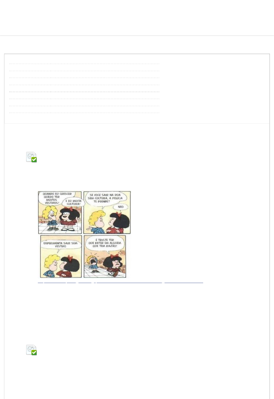 06/04/2024, 01:20 Revisar envio do teste: AVALIAÇÃO I – ESTUDOS ... https://ava.ead.unip.br/webapps/assessment/review/review.jsp?attempt_id=_103479337_1&course_id=_345340_1&content_id=_3969906_1&ret… 1/4 Revisar envio do teste: AVALIAÇÃO IESTUDOS DISCIPLINARES VII 6583-05_SEI_PD_0722_R_20241 CONTEÚDO Usuário mayara.vanni @aluno.unip.br Curso ESTUDOS DISCIPLINARES VII Teste AVALIAÇÃO I Iniciado 06/04/24 01:16 Enviado 06/04/24 01:23 Status Completada Resultado da tentativa 10 em 10 pontos Tempo decorrido 6 minutos Resultados exibidos Respostas enviadas, Perguntas respondidas incorretamente Pergunta 1 Resposta Selecionada: a. Para Bauman (2006), a individualização se tornou o destino de todo habitante de uma grande cidade contemporânea, não uma opção. A sociedade estimula os indivíduos a agirem em função dos problemas e dos medos que surgem diariamente. E, ao tentar fazer com que as vidas tenham sentido, os homens tendem a culpar suas próprias falhas e fraquezas pelos desconfortos e derrotas que enfrentam. Segundo Bauman, a reação só leva a mais isolamento. Desse modo, considerando a tirinha e a visão de Bauman, podemos a�rmar que a noção de comunidade ideal: http://mafalda-portugues.blogspot.com.br/2010/03/analise-da-charge-no-tocante-ao.html Signi�ca entendimento compartilhado de modo natural e implícito. Pergunta 2 A situação abordada na tira torna explícita a contradição entre: UNIP EAD BIBLIOTECAS MURAL DO ALUNO TUTORIAIS LABORATÓRIOSCONTEÚDOS ACADÊMICOS 1 em 1 pontos 1 em 1 pontos http://company.blackboard.com/ https://ava.ead.unip.br/webapps/blackboard/execute/courseMain?course_id=_345340_1 https://ava.ead.unip.br/webapps/blackboard/content/listContent.jsp?course_id=_345340_1&content_id=_3967280_1&mode=reset http://mafalda-portugues.blogspot.com.br/2010/03/analise-da-charge-no-tocante-ao.html https://ava.ead.unip.br/webapps/portal/execute/tabs/tabAction?tab_tab_group_id=_10_1 https://ava.ead.unip.br/webapps/portal/execute/tabs/tabAction?tab_tab_group_id=_27_1 https://ava.ead.unip.br/webapps/portal/execute/tabs/tabAction?tab_tab_group_id=_47_1 https://ava.ead.unip.br/webapps/portal/execute/tabs/tabAction?tab_tab_group_id=_29_1 https://ava.ead.unip.br/webapps/portal/execute/tabs/tabAction?tab_tab_group_id=_64_1 https://ava.ead.unip.br/webapps/portal/execute/tabs/tabAction?tab_tab_group_id=_25_1 https://ava.ead.unip.br/webapps/login/?action=logout 06/04/2024, 01:20 Revisar envio do teste: AVALIAÇÃO I – ESTUDOS ... https://ava.ead.unip.br/webapps/assessment/review/review.jsp?attempt_id=_103479337_1&course_id=_345340_1&content_id=_3969906_1&ret… 2/4 Resposta Selecionada: a. http://designbrandao.blogspot.com/2011/04/entrei-em-panico-e-desliguei-que-tipo.html As relações pessoais e o avanço tecnológico. Pergunta 3 Resposta Selecionada: c. Para Bauman (2006), a individualização se tornou o destino de todo habitante de uma grande cidade contemporânea, não uma opção. A sociedade estimula os indivíduos a agirem em função dos problemas e medos que surgem diariamente. E, ao tentar fazer com que as vidas tenham sentido, os homens tendem a culpar suas próprias falhas e fraquezas pelos desconfortos e derrotas que enfrentam. Para Bauman, a reação só leva a mais isolamento. Segundo o autor, “comunidade” signi�ca entendimento compartilhado do tipo “natural” e “tácito”. Desse modo, considerando a tirinha, indique o tema central: Identidade. Pergunta 4 Resposta Selecionada: a. A noção de gêneros textuais é apoiada em práticas sociais e em saberes socioculturais, porém podem sofrer variações, na medida em que um texto representativo de um gênero pode incorporar outras características. Desse modo, indique a temática tratada no texto Irene do Céu: IRENE NO CÉU IRENE PRETA Irene boa Irene sempre de bom humor Imagino Irene entrando no céu: – Licença, meu branco! E São Pedro bonachão: – Entra, Irene. Você não precisa pedir licença. BANDEIRA, Manuel. Poesia Completa e Prosa. Rio de Janeiro: Nova Aguilar, 1993. Discriminação. Pergunta 5 1 em 1 pontos 1 em 1 pontos 1 em 1 pontos http://designbrandao.blogspot.com/2011/04/entrei-em-panico-e-desliguei-que-tipo.html http://designbrandao.blogspot.com/2011/04/entrei-em-panico-e-desliguei-que-tipo.html 06/04/2024, 01:20 Revisar envio do teste: AVALIAÇÃO I – ESTUDOS ... https://ava.ead.unip.br/webapps/assessment/review/review.jsp?attempt_id=_103479337_1&course_id=_345340_1&content_id=_3969906_1&ret… 3/4 Resposta Selecionada: e. O empreendedor é a inovação do mundo, tornando obsoletas as antigas formas de fazer negócios. Assim, três características básicas identi�cam o espírito empreendedor: necessidade de realização; disposição para assumir riscos; e autocon�ança. Desse modo, identi�que a alternativa que se refere às características do trabalho do empreendedor: Foco nos aspectos estratégicos, nas análises de oportunidades, concentra-se no comprometimento e controle de recursos. Pergunta 6 Resposta Selecionada: c. Para Bauman (2010), o processo da tomada de decisão busca explicações na forma de resultados de uma causa, em geral, satisfazemos nossa curiosidade concluindo que o evento era inevitável ou pelo menos provável. Segundo o autor, a forma de explicar a conduta humana é mais complexa, pois implica as motivações que orientam as ações. Desse modo, considerando a tirinha podemos a�rmar que: http://blogdosquadrinhos.blog.uol.com.br/ As pessoas ignoram as circunstâncias do contexto do trabalho. Pergunta 7 Resposta Selecionada: a. O mundo capitalista é o mundo dos lucros e do retorno de mercado, da competição, da concorrência e da onda do “politicamente correto” por conta de uma visão de um outro mundo possível. Desse modo, a charge sugere que: Fonte: http://miguelcavalcanti.piapara.com/2008/10/17/o-capitalismo-acabou/ O capitalismo passa por uma crise de�nitiva e a nova economia global terá que se reinventar. 1 em