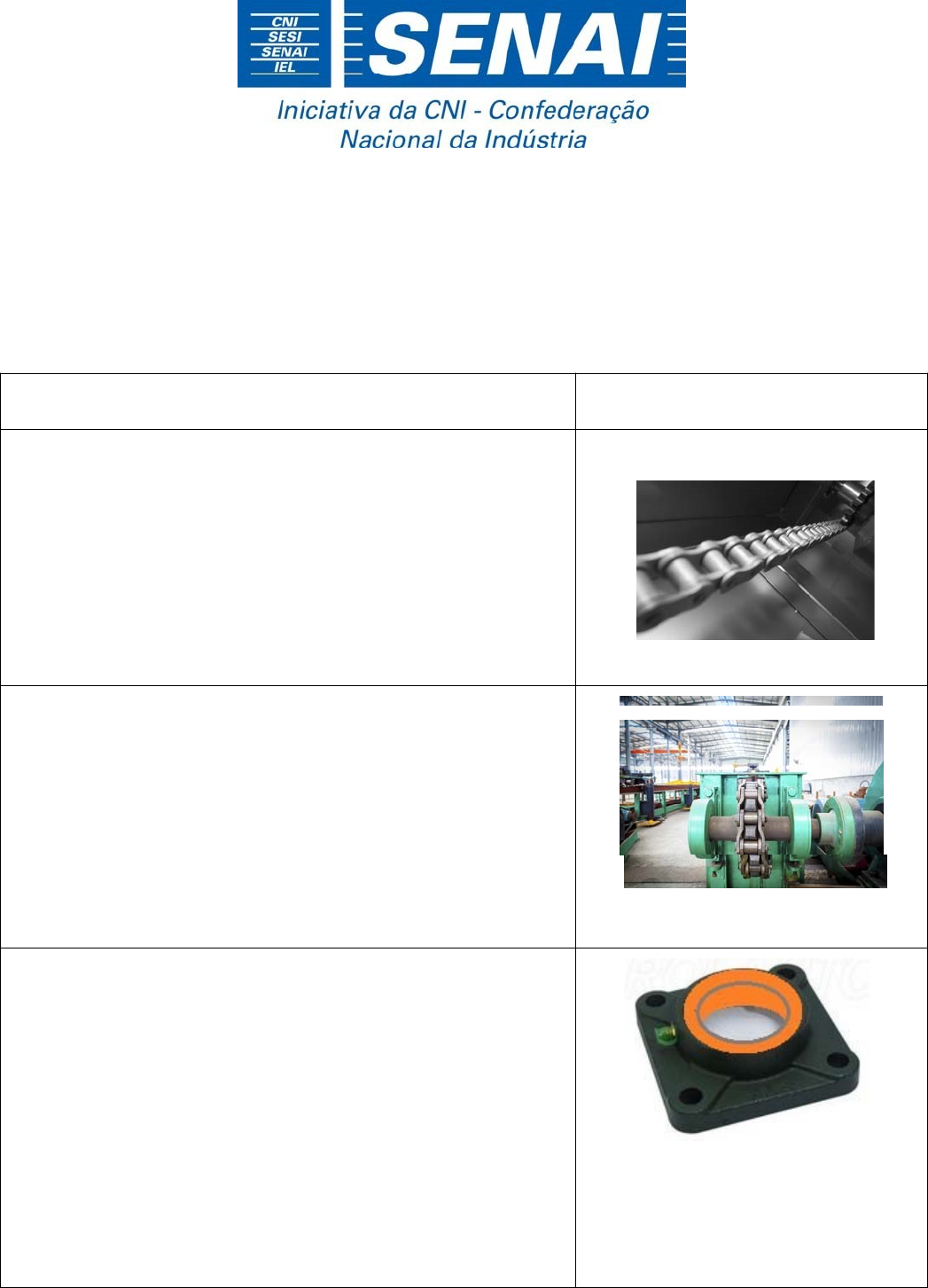 Professor (a): Nome aluno: Data: ELEMENTOS DE MÁQUINAS RELACIONE OS CONCEITOS DA COLUNA 1 COM OS ELEMENTOS DE MÁQUINAS REPRESENTADOS NA COLUNA 2. COLUNA 01 COLUNA 02 São elementos de máquinas utilizados para unir peças, chapas, estruturas e até mesmo outros elementos de máquinas. Proporcionam com facilidade diversas montagens e desmontagens sem alterar sua função e características. São construídos na grande maioria das vezes por conformação nos mais variados tipos de materiais. Em função de sua aplicação a norma especifica vários tipos de acabamentos superficiais e tratamentos térmicos. Resposta: ____________ 01 CORRENTE Fabricadas em arame de aço, com seções retangulares, circular e quadrada, são muito usadas nas indústrias. Possuem três tipos de formatos: cilíndricos, cônico e bicônico. Podem ser de tração, compressão e torção. São utilizadas para travar, empurrar, fechar, amortecer, etc., e voltam ao seu estado original quando a força que estiver agindo sobre ela cessar. Resposta: ____________ 02 ACOPLAMENTO É um elemento de máquina em forma circular, podendo ser planas, abauladas ou com canais. São montadas em eixos de motores, eixos árvores e dão movimentos as máquinas. Dependendo de sua função podem receber a nomenclatura de motora e movida. Resposta: ____________ 03 MANCAL DE DESLIZAMENTO COLUNA 01 COLUNA 02 São elementos de máquinas que proporcionam movimento de rotação através de duas polias onde uma é a motora e outra movida. São utilizadas quando a distância entre os eixos é muito extensa, impossibilitando o uso de engrenagens e podem ser do tipo plana, trapezoidal e dentada. Resposta: ____________ 04 MOLAS Elemento de máquina utilizado na transmissão de movimento de rotação e torque entre dois eixos árvores. Comum na união de bombas e motorredutores, podem ser fixos ou flexíveis e são encontrados em diversos tamanhos e modelos, e para diversas potências. Resposta: ____________ 05 ROLAMENTOS São elementos de máquinas, utilizados aos pares para fazer a transmissão de movimentos, modificar o sentido e o número de rotações, transmitir torque, influenciando também o sentido de direção de um equipamento. Resposta: ____________ 06 CHAVETAS São elementos de máquinas onde são executados trabalhos que exercem força e movimento, em máquinas e equipamentos, sendo que o acoplamento entre o eixo motor e o movido, encontra‐se a grandes distâncias. Suportam grandes esforços e garantem o sincronismo dos movimentos. Necessitam trabalhar bem alinhadas e na grande maioria das vezes, lubrificada. O desalinhamento e a falta de lubrificação são determinantes para redução da sua vida útil. São muito utilizadas também para elevação de carga. Resposta: ____________ 07 ENGRENAGENS COLUNA 01 COLUNA 02 São componentes que servem de alojamento e guia para eixos e árvores, e podem ou não fazer o movimento de rotação nos equipamentos. Estão sujeitos ao atrito através da rotação que executam ou pela força nos alojamentos causada pela carga aplicada no eixo. A sua vida útil depende muito de fatores como o tipo de material utilizado na sua construção, o tipo de trabalho que irá executar, seu dimensionamento e principalmente das condições de lubrificação. Resposta: ____________ 08 CORREIAS Componente que permite a eixos e árvores atingirem maior velocidade com menor atrito. São classificados de acordo com o tipo de seus elementos rolantes, o tipo de carga que suportam e velocidade que giram. Estão presentes nos mais variados lugares e equipamentos, com tamanhos que podem caber em um relógio e gigantescos como os utilizados em motores de navios. Resposta: ____________ 09 POLIAS Elemento de máquina utilizado na união de eixos e árvores a polias, engrenagens, acoplamentos, etc. Seu formato mais comum é o prismático, podendo ter suas faces paralelas, em forma de cunha e também o formato semicircular como um disco. Geralmente são fabricados de aço ao carbono e instalados cru, mas em alguns casos podem receber tratamento térmico. Os perfis mais comuns são o retangular e quadrado, mas também encontramos com perfil redondo. Resposta: ____________ 10 PARAFUSOS Boa Sorte!!!