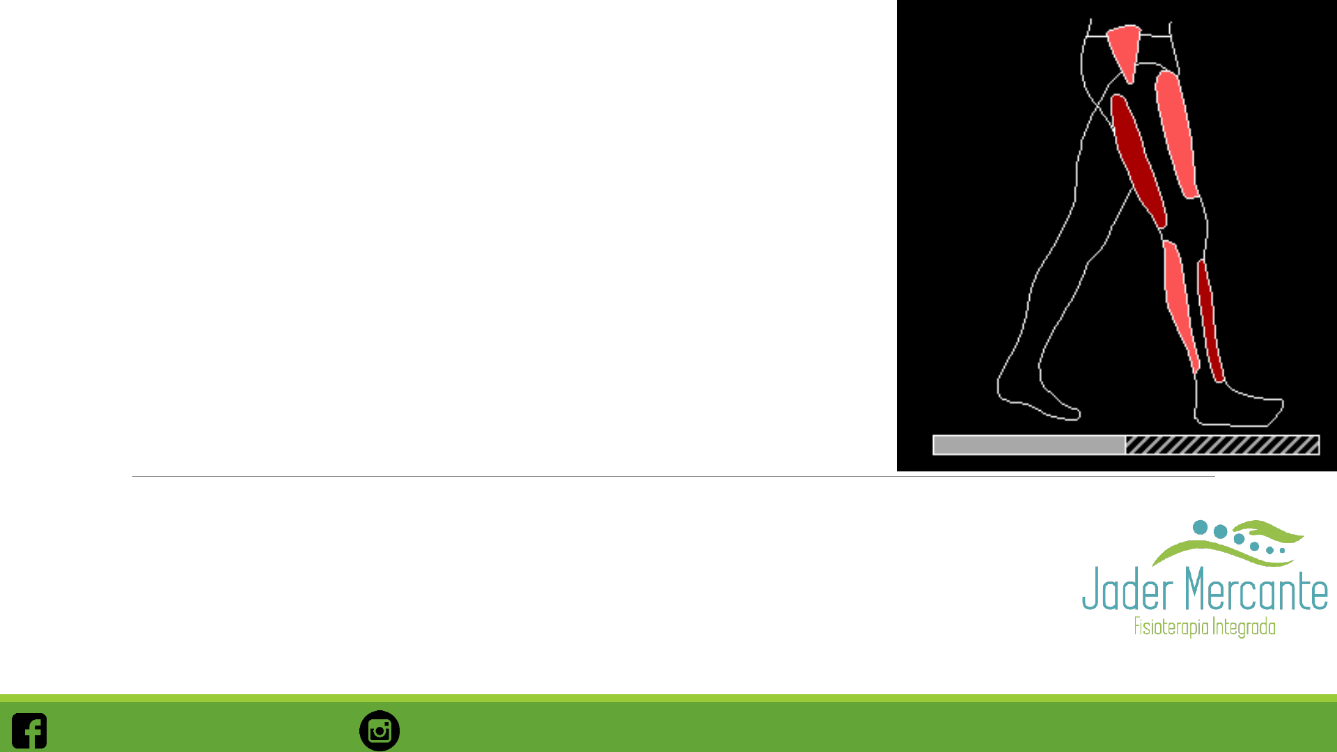 Ciclo da Marcha JADER IURY DE SOUZA MERCANTE FISIOTERAPEUTA @jadermercantefisioterapia @jadermercantefisio Definições Ciclo da marcha (C.M.) = passada – ocorre entre o momento em que um pé toca o solo e o momento em que esse mesmo pé toca o solo novamente. Comprimento da passada – distância percorrida durante o ciclo da marcha. Passo – metade de uma passada. Comprimento do passo – distância entre o toque do calcanhar de um pé no solo e o toque do calcanhar do outro pé no solo. Velocidade da caminhada/Cadência – número de passos por minuto. Caminhada lenta em média de 70 passos por min., caminha rápida pode-se alcançar 130 passos. Fases do Ciclo da Marcha Fase de Apoio – ocorre quando o pé está em contato com o solo. Começa quando o calcanhar de um pé toca o solo e termina quando esse pé sai (eleva- se) do solo. Constitui cerca de 60% do ciclo da marcha. Fase de Balanço – Ocorre quando o é não está em contato com o solo. Começa assim que o pé sai do solo e termina quando o calcanhar do mesmo pé toca o solo novamente. Constitui cerca de 40% do ciclo da marcha. As Três Atividades durante o C.M. Aceitação do Peso – inicio da fase de apoio, quando o pé toca o solo e o peso do corpo começa a ser transferido para esse membro inferior. Apoio em um Membro Inferior (MI) – quando o peso do corpo é totalmente transferido para o MI de apoio para que o outro membro possa se deslocar para frente. Avanço do MI - ocorre durante a fase de balanço. Períodos do C.M. Apoio Duplo – os dois pés estão em contato com o solo ao mesmo tempo. Apoio Simples – apenas um pé está em contato com o solo. Temos dois períodos de apoio simples no C.M. Uma vez quando o pé direito está o solo e o MIE movimenta-se para frente; depois, de novo, quando o pé esquerdo sustenta o peso e o MID movimenta-se para frente. Análise da Fase de Apoio É dividida em 5 fases: 1 – Toque do calcanhar 2 – Apoio completo do pé 3 – Apoio médio 4 – Saída (elevação) do calcanhar 5 – Saída dos dedos Impulso Toque do Calcanhar - Tornozelo em dorsiflexão; - Joelho levemente fletido para absorção parcial do choque quando o pé toca no solo; - Tronco ereto – assim permanece durante todo o ciclo; - Tronco roda para o lado homolateral, MS contralateral fica a frente; - MS homolateral está para trás em hiperextensão de ombro; - Peso do corpo começa a ser transferido para o MI de apoio. Apoio Completo do Pé - Dorsiflexão no tornozelo - aproximadamente 20° de flexão de joelho; - Coxofemoral se estende - possibilita que o restante do corpo alcance o MI que está de apoio - Transferência do peso para o MI de apoio continua; Apoio Médio - Ponto em que o corpo passa sobre o MI que sustenta o peso. - Os músculos flexores plantares começas a se contrair, controlando a velocidade de movimento da perna sobre o tornozelo; - Joelho e coxofemoral começam a se estender; - MMSS quase paralelos ao tronco; - Tronco sem rotação; Saída do Calcanhar - Flexão plantar – inicio da fase de impulso - Extensão quase total do joelho e hiperextesão da coxofemoral - Agora MI posiciona-se atrás do corpo. MS balança para frente e com flexão do ombro Saída dos Dedos - Dedos dos pés em hiperextensão (articulações metatarsofalangicas); - Cerca de 10° de flexão plantar e flexão de joelho e da coxofemoral; *Fim da fase de apoio e início da fase de balanço. Análise da Fase de Balanço Esta fase possui três momentos, que são feitos sem sustentação do peso. Aceleração - O MI está atrás do corpo e movendo-se; - Dorsiflexão do tornozelo; flexão do joelho e da coxofemoral – move o MI para frente; Balanço Médio - Mm. Dorsiflexores deixam o tornozelo em posição neutra; - Flexão de joelho e de coxofemoral – possibilitam a saída do pé do solo; - A continuidade da flexão de coxofemoral move o MI para frente do corpo. Desaceleração - Mm. Dorsiflexores ativos para manter o tornozelo pronto para o toque do calcanhar; - Extensão de joelho e contração excêntrica dos posteriores de coxa para desacelerar MI – Evita extensão brusca; - MI alcança o ponto máximo de balanço para frente e a coxofemoral continua fletida; *Fim do balanço médio e fim da desaceleração. Outros Determinantes da Marcha Deslocamento Vertical - Deslocamento mais ou menos de 5cm; - Ponto mais alto da fase de apoio médio, e mais baixo no toque do calcanhar no solo. Deslocamento Horizontal - Deslocamento máximo na fase de apoio simples durante o apoio médio; - Deslocamento laterolateral é de cerca de 5cm. Largura da Base da Marcha - 5 a 10cm Inclinação lateral da pelve – Sinal de Trendelenburg - Ocorre quando o MI deixa de sustentar o peso na fase de saída dos dedos do solo. -- Mm. abdutores da coxa do lado contralateral e mm. eretores da espinha homolaterais mantêm a pelve praticamente nivelada.