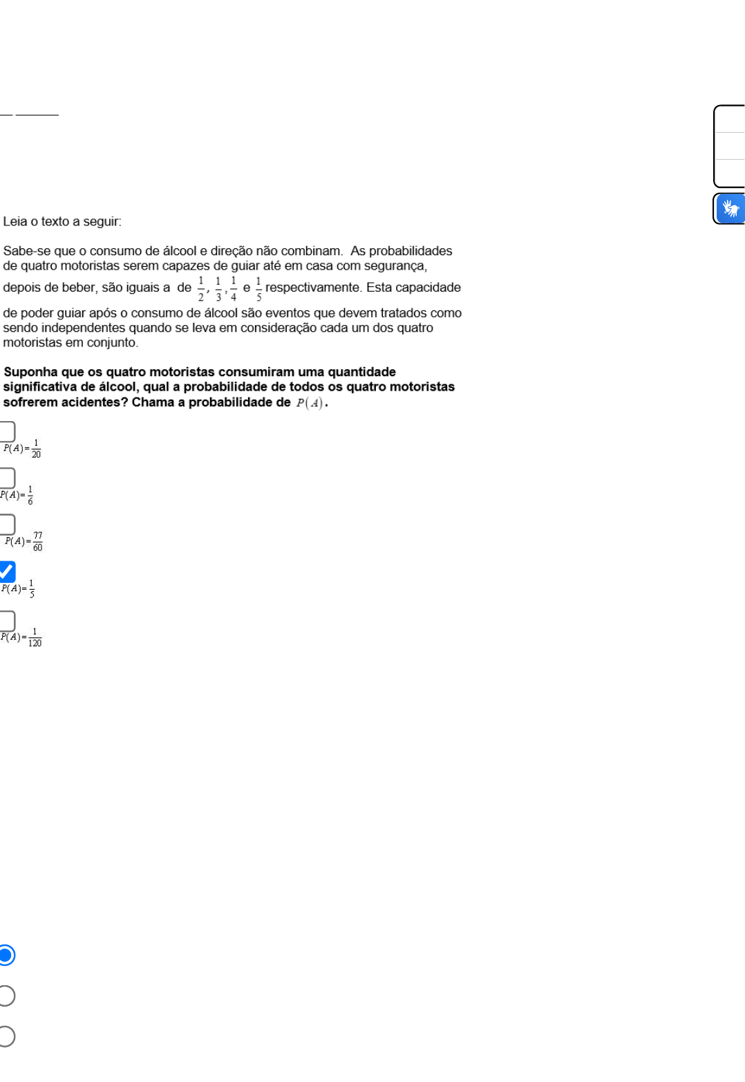 Atividade 2 Iniciado: 8 abr em 10:15 Instruções do teste Pergunta 1 0,2 pts Pergunta 2 0,2 pts Importante: Caso você esteja realizando a atividade através do aplicativo "Canvas Student", é necessário que você clique em "FAZER O QUESTIONÁRIO", no final da página. Leia o texto a seguir: A mediana é uma medida de localização do centro da distribuição dos dados. Após a ordenação dos elementos da amostra de dados, a mediana é o valor (pertencente ou não à amostra) que a divide ao meio, isto é, 50% dos elementos da amostra são menores ou iguais à mediana e os outros 50% são maiores ou iguais à mediana. Fonte: https://bibliotecadigital.ipb.pt/bitstream/10198/7325/1/estdescr.pdf>. Analise a situação proposta: Um grupo de 6 estudantes obteve as seguintes notas de exame numa escala de 0 a 10 pontos: 3,2,1,7,5,8. Considerando esse conjunto de dados e a mediana, assinale a opção correta: Que 50% das notas do exame, estão acima da nota 4 e 50% estão abaixo de 4. Que 50% das notas do exame, estão acima da nota 3 e 50% estão abaixo de 3. Que 50% das notas do exame, estão acima da nota 5 e 50% estão abaixo de 5. A+ A A- Pergunta 3 0,2 pts Pergunta 4 0,2 pts Que 50% das notas do exame, estão acima da nota 8 e 50% estão abaixo de 8. Que 50% das notas do exame, estão acima da nota 7 e 50% estão abaixo de 7. Leia o texto a seguir: As probabilidades que são atribuídas aos vários eventos dependem inicialmente do que já se conhece a respeito da situação experimental quando a atribuição é feita. Desse modo, as informações parciais relevantes para o resultado do experimento podem estar disponíveis e, assim, se faz necessário à revisão de alguns tipos de probabilidades. Por exemplo, para se determinar um evento A, usamos p(A), pois representa a probabilidade de A acontecer. A partir da definição clássica da probabilidade, a informação a seguir é passível de ser analisada a luz das demais definições de probabilidades, por exemplo, “um evento B ocorreu”, afeta a probabilidade de A. A expressão matemática do trecho acima é A+ A A- Pergunta 5 0,2 pts 66,66% aproximadamente. 60,32% aproximadamente. 30,15% aproximadamente. 40,25% aproximadamente. 45,12% aproximadamente. A+ A A- Salvo em 10:41 II e III I e III I e II III e IV I e IV Enviar teste A+ A A-