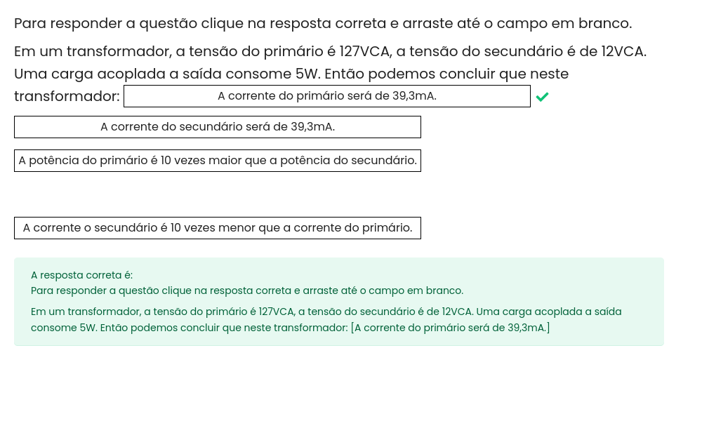 Em um transformador, a tensão do primário é 127VCA, a tensão do secundário é de 12VCA. Uma carga acoplada a saída consome 5W. Então podemos concluir que neste transformador: