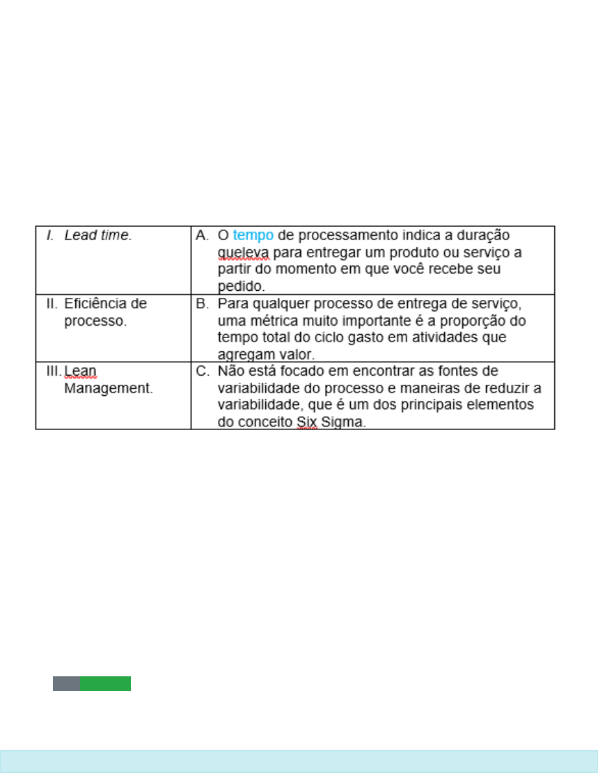 Manutenção na Indústria 4.0 Professor(a): Aristóteles Ramon Dias Couto Moreno (Especialização) Questão 3) Leia e associe as duas colunas: Assinale a alternativa que traz a associação correta entre as duas colunas Alternativas: • I – A; II – C; III – B. • I – C; II – A; III – B. • I – B; II – A; III – C. • I – A; II – B; III – C. checkCORRETO • I – C; II – B; III – A. Resolução comentada: o tempo de processamento indica quanto tempo leva para entregar um produto ou serviço a partir do momento em que você recebe seu pedido. Uma fórmula simples conhecida como Lei de Little (em homenagem ao matemático que a provou) ajuda a compreender os fatores que afetam o lead time. Para qualquer processo de entrega de serviço, uma métrica muito importante é a proporção do tempo total do ciclo gasto em atividades que agregam valor. Este indicador mostra simultaneamente a participação das perdas e é denominado eficiência do ciclo do processo. É a proporção do tempo para agregar valor ao lead time total. No conceito de Lean Management, os defeitos e inconsistências são reconhecidos como uma das principais fontes de perdas na empresa. Ao mesmo tempo, não considera métodos de controle estatístico de processos para eliminar desperdícios. O conceito de Lean Management não está focado em encontrar as fontes de variabilidade do processo e maneiras de reduzir a variabilidade, que é um dos principais elementos do conceito Six Sigma. Código da questão: 59809
