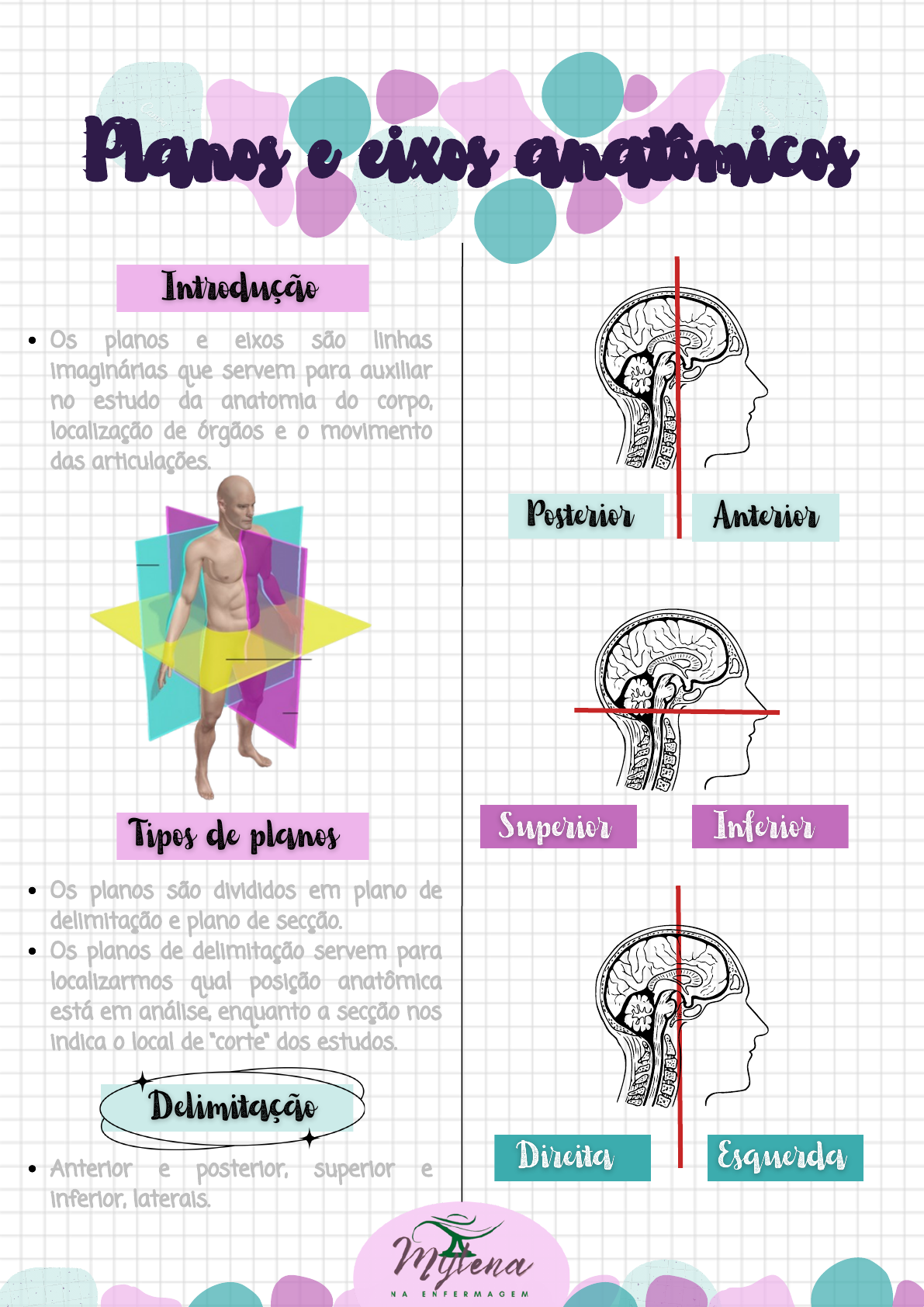 Os planos e eixos são linhas imaginárias que servem para auxiliar no estudo da anatomia do corpo, localização de órgãos e o movimento das articulações. Os planos e eixos são linhas imaginárias que servem para auxiliar no estudo da anatomia do corpo, localização de órgãos e o movimento das articulações. Planos e eixos anatômicosPlanos e eixos anatômicos Os planos são divididos em plano de delimitação e plano de secção. Os planos de delimitação servem para localizarmos qual posição anatômica está em análise, enquanto a secção nos indica o local de “corte“ dos estudos. Os planos são divididos em plano de delimitação e plano de secção. Os planos de delimitação servem para localizarmos qual posição anatômica está em análise, enquanto a secção nos indica o local de “corte“ dos estudos. Anterior e posterior, superior e inferior, laterais. Anterior e posterior, superior e inferior, laterais. 1 2 3 Superior: também chamado de cranial; Inferior: também chamado de podal. Superior: também chamado de cranial; Inferior: também chamado de podal. Anterior - também chamado de ventral; Posterior - também chamado de dorso. Anterior - também chamado de ventral; Posterior - também chamado de dorso. superiorsuperior inferiorinferior Lateral esquerdo; Lateral direito. Lateral esquerdo; Lateral direito. Sagital, coronal e transversal.Sagital, coronal e transversal. O corpo é dividido longitudinalmente, se separando em antímero esquerdo e antímero direito. Quando o corte não é feito exatamente ao meio, porém paralelo à ele, chamamos de plano Parassagital (paralelo ao sagital). O corpo é dividido longitudinalmente, se separando em antímero esquerdo e antímero direito. Quando o corte não é feito exatamente ao meio, porém paralelo à ele, chamamos de plano Parassagital (paralelo ao sagital). Súpero-inferior, ântero-posterior e látero-lateral. Súpero-inferior, ântero-posterior e látero-lateral. Chama-se assim para que lembremos de “coroa”, e assim saber que o corte será exatamente no meio da cabeça; Separa o corpo em anterior e posterior. Chama-se assim para que lembremos de “coroa”, e assim saber que o corte será exatamente no meio da cabeça; Separa o corpo em anterior e posterior. O corpo é dividido ao meio por um corte horizontal. separando a parte superior da inferior. O corpo é dividido ao meio por um corte horizontal. separando a parte superior da inferior. Súpero-superior: do crânio aos pés. Ântero-posterior: de frente para trás. Látero-lateral: de um lado para outro. Súpero-inferior+Plano transversal Súpero-inferior+Plano transversal Ântero-posterior+CoronalÂntero-posterior+Coronal Látero-lateral+SagitalLátero-lateral+Sagital