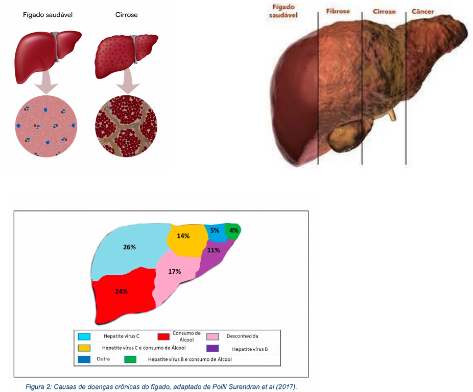 UC – MANIFESTAÇÕES ABDOMINAIS Problema 4- 1.Obj: Explicar a Cirrose Hepática: causas, fibrogênese (componentes e microscopia), diagnóstico, manifestações clinicas, evolução clinica e laboratorial (classificação de Child- Pugh) e complicações. CIRROSE A cirrose representa o estágio final das doenças que causam lesão hepática crônica. Independentemente da etiologia, na cirrose encontramos fibrose hepática, desorganização do parênquima hepático e nódulos de hepatócitos em regeneração envoltos por septos fibrosos. A cirrose é o estágio final de um processo crônico de agressão ao fígado e caracteriza-se pela substituição de tecido hepático normal por tecido fibroso e nódulos regenerativos. Fisiopatologia Na cirrose hepática temos deposição progressiva de matriz extracelular (tecido conjuntivo) no parênquima hepático. Após injúria hepática, a produção de matriz extracelular aumenta em 3 a 10 vezes. A agressão hepática crônica ativa as células estreladas (células que armazenam vitamina A), que são as principais produtoras de matriz extracelular. Outras células, como os fibroblastos portais, as células da medula óssea e os fibrócitos circulantes, também participam do processo de fibrogênese. A célula estrelada ativada passa a ter função de miofibroblasto, tendo função contrátil. Esse aumento da contratilidade contrai o parênquima hepático e comprime os sinusoides hepáticos, reduzindo o diâmetro do seu lúmen, contribuindo para o aumento da resistência vascular intra- hepática, aumentando assim a pressão porta. Com a progressão da fibrose hepática, há a formação dos nódulos de regeneração (tecido hepático lesado circundado por tecido fibrótico) e perda progressiva da função hepática. Os processos patogênicos centrais da cirrose consistem na deposição de matriz extracelular (colágeno I e III, proteoglicanos sulfatados e glicoproteínas), morte dos hepatócitos e reorganização vascular. A deposição de colágeno tipo I e III ocorre no espaço de Disse e é consequência da ativação das células estreladas hepáticas pela lesão. Essa deposição forma tratos septais fribróticos e é acompanhada pela perda das fenestrações das células endoteliais dos sinusoides hepáticos, impedindo a troca de solutos entre os hepatócitos e o plasma, uma vez que os sinusóides são responsáveis por realizar essa troca. Durante todo o processo de lesão hepática e fibrose, a regeneração dos hepatócitos sobreviventes é estimulada e estes se proliferam dando origem a nódulos esféricos circundados por septos fibrosos. O resultado é um fígado nodular e com muitas fibroses, com comprometimento severo do suprimento de sangue para os hepatócitos e da secreção de substâncias no plasma pelos hepatócitos. A degeneração da interface entre o parênquima e os tratos portais também pode obliterar os canais biliares, levando ao desenvolvimento de icterícia. Distúrbio hemodinâmico Na cirrose temos vasodilatação dos vasos esplâncnicos. Com essa dilatação, há grande sequestro de volume nesses vasos, com consequente redução do volume circulante efetivo e hipoperfusão periférica. Essa hipovolemia relativa ativa o sistema renina- angiotensina-aldosterona (SRAA) e o sistema nervoso simpático, além de estimular a liberação do hormônio antidiurético. Como consequência teremos aumento da retenção hidrossalina na tentativa de restaurar a volemia. O sequestro de volume no leito esplâncnico dilatado também contribui para o aparecimento da hipertensão porta, pois grande parte desse volume é drenado para o sistema porta, aumentando a pressão hidrostática nesse leito vascular. A desorganização do parênquima hepático, por deposição de tecido fibroso comprime os sinusoides hepáticos, aumentando a resistência vascular nesse leito vascular, aumentando a pressão porta. A hipertensão porta, causada por todos esses mecanismos, justifica o aparecimento da ascite, das varizes de esôfago, da esplenomegalia e do hiperesplenismo. A hipoalbuminemia, causada pela insuficiência hepática, também contribui para o aparecimento da ascite e do edema. Etiologia da cirrose A cirrose hepática pode ser causada por várias condições. As principais causas de cirrose são: hepatite C, doença hepática alcoólica e doença hepática gordurosa não alcoólica. Essas três condições respondem por 80% dos casos. As causas mais importantes de cirrose no mundo todo são o abuso de álcool, a hepatite viral e a esteato hepatite não alcoólica (EHNA). Outras etiologias incluem doença biliar e sobrecarga de ferro. A cirrose, como estágio final da doença hepática crônica. Classificação Classicamente, a cirrose é classificada em micronodular (nódulos < 3 cm), macronodular (nódulos > 3 cm) ou mista. Essa classificação tem sido abandonada, pois é inespecífica com relação à etiologia. Além disso, observa-se que a morfologia do fígado pode mudar com a evolução da doença, independentemente da etiologia, e comumente a cirrose micronodular evolui para macronodular. A fibrose é um processo dinâmico de deposição de colágeno e remodelagem. Nódulos parenquimatosos contendo hepatócitos circundados por fibrose, com diâmetros variando de muito pequenos (< 0,3 cm, micronódulos) a grandes (vários centímetros, macronódulos). A nodularidade resulta de ciclos de regeneração de hepatócitos e cicatrização. Desorganização da arquitetura de todo o fígado. A lesão parenquimatosa e consequente fibrose são difusas, estendendo- se por todo o fígado. Uma lesão focal sem cicatrização não constitui cirrose, o que vale também para uma transformação nodular difusa sem fibrose. As classificações de Child-Pugh avaliam o prognóstico e sobrevida dos pacientes: Na prática clínica são usados dois sistemas de classificação da gravidade da cirrose, são eles: classificação de Child-Pugh e o sistema 