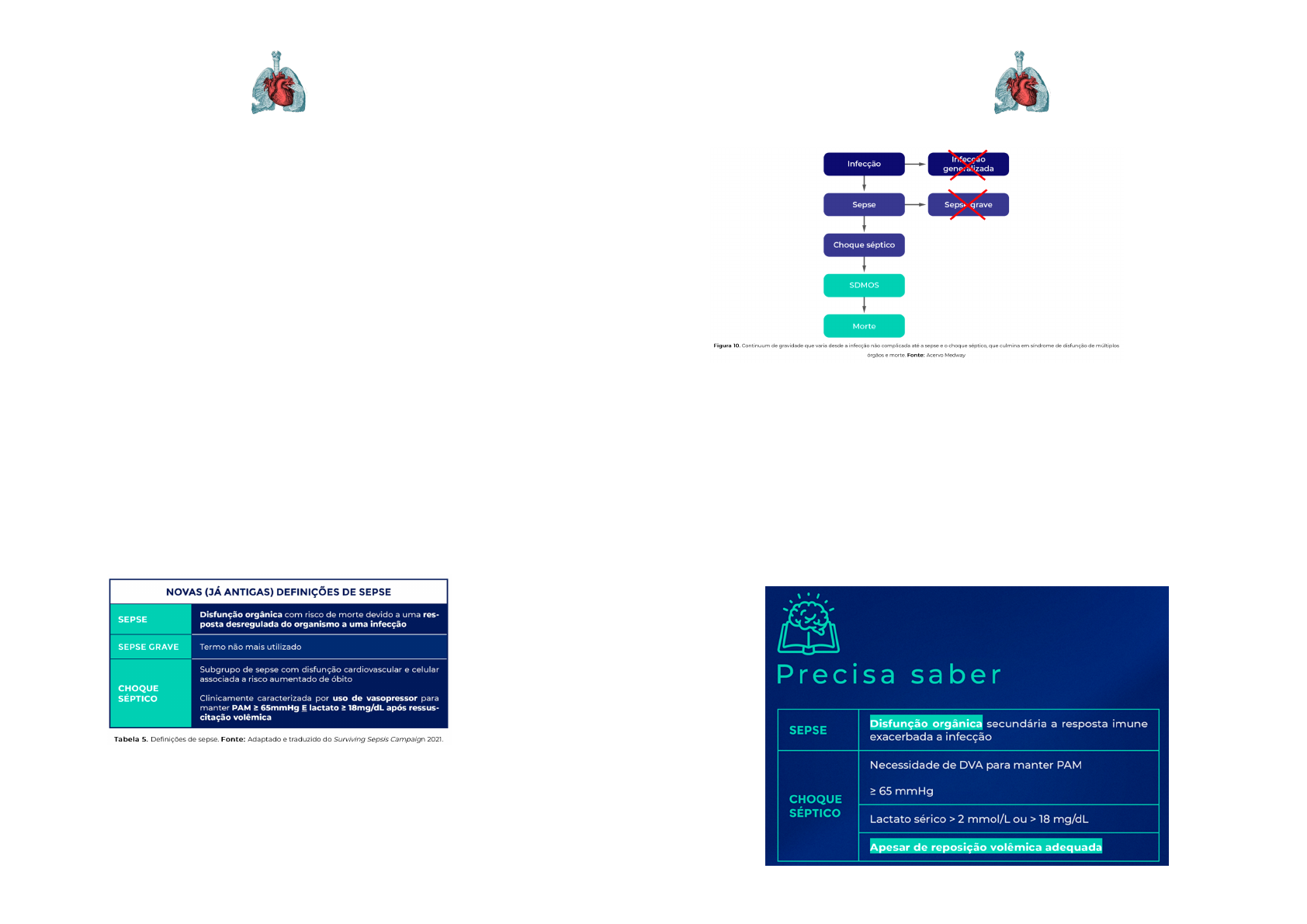 Sepse e Choque Séptico Introdução: Sepse é uma síndrome clínica caracterizada por alterações biológicas, fisiológicas e bioquímicas no hospedeiro, culminando em disfunção no funcionamento de órgãos e sistemas, secundária à resposta inflamatória desregulada a uma infecção. O foco da infecção pode estar localizado em apenas um órgão, como o pulmão; no entanto, é a resposta do organismo para combater o agente infeccioso que provoca uma resposta inflamatória sistêmica descontrolada, não regulada e autossustentável responsável pela lesão celular e disfunções orgânicas atribuídas à sepse. A sepse é uma das principais causas de mortalidade hospitalar tardia no país, superando infarto agudo do miocárdio e câncer. Fatores de risco para pior evolução incluem extremos de idade, doenças imunossupressoras, câncer, medicamentos imunossupressores, diabetes, abuso de álcool, cateteres venosos ou outras condições que envolvam integridade cutânea. Novas Definições: Se acredita que haja um continuum de gravidade que varia desde a infecção não complicada até a sepse e o choque séptico, que culmina em síndrome de disfunção de múltiplos órgãos e morte. Na mesma medida, o termo sepse grave também caiu por terra, visto que agora para ser sepse já precisa apresentar alguma disfunção orgânica. As novas recomendações ditam, ainda, que os critérios de SIRS não sejam mais utilizados para definir sepse como infecção com disfunção pelos novos conceitos. Mas podem ser utilizados para identificar infecção não complicada. SIRS seria diagnosticada com dois ou mais dos quatro critérios clínicos: temperatura corporal > 38ºC ou < 36ºC, frequência respiratória > 20 irpm ou pCO2 < 32, frequência cardíaca > 90 bpm e leucócitos > 12.000 células/mm³ ou < 4.000 células/mm³, que talvez sugiram uma resposta metabólica inflamatória a um insulto. Fisiopatologia: Existem quatro principais mecanismos envolvidos, sendo a imunidade inata e os mediadores inflamatórios, a hemostasia, imunossupressão e disfunção celular, tecidual e orgânica. IMUNIDADE INATA E MEDIADORES INFLAMATÓRIOS A primeira etapa no início da resposta hospedeira ao patógeno é a ativação das células imunes inatas, constituídas primariamente por macrófagos, monocitos, neutrófilos e células natural killers. Essa resposta é decorrente da interação de PAMPs (pathogen-associated molecular patterns) e DAMPs (damage-associated molecular patterns) com receptores específicos do corpo 3Rhumano, como TLRs (toll-like receptors), receptores de leptina tipo-C, receptores tipo NOD e receptores tipo RIG-1. Essa interação resulta na produção de citocinas pró-inflamatórias como TNF-alfa, IL-1 e IL-6. Elas causam ativação e proliferação de leucócitos, ativação do sistema complemento, aumento na adesão endotelial e expressão de quimiocinas, fatores teciduais e indução de agentes de resposta inflamatória aguda. Na sepse, há um exagero na produção dessa resposta imune, que resulta em danos colaterais e morte de patógenos e de tecidos. HEMOSTASIA Na sepse, há uma intersecção entre a via inflamatória e a hemostática, que simultaneamente leva à ativação de ambas. O espectro dessa interação pode variar de plaquetopenia leve à coagulação intravascular disseminada (CIVD). O estado de hipercoagulabilidade da sepse é acreditado ser decorrência de liberação do fator tecidual pelo endotélio danificado (além de monócitos e células polimorfonucleares). O fator tecidual, então, causa ativação sistêmica da cascata de coagulação (levando à produção de trombina), ativação de plaquetas e formação de trombos de fibrina. Esses microtrombos podem causar alterações de perfusão local que podem resultar em hipóxia tecidual e disfunção orgânica. Além do descrito estado pró-coagulante, há depressão do efeito anticoagulante da proteína C e da antitrombina. Em pacientes com inflamação sistêmica severa, há redução dos níveis de proteína C, downregulation da trombomodulina e baixos níveis de proteína S, que perpetuam a propagação desregular da cascata de coagulação. Além disso, há, ainda, a redução da fibrinólise com o aumento de TNF-alfa e IL-1B, o que faz com o ativador de plasminogênio tecidual é liberado pelo endotélio, levando a um aumento sustentado de inibidor do ativador de plasminogênio tipo 1 (PAI-1) que supera o aumento na ativação de plasmina. IMUNOSSUPRESSÃO O estado inicial pró-inflamatório é geralmente seguido por um prolongado estado de imunossupressão. Há redução nos níveis de T cells (helper e citotóxico), como resultado de apoptose e resposta reduzida às quimiocinas. Isso sugere que o sistema imune no paciente séptico é incapaz de estabelecer uma resposta imune efetiva secundária às infecções bacterianas, virais ou fúngicas. Estudos sugerem inclusive que a severidade da linfopenia é um biomarcador de imunossupressão da sepse, predizendo mortalidade em 28 dias e 1 ano. DISFUNÇÃO CELULAR, TECIDUAL E ORGÂNICA O mecanismo trata-se de desequilíbrio no DO2 e VO2 como resultado da hipoperfusão. A hipoperfusão se dá em consequência da disfunção cardiovascular, que é vista na sepse. A incidência de cardiomiopatia por sepse varia de 18 a 60% em casuísticas. Acredita-se ser em decorrência das citocinas, como TNF alfa e IL-1B, que podem causar depressão dos miócitos cardíacos e interferência em sua função mitocondrial, levando à cardiomiopatia aguda e reversível. Ademais, à redução da fração de ejeção do VE associa-se à normal ou às reduzidas pressões de enchimento ventricular com o aumento da complacência do VE. As evidências mostram disfunção sistólica e diastólica com redução do volume sistólico e aumento da pressão no final da diástole e no final da sístole. A hipotensão e o choque distributivo são consequências da ação inflamatória na vaso