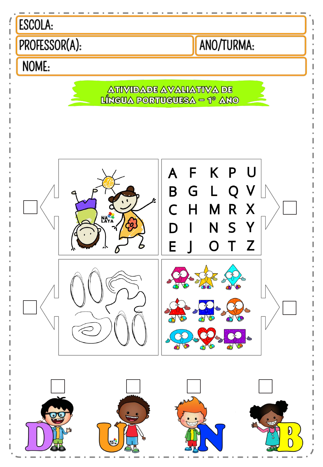 PARA RESPONDER A AVALIAÇÃO, PINTE O QUADRINHO DA ALTERNATIVA CORRETA EM CADA QUESTÃO. ONDE APARECEM LETRAS. ONDE APARECE A LETRA QUE VOCÊ OUVIU. VEJA A FIGURA ABAIXO: QUAL É A FIGURA QUE TEM O NOME COM A PRIMEIRA SÍLABA (PEDAÇO) IGUAL À DO NOME DA FIGURA QUE VOCÊ VIU? QUAL É O NOME DESSA FIGURA? CAMISA CAVALO VEJA A FIGURA ABAIXO: SACOLA SAPATO ONDE APARECEM AS LETRAS QUE VOCÊ OUVIU. 1 2 ATENÇÃO A PALAVRA QUE VOU FALAR! QUANTAS SÍLABAS (PEDAÇOS) TEM A PALAVRA QUE VOCÊ OUVIU? 3 4 VEJA A FIGURA ABAIXO. QUAL É O NOME DESSA FIGURA? BALINHA FARINHA GALINHA GATINHA ONDE AS LETRAS APARECEM EM ORDEM ALFABÉTICA. ONDE APARECEM NÚMEROS. VEJA O QUE O MENINO ESTÁ SEGURANDO. PINTE A ALTERNATIVA DA FIGURA QUE O NOME COMEÇA COM A PRIMEIRA LETRA DO NOME DA FIGURA QUE VOCÊ VIU. VEJA A FIGURA ABAIXO. 1 2 3 4 QUANTAS SÍLABAS (PEDAÇOS) TEM O NOME DESSA FIGURA? ATENÇÃO A PALAVRA QUE EU VOU DIZER. QUANTAS SÍLABAS (PEDAÇOS) TEM A PALAVRA QUE VOCÊ OUVIU? 1 2 3 4 QUAL É A FIGURA QUE O NOME TEM A LETRA “F” COM O MESMO SOM DE FELIPE? OUÇA O TEXTO. QUAL É A PALAVRA QUE DÁ NOME À IMAGEM ? MACIO MATRIZ NARIZ NAVIO QUANTAS SÍLABAS (PEDAÇOS) TEM A PALAVRA? 1 2 3 4 HABILIDADES BNCC EXPLORADAS (EF01LP01) - Reconhecer que textos são lidos e escritos da esquerda para a direita e de cima para baixo da página. (EF01LP05) - Reconhecer o sistema de escrita alfabética como representação dos sons da fala. (EF01LP06) - Segmentar oralmente palavras em sílabas. (EF01LP07) - Identificar fonemas e sua representação por letras. (EF01LP08) - Relacionar elementos sonoros (sílabas, fonemas, partes de palavras) com sua representação escrita. (EF01LP09) - Comparar palavras, identificando semelhanças e diferenças entre sons de sílabas iniciais. (EF01LP11) - Conhecer, diferenciar e relacionar letras em formato imprensa e cursiva, maiúsculas e minúsculas. (EF01LP12) - Reconhecer a separação das palavras, na escrita, por espaços em branco. (EF01LP13) - Comparar palavras, identificando semelhanças e diferenças entre sons de sílabas mediais e finais. (EF12LP01) - Ler palavras novas com precisão na decodificação, no caso de palavras de uso frequente, ler globalmente, por memorização. (EF12LP19) - Reconhecer, em textos versificados, rimas, sonoridades, jogos de palavras, palavras, expressões, comparações, relacionando-as com sensações e associações. TERMOS DE USO DESSE MATERIAL Você está recebendo o material: DIAGNÓSTICA LÍNGUA PORTUGUESA - 1° ANOS. Este material foi elaborado pelas Professoras Camila Castro e Kátia Crescencio do @pedagogianalata. A utilização deste material é apenas para USO PESSOAL. Professores e Pais podem imprimir para utilizar em sua sala de aula, com seus estudantes, ou em casa com seus filhos. O QUE NÃO PODE: ❖ Não pode vender ou revender este material; ❖ Não pode postar ou distribuir em nenhum site na internet; ❖ Não pode distribuir em grupos de Facebook, WhatsApp ou Telegram ❖ Não pode arquivar publicamente em drives ou outros semelhantes de forma pública para que outras pessoas possam ter acesso. DIREITOS DE IMAGENS Todos os direitos de imagens são de seus autores especificados abaixo: NÃO É PERMITIDO qualquer uso comercial deste material. MATERIAL PROTEGIDO PELOS DIREITOS AUTORAIS CONFORME A LEI Nº 9.610, DE 19 DE FEVEREIRO DE 1998. EVITE PROBLEMAS JURÍDICOS.