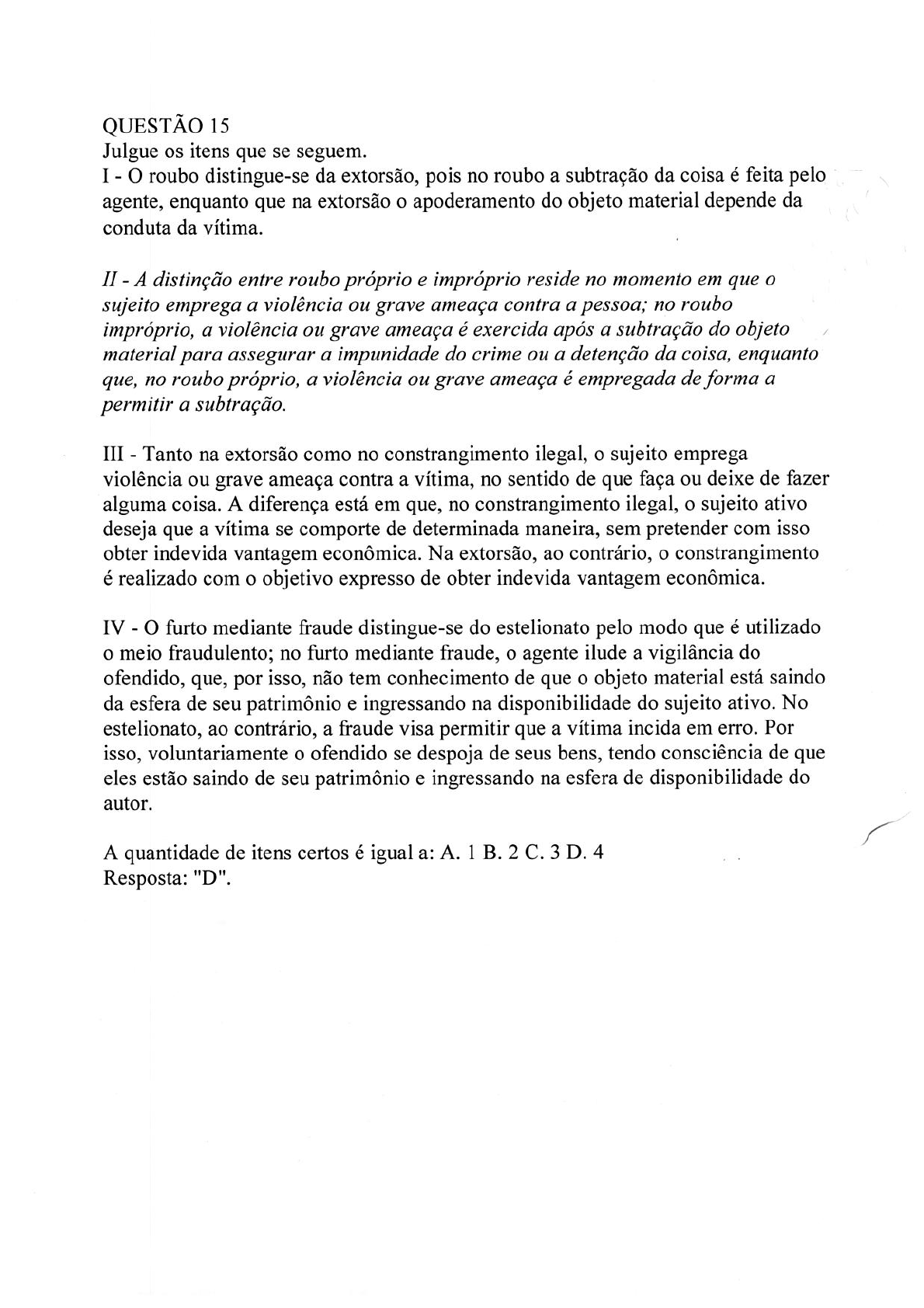 QUESTÃO 15 Julgue os itens que se seguem. I - O roubo distingue-se da extorsão, pois no roubo a subtração da coisa É feita pelo agente, enquanto que na extorsão o apoderamento do objeto material depende da conduta da vítima. _ H - A distinção entre roubo próprio e impróprio reside rio momertto em que o sujeito emprega a violência ou grave ameaça comra a pessoa; no roubo impróprio, a violência ou grave ameaça É exercida após a subtração do objeto material para assegurar a impunidade do crime ou a detenção da coisa, enquanto que, no roubo próprio, a violência ou grave ameaça é empregada deforma a permitir a subtração. III - Tanto na extorsão como no constrangimento ilegal, o sujeito emprega violência ou grave ameaça contra a vitima, no sentido de que faça ou deixe de fazer alguma coisa. A diferença está em que, no constrangimento ilegal, o sujeito ativo deseja que a vítima se comporte de determinada maneira, sem pretender com isso obter indevida vantagem econômica. Na extorsão, ao contrário, o constrangimento é realizado com o objetivo expresso de obter indevida vantagem econômica. IV - O furto mediante fraude distingue-se do estelionato pelo modo que é utilizado o meio fraudulento; no furto mediante fraude, o agente ilude a vigilância do ofendido, que, por isso, não tem conhecimento de que o objeto material está saindo da esfera de seu patrimônio e ingressando na disponibilidade do sujeito ativo. No estelionato, ao contrário, a fraude visa permitir que a vítima incida em erro. Por isso, voluntariamente o ofendido se despoja de seus bens, tendo consciência de que eles estão saindo de seu patrimônio e ingressando na esfera de disponibilidade do autor. A quantidade de itens certos é igual a: A. 1 B. 2 C. 3 D. 4 Resposta: "D".