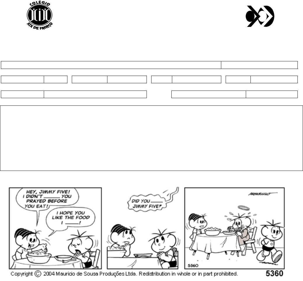 1ª PS / Inglês / Débora / 8º / Pág. 1 2012 1ª PROVA SUBSTITUTIVA DE INGLÊS Aluno(a): Nº Ano: 8º Turma: Data: Nota: Professor(a): Débora Toledo Valor da Prova: 65 pontos Orientações gerais: 1) Número de questões desta prova: 17 2) Valor das questões: Abertas (9): 5,0 pontos cada. Fechadas (8): 2,5 pontos cada. 3) Provas feitas a lápis ou com uso de corretivo não têm direito à revisão. 4)Aluno que usar de meio ilícito na realização desta prova terá nota zerada e conceituação comprometida. 5) Tópicos desta prova: - Simple Past - Reflexive Pronouns 1ª Questão: Complete os espaços da tirinha com verbos no Simple Past e assinale a opção correta. a) know – made – call b) knew – make – called c) know – made – called d) knew – made – called e) know – make – call 2ª Questão: Passe as frases abaixo para a afirmativa, negativa ou interrogativa conforme indicado. a) Did you call her last night? Aff.: __________________________________________________________________. b) The President sold his plans to the enemies. Neg.: __________________________________________________________________. c) My parents didn’t speak to those people yesterday. Int.: ________________________________________________________________? d) They didn’t spend so much money. Aff.: _________________________________________________________________. COLÉGIO XIX DE MARÇO excelência em educação 1ª PS / Inglês / Débora / 8º / Pág. 2 3ª Questão: Escolha a alternativa que completa as frases. The teacher ______________ made this wonderful test for us. Margareth and Paul ____________________ returned the ugly gift to their friends. We all worked on that wonderful painting ________________. a) themselves – himself - themselves b) himself – themselves – ourselves c) yourself – themselves – ourselves d) itself – ourselves – themselves e) himself – yourselves - ourselves 4ª Questão: Complete o texto com os verbos dados no Simple Past: Shocking news Grandma (to be)_______________ ninety years old when she (to win) _______________ two million dollars on the lottery. Our family was extremely worried about her heart and nobody (to want) __________________ to tell her the news. “I think we can call in Dr. Jones to tell her the news”, suggested my father. The doctor soon (to arrive) __________________ and we (to explain) _________________ the situation to him. “You don´t have to worry about anything”, said Dr. Jones. The doctor (to go) _________________ in to see the old lady and gradually started the conversation about the money. “Tell me: What would you do if you won a fortune on the lottery – say two million dollars?” “I would give half of it to you, naturally”, answered grandma. The doctor (to fall) ____________________ down dead with shock. Vocabulary: worried: preocupado; news: notícias; to worry: preocupar-se; half: metade; to fall: cair; dead: morto 5ª Questão: Assinale a afirmação incorreta, de acordo com o texto da quarta questão. a) A família estava preocupada em dar a notícia para a avó. b) A família chamou um médico para dar a notícia. c) A avó disse ao médico que daria metade do prêmio a ele. d) A avó não aguentou tanta emoção e morreu ao saber do prêmio da loteria. e) O médico se surpeendeu com a generosidade da avó e quem acabou morrendo foi ele. 6ª Questão: You and Joe ______________ sent the invitations to our friends. a) yourself b) yourselves c) himself d) themselves e) ourselves 7ª Questão: Leia o texto abaixo e responda às perguntas em Português: Martin Luther King Martin was born in Atlanta, Georgia on January 15, 1929. He believed all people had the right to freedom and equality. Martin Luther King didn`t believe in violence. He worked and studied hard in school. His goal was to make the world a better place to live. While at college, Martin studied about a man named Gandhi. When Dr. King became the pastor, he became active in civil rights. In 1963, over 250,000 people marched in Washington, D.C. where Dr. King gave his most famous speech, “I Have a Dream.” On the morning of April 4, 1968. Martin Luther King was assassinated. He was just thirty-nine years old. Vocabulary: right: direito; freedom: liberdade; goal: objetivo; march: marchar; speech: discurso 1ª PS / Inglês / Débora / 8º / Pág. 3 a) Quando e onde Martin Luther King nasceu? _____________________________________________________________________________ b) Qual era sua ocupação? ______________________________________________________________________________ c) Em que Martin Luther King acreditava? ______________________________________________________________________________ d) Qual o nome de seu famoso discurso? ______________________________________________________________________________ e) O que aconteceu em 1968? ______________________________________________________________________________ 8ª Questão: Sobre o texto da questão 7, responda usando short answers. a) Was Martin L. King assassinated? _________________________________________ b) Did Martin L. King believe in violence? _____________________________________ c) Did people march in 1963? ______________________________________________ d) Was Martin born in Washington, D.C.? _____________________________________ 9ª Questão: Os verbos que completam o dialogo abaixo são: Anna: Hi, Paul! How are you doing? Paul: Good. I`m worried because I failed the Maths test. It _________ a very important test. Anna: _______ you ________ to the teacher? Paul: Well, I __________ to do it, but he __________ really busy. I will talk to him later. Anna: I hope you can get a better score next time. a) was – did – talk – tried – was b) were – did – talk – tried – were c) was – did – talked – try – was d) was – did – talk – tried – were e) were – do – talk – tried - was 10ª Questão: Complete as frases com Reflexive Pronouns. a) Did you look at