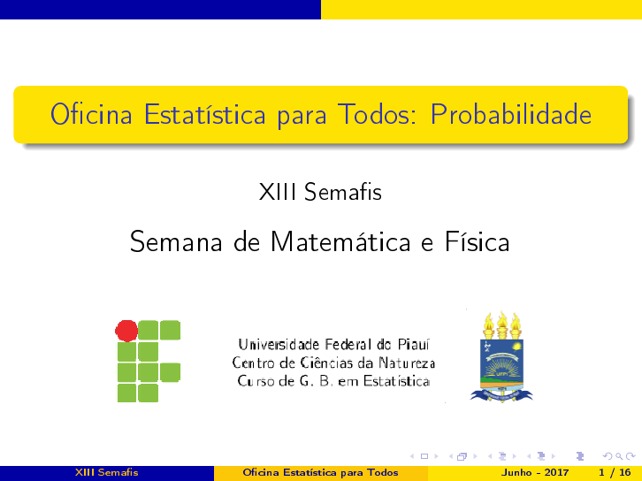 . . . . . . . . . . . . . . . . . . . . . . . . . . . . . . . . . . . . . . . . O�cina Estatística para Todos: Probabilidade XIII Sema�s Semana de Matemática e Física XIII Sema�s O�cina Estatística para Todos Junho - 2017 1 / 16 . . . . . . . . . . . . . . . . . . . . . . . . . . . . . . . . . . . . . . . . 1 O�cina 2 Conclusão XIII Sema�s O�cina Estatística para Todos Junho - 2017 2 / 16 . . . . . . . . . . . . . . . . . . . . . . . . . . . . . . . . . . . . . . . . O�cina O�cina Probabilidade Há várias maneiras de se medir a incerteza e é costume se pensar na seguinte divisão: método clássico, método frequentista e método subjetivo. O primeiro é o mais conhecido, e relaciona eventos favoráveis com eventos possíveis. O segundo é baseado em repetições de um experimento em grande número de vezes e o último é baseado na opinião pessoal. XIII Sema�s O�cina Estatística para Todos Junho - 2017 3 / 16 . . . . . . . . . . . . . . . . . . . . . . . . . . . . . . . . . . . . . . . . O�cina O�cina Situação Peguem uma moeda do próprio bolso (ou bolsa) olhem bem e digam se é �honesta� ou não! Como você poderia sugerir caminhos para buscar esta resposta? XIII Sema�s O�cina Estatística para Todos Junho - 2017 4 / 16 . . . . . . . . . . . . . . . . . . . . . . . . . . . . . . . . . . . . . . . . O�cina Descrição da Atividade Passo 1 Agrupem-se 2 a 2 e peguem uma moeda - chamem o valor numérico da moeda de COROA (C ) e a outra face de CARA (C). Suponham que haja interesse em saber se a sua moeda é �honesta� (isto signi�ca saber se a probabilidade de CARA de sua moeda é 1/2 ou, em termos percentuais, se a probabilidade de sair CARA é 50%. XIII Sema�s O�cina Estatística para Todos Junho - 2017 5 / 16 . . . . . . . . . . . . . . . . . . . . . . . . . . . . . . . . . . . . . . . . O�cina Descrição da Atividade Passo 2 Um membro do grupo vai lançar a moeda e o outro vai marcar os resultados na planilha anexa, seguindo as seguintes instruções: a) Jogar a moeda uma vez e anotar C ou C no espaço adequado (linha 2) da planilha. b) Repetir este procedimento 30 vezes, preenchendo um a um todos os espaços da linha 2. XIII Sema�s O�cina Estatística para Todos Junho - 2017 6 / 16 . . . . . . . . . . . . . . . . . . . . . . . . . . . . . . . . . . . . . . . . O�cina Descrição da Atividade Passo 3 Continuando com a planilha, trocar de lugar com o parceiro, voltar para os itens a) e b) das instruções e continuar mais 30 jogadas - até perfazer 60. XIII Sema�s O�cina Estatística para Todos Junho - 2017 7 / 16 . . . . . . . . . . . . . . . . . . . . . . . . . . . . . . . . . . . . . . . . O�cina Descrição da Atividade Passo 4 Voltar ao primeiro da dupla e, ainda com a planilha, seguir as instruções: c) Depois do registro na linha 2) de todos os resultados como C ou C , passar para a linha 3): chamar CARA de 1 e COROA de 0 e colocar estes valores na planilha, abaixo de cada resultado já obtido na linha 2). Cada membro do grupo deve fazer metade - um faz a linha de cima e o outro a linha de baixo. XIII Sema�s O�cina Estatística para Todos Junho - 2017 8 / 16 . . . . . . . . . . . . . . . . . . . . . . . . . . . . . . . . . . . . . . . . O�cina Descrição da Atividade Passo 5 d) Agora a linha 4) da planilha deve ser preenchida - em cada posição deve ser colocado o número acumulado de CARAS, até aquela jogada (veri�que que a jogada está explicitada na linha 1- que é a linha n). Discutir com outro membro do grupo para ver se está claro - se não, pergunte! A linha de baixo é continuação do acumulado da linha de cima. XIII Sema�s O�cina Estatística para Todos Junho - 2017 9 / 16 . . . . . . . . . . . . . . . . . . . . . . . . . . . . . . . . . . . . . . . . O�cina Descrição da Atividade Passo 6 e) Finalmente chegamos à última linha - linha 5): colocar a frequência relativa (m/n) de CARAS em cada momento - o que é isto Discuta com o outro membro do grupo (desprezar as entradas assinaladas com X). XIII Sema�s O�cina Estatística para Todos Junho - 2017 10 / 16 . . . . . . . . . . . . . . . . . . . . . . . . . . . . . . . . . . . . . . . . O�cina Descrição da Atividade Passo 7 Depois de completar a 1a parte da planilha, construir a seguinte tabela, usando as linhas 4) e 5) da planilha: XIII Sema�s O�cina Estatística para Todos Junho - 2017 11 / 16 . . . . . . . . . . . . . . . . . . . . . . . . . . . . . . . . . . . . . . . . O�cina Descrição da Atividade Passo 8 Completar o grá�co anexo (página seguinte à da planilha), usando os valores da tabela recém construída, do seguinte modo: XIII Sema�s O�cina Estatística para Todos Junho - 2017 12 / 16 . . . . . . . . . . . . . . . . . . . . . . . . . . . . . . . . . . . . . . . . O�cina XIII Sema�s O�cina Estatística para Todos Junho - 2017 13 / 16 . . . . . . . . . . . . . . . . . . . . . . . . . . . . . . . . . . . . . . . . O�cina Descrição da Atividade Passo 9 Comparar os resultados com os colegas e interpretar o resultado comentando sobre a �honestidade� da sua moeda. XIII Sema�s O�cina Estatística para Todos Junho - 2017 14 / 16 . . . . . . . . . . . . . . . . . . . . . . . . . . . . . . . . . . . . . . . . Conclusão Probabilidade Frequentista Probabilidade é o valor em que a frequência relativa se estabiliza após um número muito grande de ensaios. XIII Sema�s O�cina Estatística para Todos Junho - 2017 15 / 16 . . . . . . . . . . . . . . . . . . . . . . . . . . . . . . . . . . . . . . . . Conclusão XIII Sema�s O�cina Estatística para Todos Junho - 2017 16 / 16 Oficina Conclusão