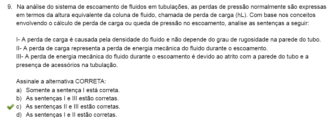 Na análise do sistema de escoamento de fluidos em tubulações, as perdas de pressão normalmente são expressas em termos da altura equivalente da coluna de fluido, chamada de perda de carga (hL). Com base nos conceitos envolvendo cálculo de perda de escoamento, analise as sentenças a seguir: A perda de carga é causada pela densidade do fluido e não depende do grau de rugosidade na parede do tubo. II- A perda de carga representa a perda de energia mecânica do fluido durante escoamento. III- A perda de energia mecânica do fluido durante escoamento é devido ao atrito com a parede do tubo e a presença de acessórios na tubulação. Assinale a alternativa CORRETA: