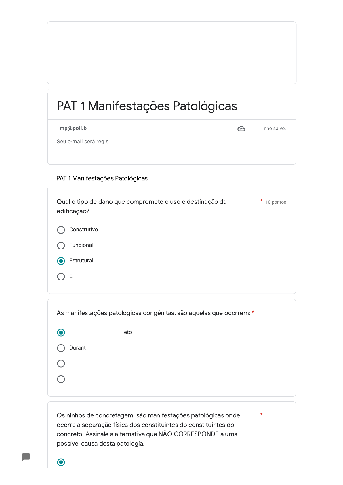 13/07/2022 07:40 PAT 1 Manifestações Patológicas https://docs.google.com/forms/d/e/1FAIpQLSfwS6rZxx8PhUBkYrOm2yVP7PyeH53H6L7Qs5JkUiJaZWRBaQ/formResponse 1/5 PAT 1 Manifestações Patológicas 10 pontos Construtivo Funcional Estrutural Estético 10 pontos Durante a fase de projeto Durante a execução da obra. Ao longo da vida da estrutura, devido a agressividade do meio. Ao longo da vida da estrutura devido a fenômenos atípicos. 10 pontos Carência de armaduras PAT 1 Manifestações Patológicas vmp@poli.br Alternar conta Rascunho salvo. Seu e-mail será registrado quando você enviar este formulário. *Obrigatório Qual o tipo de dano que compromete o uso e destinação da edificação? * As manifestações patológicas congênitas, são aquelas que ocorrem: * Os ninhos de concretagem, são manifestações patológicas onde ocorre a separação física dos constituintes do constituintes do concreto. Assinale a alternativa que NÃO CORRESPONDE a uma possível causa desta patologia. * https://accounts.google.com/AccountChooser?continue=https://docs.google.com/forms/d/e/1FAIpQLSfwS6rZxx8PhUBkYrOm2yVP7PyeH53H6L7Qs5JkUiJaZWRBaQ/formResponse&service=wise 13/07/2022 07:40 PAT 1 Manifestações Patológicas https://docs.google.com/forms/d/e/1FAIpQLSfwS6rZxx8PhUBkYrOm2yVP7PyeH53H6L7Qs5JkUiJaZWRBaQ/formResponse 2/5 Adensamento inadequado Trabalhabilidade inadequada Elevada altura de lançamento 10 pontos VVFV FVVF VFFV VVVV 10 pontos A degradação ocorre de maneira lenta, mediante processos predominantemente mecânicos. A degradação ocorre de maneira lenta, mediante processos predominantemente físicos. A degradação ocorre de maneira rápida, mediante processos predominantemente mecânicos. A degradação ocorre de maneira rápida, mediante processos predominantemente físicos. Responda V ou F para as afirmações a seguir: * Com relação ao efeito dos óleos minerais no concreto, é possível afirmar que: * 13/07/2022 07:40 PAT 1 Manifestações Patológicas https://docs.google.com/forms/d/e/1FAIpQLSfwS6rZxx8PhUBkYrOm2yVP7PyeH53H6L7Qs5JkUiJaZWRBaQ/formResponse 3/5 10 pontos flechas excessivas, polimento do concreto, eflorescência, ninhos de concretagem, corrosão das armaduras polimento do concreto, eflorescência, ninhos de concretagem, corrosão das armaduras, deslocamento de revestimento. eflorescência, ninhos de concretagem, corrosão das armaduras, deslocamento de revestimento, flechas excessivas deslocamento de revestimento, flechas excessivas, polimento do concreto, eflorescência, ninhos de concretagem. 10 pontos Os problemas patológicos causados por deficiências ou erros na colocação das armaduras são das mais diversas ordens e ocorrem com frequência muito baixa. A ação do anidrido carbônico (CO2 ) presente na atmosfera manifesta-se pelo transporte deste para dentro dos poros do concreto, o que implica a carbonatação do concreto. Alguns constituintes do cimento podem ser expansivos, o que pode fazer com que o concreto também o seja, ocasionando a sua fissuração e o desenvolvimento de problemas patológicos na estrutura. Ao método de concretagem, estão relacionadas, entre outras causas, as falhas no transporte, no lançamento e no adensamento do concreto. Sintomas patológicos são lesões, danos, efeitos ou manifestações patológicas, podem ser descritos e classificados, orientando um primeiro diagnóstico. São sintomas: * Com relação às informações sobre as causas de deterioração de estruturas de concreto, assinale a alternativa INCORRETA: * 13/07/2022 07:40 PAT 1 Manifestações Patológicas https://docs.google.com/forms/d/e/1FAIpQLSfwS6rZxx8PhUBkYrOm2yVP7PyeH53H6L7Qs5JkUiJaZWRBaQ/formResponse 4/5 10 pontos VVVV FVVF FVFV VVFV Opção 5 10 pontos em depósitos cristalinos de cor branca que surgem na superfície do revestimento, como piso, paredes e tetos. na separação dos materiais componentes, e ocorre, por exemplo, com misturas de concreto por excesso de vibração durante o adensamento. na falta de aderência do revestimento à base. na redução de volume que ocorre na massa de concreto devido à perda de água excedente da mistura pelo processo de evaporação 10 pontos Utilizar pinturas com fungicidas Ventilação adequada E it i t d ú id Analise as afirmativas a seguir e classifique-as em V ou F: * Numa obra, surgem ocasionalmente algumas patologias. Entre essas, cita-se a Eflorescência que consiste: * Todas essas são medidas de prevenção ao surgimento de bolor e vegetação, EXCETO: * 13/07/2022 07:40 PAT 1 Manifestações Patológicas https://docs.google.com/forms/d/e/1FAIpQLSfwS6rZxx8PhUBkYrOm2yVP7PyeH53H6L7Qs5JkUiJaZWRBaQ/formResponse 5/5 Evitar pinturas em paredes úmidas Priorizar materiais higroscópicos em regiões de umidade Página 2 de 2 Nunca envie senhas pelo Formulários Google. Este formulário foi criado em Escola Politécnica de Pernambuco. Denunciar abuso Voltar Enviar Limpar formulário Formulários https://docs.google.com/forms/u/0/d/e/1FAIpQLSfwS6rZxx8PhUBkYrOm2yVP7PyeH53H6L7Qs5JkUiJaZWRBaQ/reportabuse?source=https://docs.google.com/forms/d/e/1FAIpQLSfwS6rZxx8PhUBkYrOm2yVP7PyeH53H6L7Qs5JkUiJaZWRBaQ/viewform https://www.google.com/forms/about/?utm_source=product&utm_medium=forms_logo&utm_campaign=forms