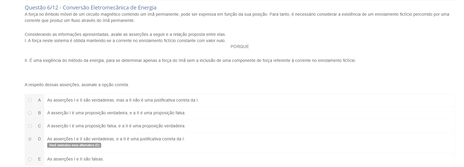 A força no êmbolo móvel de um circuito magnético contendo um permanente, pode ser expressa em função da sua posição. Para tanto, é necessário considerar a existência de um enrolamento percorrido por uma corrente que produz um fluxo através do permanente. Considerando as informações apresentadas, avalie as asserções a seguir e a relação proposta entre elas. I. A força neste sistema é obtida mantendo-se a corrente no enrolamento fictício constante com valor nulo. II. É uma exigência do método da energia, para se determinar apenas a força do sem a inclusão de uma componente de força referente à corrente no enrolamento. A - As asserções I e II são verdadeiras, mas a II não é uma justificativa correta da I. B - A asserção I é uma proposição verdadeira, e a II é uma proposição falsa. C - A asserção I é uma proposição falsa, e a II é uma proposição verdadeira. D - As asserções I e II são verdadeiras, e a II é uma justificativa correta da I. E - As asserções I e II são falsas.