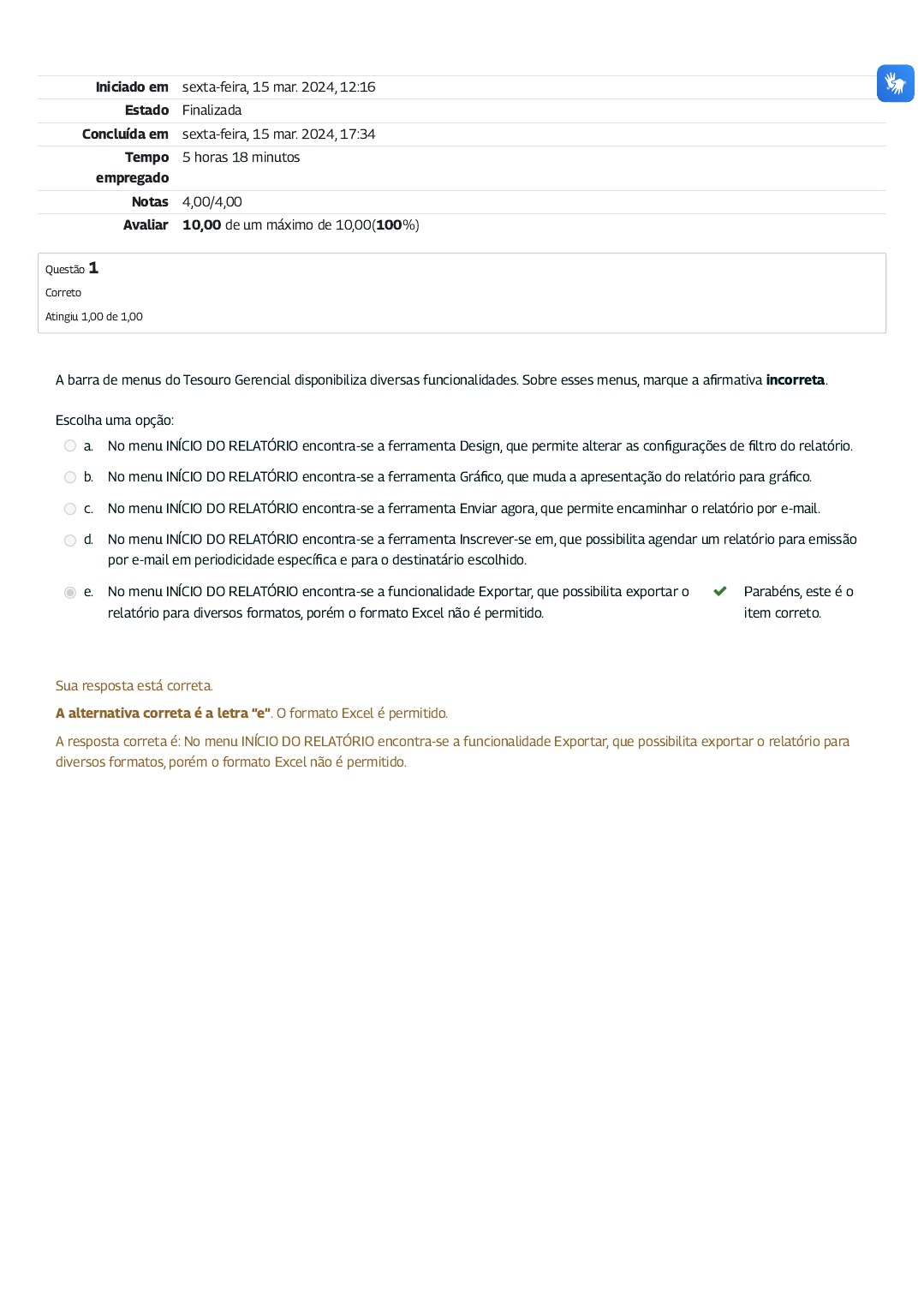 15/03/2024, 17:34 Exercício Avaliativo - Módulo 8: Revisão da tentativa https://mooc41.escolavirtual.gov.br/mod/quiz/review.php?attempt=2519612&cmid=47297 1/3 Iniciado em sexta-feira, 15 mar. 2024, 12:16 Estado Finalizada Concluída em sexta-feira, 15 mar. 2024, 17:34 Tempo empregado 5 horas 18 minutos Notas 4,00/4,00 Avaliar 10,00 de um máximo de 10,00(100%) Questão 1 Correto Atingiu 1,00 de 1,00 A barra de menus do Tesouro Gerencial disponibiliza diversas funcionalidades. Sobre esses menus, marque a a�rmativa incorreta. Escolha uma opção: a. No menu INÍCIO DO RELATÓRIO encontra-se a ferramenta Design, que permite alterar as con�gurações de �ltro do relatório. b. No menu INÍCIO DO RELATÓRIO encontra-se a ferramenta Grá�co, que muda a apresentação do relatório para grá�co. c. No menu INÍCIO DO RELATÓRIO encontra-se a ferramenta Enviar agora, que permite encaminhar o relatório por e-mail. d. No menu INÍCIO DO RELATÓRIO encontra-se a ferramenta Inscrever-se em, que possibilita agendar um relatório para emissão por e-mail em periodicidade especí�ca e para o destinatário escolhido. e. No menu INÍCIO DO RELATÓRIO encontra-se a funcionalidade Exportar, que possibilita exportar o relatório para diversos formatos, porém o formato Excel não é permitido. Parabéns, este é o item correto. Sua resposta está correta. A alternativa correta é a letra “e”. O formato Excel é permitido. A resposta correta é: No menu INÍCIO DO RELATÓRIO encontra-se a funcionalidade Exportar, que possibilita exportar o relatório para diversos formatos, porém o formato Excel não é permitido. 15/03/2024, 17:34 Exercício Avaliativo - Módulo 8: Revisão da tentativa https://mooc41.escolavirtual.gov.br/mod/quiz/review.php?attempt=2519612&cmid=47297 2/3 Questão 2 Correto Atingiu 1,00 de 1,00 Questão 3 Correto Atingiu 1,00 de 1,00 A respeito do menu FERRAMENTAS, associe as opções da coluna da esquerda com as da direita e depois assinale a alternativa correspondente. I) TODOS OS OBJETOS ( ) RELATÓRIOS RELACIONADOS disponível. II) RELATÓRIOS RELACIONADOS ( ) Aba TODOS OS OBJETOS disponibilizada. III) Paginar por Linha Central ( ) Botões de classi�cação em linhas e colunas. IV) Botões Classi�car ( ) Con�gura a forma de exibição do relatório. V) Opções de Relatório ( ) Filtro dinâmico ou seletor. Escolha uma opção: a. I, II, III, IV, V b. I, III, IV, V, II c. II, I, IV, V, III Parabéns, este é o item correto. d. I, III, II, V, IV e. V, IV, III, II, I Sua resposta está correta. A alternativa correta é a letra “c”. A resposta correta é: II, I, IV, V, III A respeito do menu DADOS, marque a opção correta. Escolha uma opção: a. A funcionalidade Editar Formulários de Atributo não permite que os códigos do atributo Item Informação sejam retirados da exibição de um relatório. b. A funcionalidade Mostrar Totais possibilita que apenas os subtotais dos saldos de um relatório sejam apresentados. c. A funcionalidade Editar Totais permite que sejam editadas as condições de totalização dos saldos de um relatório. Parabéns, este é o item correto. d. Na funcionalidade Mostrar Totais é possível editar as totalizações por posição ou entre níveis. e. Para remover todos os totais, é necessário clicar em Editar Totais. Sua resposta está correta. A alternativa correta é a letra “c”. a) Essa funcionalidade permite que os códigos do atributo Item de Informação sejam retirados do relatório. b) Essa funcionalidade também exibe os totais. d) São opções de Editar Totais. e) Para remover todos os totais, é necessário clicar em Mostrar Totais. A resposta correta é: A funcionalidade Editar Totais permite que sejam editadas as condições de totalização dos saldos de um relatório. 15/03/2024, 17:34 Exercício Avaliativo - Módulo 8: Revisão da tentativa https://mooc41.escolavirtual.gov.br/mod/quiz/review.php?attempt=2519612&cmid=47297 3/3 Questão 4 Correto Atingiu 1,00 de 1,00 A respeito das ferramentas Planilha e Formato, marque a opção correta. Escolha uma opção: a. No menu Planilha são disponibilizados formatos previamente de�nidos pelo Tesouro Gerencial. Parabéns, este é o item correto. b. Na ferramenta Planilha é possível selecionar a opção para mesclar cabeçalhos de colunas e de linhas. c. A ferramenta Formato permite a formatação da exibição dos relatórios. d. Por meio da ferramenta Formato é possível formatar a fonte dos textos de um relatório do Tesouro Gerencial. e. Por meio da ferramenta Formato é possível formatar as colunas e linhas de um relatório do Tesouro Gerencial. Sua resposta está correta. A alternativa correta é a letra “a”. No menu Planilha são disponibilizados formatos previamente de�nidos pelo Tesouro Gerencial. A resposta correta é: No menu Planilha são disponibilizados formatos previamente de�nidos pelo Tesouro Gerencial.