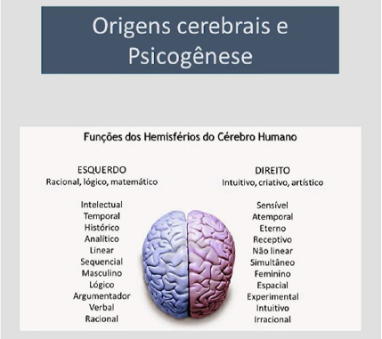 Conceito – Segundo Emília Ferreiro Piaget estudou a origem da Psicogênese com seus filhos. Posteriormente, Emília Ferreiro participou de uma grande pesquisa com Jean Piaget, na Argentina e lá surgiu o livro Psicogênese da Linguagem Escrita. Emília defende que o meio facilita a educação, estimulando a linguagem. A fala é um ato motor, onde todos os músculos envolvidos são estimulados desde a sucção. Quando, por exemplo, se aborda o tema fonemas, associados a desenhos, possibilitando a criança visualizar e oralizar, trabalha-se os dois hemisférios cerebrais. O hemisfério esquerdo é dominante na maioria das pessoas, totalizando 98% de toda a população do mundo, pois é ele que fica responsável pelo pensamento lógico e pela competência comunicativa. Nessa parte do cérebro estão localizadas a Área de Broca – responsável pela motricidade da fala, e a Área de Wernick – responsável pela compreensão verbal. O hemisfério direito, por sua vez, responde pela criatividade e pelo pensamento simbólico. É importante frisar que para os canhotos essa função que descrevemos dos hemisférios, são invertidas. Ambos hemisférios possuem um córtex motor, sendo que o que está localizado do lado direito tem como função controlar o lado esquerdo do corpo, enquanto o hemisfério esquerdo controla o direito. image1.png image2.png
