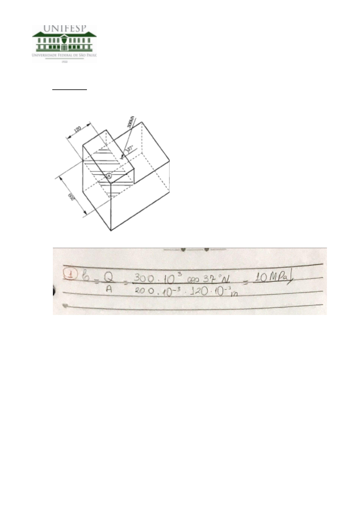 UNIVERSIDADE FEDERAL DE SÃO PAULO - Campus Diadema Departamento de Engenharia Química EXERCÍCIOS AVALIAÇÃO AULA 5 – FUNDAMENTOS DE MECÂNICA E RESISTÊNCIA DOS MATERIAIS 1S2020 Prof. Rogerio de Almeida Vieira 1ª Questão: Determinar a tensão de cisalhamento que atua no plano A da figura conforme segue: a) Resposta: = 10MPa 2ª Questão: Projetar a junta rebitada para que suporte uma carga de 125 kN aplicada conforme a figura. Ajunta deverá contar com 5 rebites. = 105MPa; σd = 225MPa; tch = 8mm (espessura das chapas). Resposta: a) Cálculo cisalhamento dos rebites - > d = 17,4mm; b) Pressão de contato (esmagamento) - > d= 13,9mm; c) Resposta final: O valor a considerar no projeto deverá ser de d= 17,4mm. Em consulta aos rebites comercializados verifica-se que os rebites a serem utilizados deverão ter d= 18mm por ser o mais próximo superior.