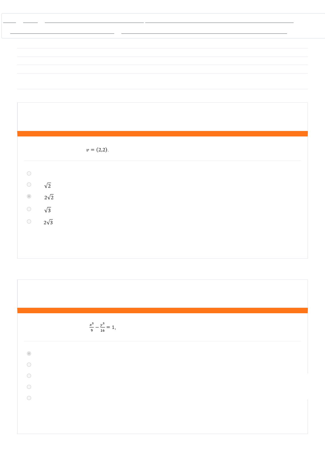 Iniciado em sexta, 12 abr 2024, 00:19 Estado Finalizada Concluída em sexta, 12 abr 2024, 00:37 Tempo empregado 18 minutos 21 segundos Avaliar 0,50 de um máximo de 0,50(100%) Questão 1 Completo Atingiu 0,05 de 0,05 Questão 2 Completo Atingiu 0,05 de 0,05 Determine a norma do vetor a. 2 b. c. d. e. Sua resposta está correta. Dada a equação da hipérbole determine a excentricidade. a. 1,6 b. 2,6 c. 3,6 d. 0,6 e. 1,2 Sua resposta está correta. Painel / Cursos / BACHARELADO EM ENGENHARIA DE PRODUÇÃO-disc. 18- GEOMETRIA ANALÍTICA E ÁLGEBRA LINEAR E VETORIAL / ATIVIDADE DE ESTUDO 01 - VALOR 0,5 PONTOS / CLIQUE AQUI PARA REALIZAR A ATIVIDADE DE ESTUDO 01 - ATÉ 08/05/2024 https://www.eadunifatecie.com.br/course/view.php?id=35933 https://www.eadunifatecie.com.br/course/view.php?id=35933 https://www.eadunifatecie.com.br/my/ https://www.eadunifatecie.com.br/course/index.php https://www.eadunifatecie.com.br/course/view.php?id=35933 https://www.eadunifatecie.com.br/course/view.php?id=35933#section-4 https://www.eadunifatecie.com.br/mod/quiz/view.php?id=1187617 Questão 3 Completo Atingiu 0,05 de 0,05 Questão 4 Completo Atingiu 0,05 de 0,05 Determine o versor do vetor a. b. c. d. e. Sua resposta está correta. Determine o vetor resultante da operação a. (9,13,-9). b. (9,0,0). c. (9,13,0). d. (-9,-13,-9). e. (9,11,9). Sua resposta está correta. Questão 5 Completo Atingiu 0,05 de 0,05 Questão 6 Completo Atingiu 0,05 de 0,05 Determine o ângulo formado entre as retas a. 120º. b. 90º. c. 60º. d. 30º. e. 45º. Sua resposta está correta. Dada a equação reduzida da elipse O que podemos afirmar sobre o centro da elipse? a. (0,0). b. (1,1). c. (0,1). d. (1,0). e. (2,1). Sua resposta está correta. Questão 7 Completo Atingiu 0,05 de 0,05 Questão 8 Completo Atingiu 0,05 de 0,05 Dada a equação reduzida determine a equação que representa as assíntotas da hipérbole. a. b. c. d. e. Sua resposta está correta. Se o vetor é combinação linear dos vetores então podemos afirmar que: a. b. c. d. e. Sua resposta está correta. Questão 9 Completo Atingiu 0,05 de 0,05 Questão 10 Completo Atingiu 0,05 de 0,05 Dada a equação geral da hipérbole encontre os focos. a. b. c. d. e. Sua resposta está correta. Dada a equação geral da elipse O que podemos afirmar sobre a equação reduzida desta elipse? a. b. c. d. e. Sua resposta está correta. ◄ ÁUDIO AULA 04 Seguir para... SLIDE AULA 05 ► https://www.eadunifatecie.com.br/mod/url/view.php?id=1187616&forceview=1 https://www.eadunifatecie.com.br/mod/resource/view.php?id=1187619&forceview=1