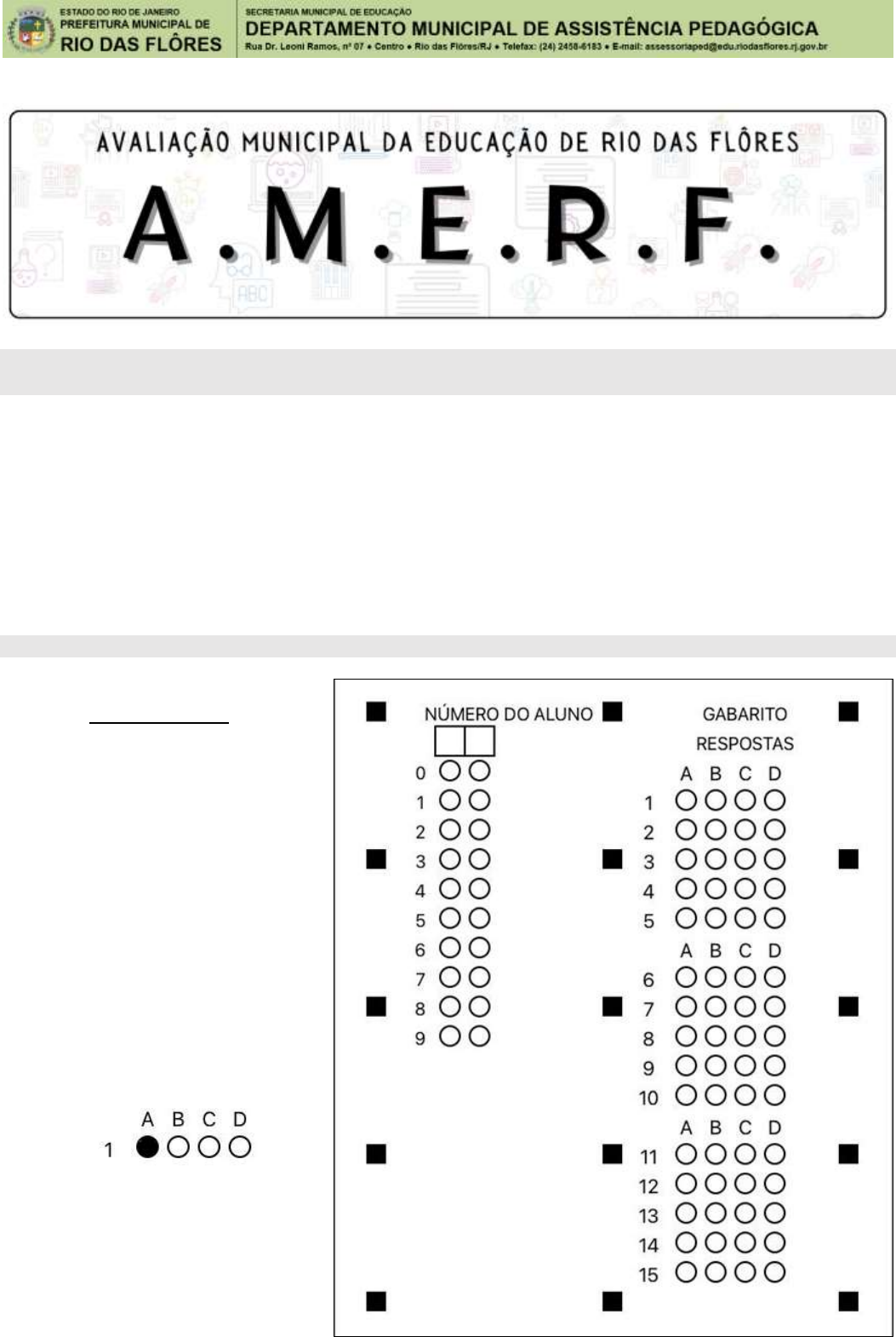 MATEMÁTICA 4º ano / Março de 2024 ESCOLA: __________________________________________________ ALUNO: ___________________________________________________ TURMA: ___________________ Data:____/____/______ RESPOSTAS INSTRUÇÕES: ✓ Escreva o seu número de chamada nos quadradinhos ao lado; ✓ Leia com atenção antes de responder e, só em seguida, marque as suas respostas no gabarito ao lado; ✓ Procure não deixar questões sem resposta; ✓ Cada questão tem uma única resposta correta. Pinte a opção certa como no modelo abaixo: ✓ Aguarde a autorização do professor/aplicador para passar suas respostas para o gabarito. Questão 1 (D3 – Identificar propriedades comuns e diferenças entre figuras bidimensionais pelo número de lados, pelos tipos de ângulos.) Observe a imagem abaixo: O coração representado nesta imagem é formado por: a) Dois círculos e um quadrado. b) Um círculo e um quadrado. c) Um círculo e um triângulo. d) Dois círculos e dois quadrados. Questão 2 (D6 - Estimar a medida de grandezas utilizando unidades de medida convencionais ou não) Observe a receita para preparar um cafezinho e em seguida responda a pergunta: 1 colher de pó equivale a aproximadamente: a) 1 kg b) 2 kg c) 500g d) 10g Questão 3 (D8 – Estabelecer relações entre unidades de medida de tempo.) Observe a imagem: Joana tem 9 anos e dorme muito bem! Seu horário de sono geralmente é de 21h às 7h. Quantas horas Joana dorme por noite? a) 10 horas b) 7 horas c) 5 horas d) 9 horas Questão 4 (D17 – Calcular o resultado de uma adição ou subtração de números naturais.) Observe a imagem a seguir: Para sorrir movimentamos: a) 50 músculos a mais b) 16 músculos a mais c) 10 músculos a menos d) 60 músculos a menos Questão 5 (D19 – Resolver problema com números naturais, envolvendo diferentes significados da adição ou subtração: juntar, alteração de um estado inicial (positiva ou negativa), comparação e mais de uma transformação, positiva ou negativa.) Na padaria “Gostosuras”, existe a campanha Pão Solidário que doa pãezinhos para as pessoas necessitadas todos os finais de semana. Observe a quantidade doada no último final de semana: O total de pães doados foi: a) 125 b) 205 c) 225 d) 25 PÃES DOADOS SÁBADO – 102 DOMINGO – 123 Questão 6 (D28 Ler informações e dados apresentados em gráficos (particularmente em gráficos de colunas) Observe o gráfico: A maioria dos alunos prefere ouvir: a) Funk b) Rock c) Sertanejo d) Pagode Questão 7 (D10 Num problema, estabelecer trocas entre cédulas e moedas do sistema monetário brasileiro em função de seus valores) Observe a imagem: De acordo com o anúncio o valor do cafezinho é R$1,50. Marque a resposta que indica este valor: a) b) c) d) Questão 8 (D18 - Calcular o resultado de uma multiplicação ou divisão de números naturais.) Para relaxar, Paula gosta de conversar com as amigas tomando um cafezinho. Desta vez a despesa será por conta dela, que pagará por 4 cafés. Quanto Paula irá gastar? a) R$ 2,00 b) R$ 3,00 c) R$ 5,00 d) R$ 6,00 Observe os dados abaixo para realizar as próximas questões: Questão 9 (D16 – Reconhecer a composição e decomposição de números naturais em sua forma polinomial.) De acordo com o gráfico, a quantidade de registros de casos de depressão e ansiedade em 2021, foram 565 casos. Uma das formas de decomposição deste número é: a) 6 centenas, 5dezenas e 5 unidades b) 5 centenas, 6 dezenas e 5 unidades c) 2 centenas, 5 dezenas e 2 unidades d) 5 centenas, 5 dezenas e 6 unidades Questão 10 (D21 - Identificar diferentes representações de um mesmo número racional.) De acordo com o gráfico, a porcentagem de crescimento dos casos de ansiedade e depressão entre crianças e adolescentes foi de: a) Oitenta por cento. b) Cem por cento. c) Cento e vinte por cento. d) Cento e cinquenta por cento. Questão 11 (D14 Identificar a localização de números naturais na reta numérica) De acordo com o gráfico, o próximo levantamento de dados acontecerá no ano de: a) 2025 b) 2024 c) 2023 d) 2022 Questão 12 (D18 – Calcular o resultado de uma multiplicação ou divisão de números naturais.) Levando em consideração o quantitativo de casos registrados em 2020, o triplo deste valor é: a) 1563 b) 1653 c) 1356 d) 1500 Questão 13 (D13 – Reconhecer e utilizar características do sistema de numeração decimal, tais como agrupamentos e trocas na base 10 e princípio do valor posicional) Retomando o quantitativo de casos em 2019, que foi 378, responda: O algarismo que ocupa a ordem das dezenas nesse número é: a) 8 b) 3 c) 0 d) 7 A imagem a seguir representa o quantitativo de alunos da Escola Cantinho Feliz, que se sentem sobrecarregados com as diversas atividades que fazem durante a semana: Questão 14 (D24 - Identificar fração como representação que pode estar associada a diferentes significados.) A fração que corresponde ao total de alunos que se sentem sobrecarregados é: a) b) c) d) 25 100 50 100 100 50 100 25 Questão 15 (D26 - Resolver problema envolvendo noções de porcentagem (25%, 50%, 100%). De acordo com a imagem, 50% dos alunos seria: a) 25 alunos b) 50 alunos c) 100 alunos d) 200 alunos