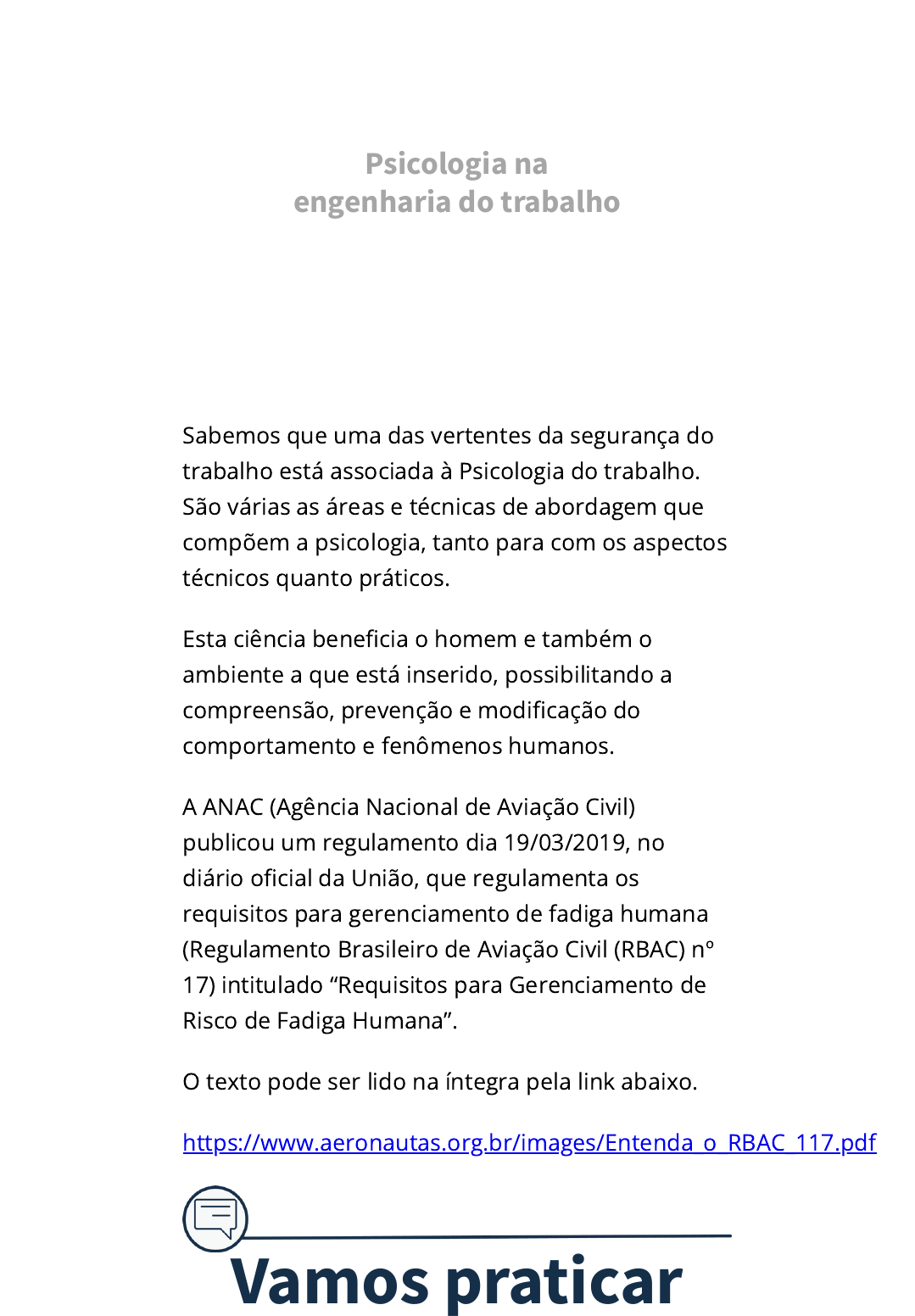 Sabemos que uma das vertentes da segurança do trabalho está associada à Psicologia do trabalho. São várias as áreas e técnicas de abordagem que compõem a psicologia, tanto para com os aspectos técnicos quanto práticos. Esta ciência bene�cia o homem e também o ambiente a que está inserido, possibilitando a compreensão, prevenção e modi�cação do comportamento e fenômenos humanos. A ANAC (Agência Nacional de Aviação Civil) publicou um regulamento dia 19/03/2019, no diário o�cial da União, que regulamenta os requisitos para gerenciamento de fadiga humana (Regulamento Brasileiro de Aviação Civil (RBAC) nº 17) intitulado “Requisitos para Gerenciamento de Risco de Fadiga Humana”. O texto pode ser lido na íntegra pela link abaixo. https://www.aeronautas.org.br/images/Entenda_o_RBAC_117.pdf Psicologia na engenharia do trabalho Vamos praticar https://www.aeronautas.org.br/images/Entenda_o_RBAC_117.pdf Com base no conteúdo apresentado, elabore uma analise da contribuição da psicologia do trabalho para determinar a necessidade de abordagem de fatores humanos como a fadiga, no exemplo, para a saúde e segurança, a redução de riscos e prevenção de acidentes no trabalho. Ao �nal, disponibilize seu trabalho no fórum da seção “compartilhe”.