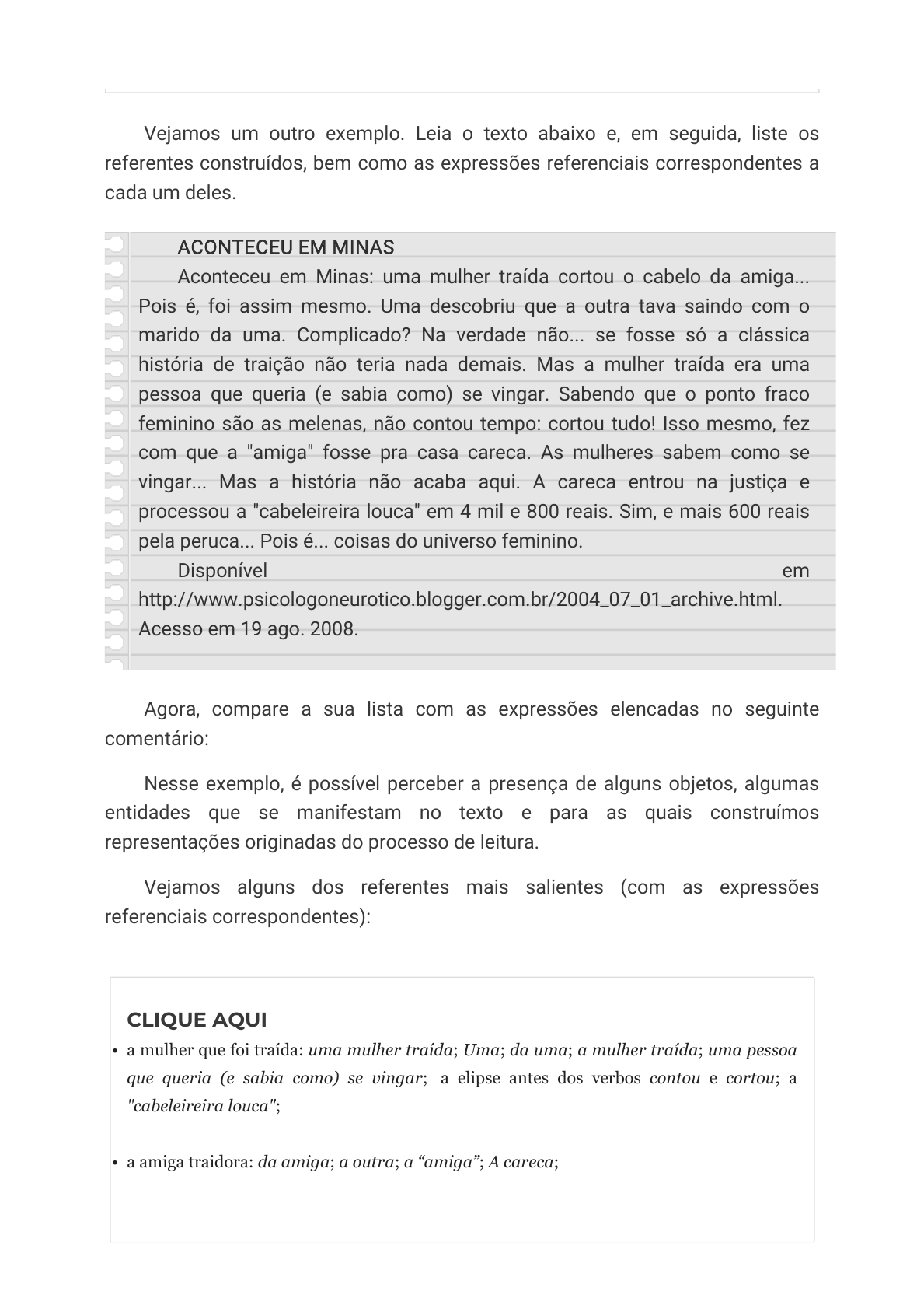 Vejamos um outro exemplo. Leia o texto abaixo e, em seguida, liste os referentes construídos, bem como as expressões referenciais correspondentes a cada um deles. ACONTECEU EM MINAS Aconteceu em Minas: uma mulher traída cortou o cabelo da amiga... Pois é, foi assim mesmo. Uma descobriu que a outra tava saindo com o marido da uma. Complicado? Na verdade não... se fosse só a clássica história de traição não teria nada demais. Mas a mulher traída era uma pessoa que queria (e sabia como) se vingar. Sabendo que o ponto fraco feminino são as melenas, não contou tempo: cortou tudo! Isso mesmo, fez com que a "amiga" fosse pra casa careca. As mulheres sabem como se vingar... Mas a história não acaba aqui. A careca entrou na justiça e processou a "cabeleireira louca" em 4 mil e 800 reais. Sim, e mais 600 reais pela peruca... Pois é... coisas do universo feminino. Disponível em http://www.psicologoneurotico.blogger.com.br/2004_07_01_archive.html. Acesso em 19 ago. 2008. Agora, compare a sua lista com as expressões elencadas no seguinte comentário: Nesse exemplo, é possível perceber a presença de alguns objetos, algumas entidades que se manifestam no texto e para as quais construímos representações originadas do processo de leitura. Vejamos alguns dos referentes mais salientes (com as expressões referenciais correspondentes): CLIQUE AQUI • a mulher que foi traída: uma mulher traída; Uma; da uma; a mulher traída; uma pessoa que queria (e sabia como) se vingar; a elipse antes dos verbos contou e cortou; a "cabeleireira louca"; • a amiga traidora: da amiga; a outra; a “amiga”; A careca; 104