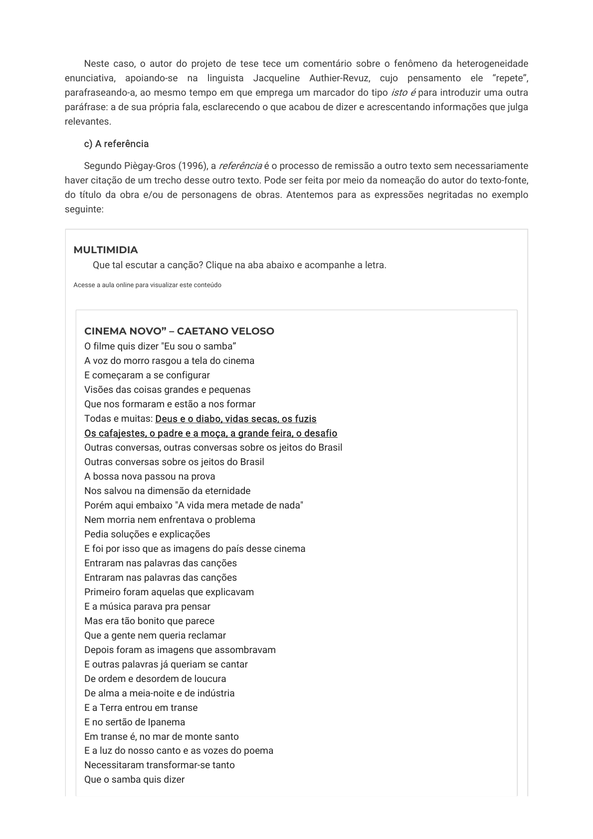 Neste caso, o autor do projeto de tese tece um comentário sobre o fenômeno da heterogeneidade enunciativa, apoiando-se na linguista Jacqueline Authier-Revuz, cujo pensamento ele “repete”, parafraseando-a, ao mesmo tempo em que emprega um marcador do tipo isto é para introduzir uma outra paráfrase: a de sua própria fala, esclarecendo o que acabou de dizer e acrescentando informações que julga relevantes. c) A referência Segundo Piègay-Gros (1996), a referência é o processo de remissão a outro texto sem necessariamente haver citação de um trecho desse outro texto. Pode ser feita por meio da nomeação do autor do texto-fonte, do título da obra e/ou de personagens de obras. Atentemos para as expressões negritadas no exemplo seguinte: MULTIMIDIA Que tal escutar a canção? Clique na aba abaixo e acompanhe a letra. Acesse a aula online para visualizar este conteúdo CINEMA NOVO” – CAETANO VELOSO O filme quis dizer "Eu sou o samba” A voz do morro rasgou a tela do cinema E começaram a se configurar Visões das coisas grandes e pequenas Que nos formaram e estão a nos formar Todas e muitas: Deus e o diabo, vidas secas, os fuzis Os cafajestes, o padre e a moça, a grande feira, o desafio Outras conversas, outras conversas sobre os jeitos do Brasil Outras conversas sobre os jeitos do Brasil A bossa nova passou na prova Nos salvou na dimensão da eternidade Porém aqui embaixo "A vida mera metade de nada" Nem morria nem enfrentava o problema Pedia soluções e explicações E foi por isso que as imagens do país desse cinema Entraram nas palavras das canções Entraram nas palavras das canções Primeiro foram aquelas que explicavam E a música parava pra pensar Mas era tão bonito que parece Que a gente nem queria reclamar Depois foram as imagens que assombravam E outras palavras já queriam se cantar De ordem e desordem de loucura De alma a meia-noite e de indústria E a Terra entrou em transe E no sertão de Ipanema Em transe é, no mar de monte santo E a luz do nosso canto e as vozes do poema Necessitaram transformar-se tanto Que o samba quis dizer 145