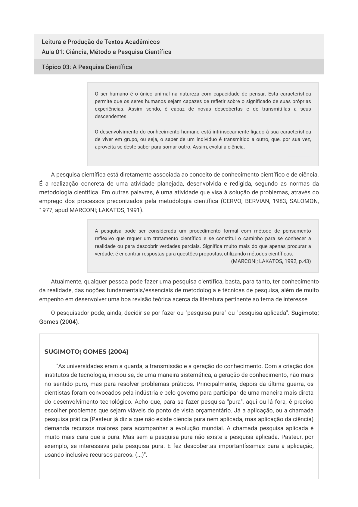 Leitura e Produção de Textos Acadêmicos Aula 01: Ciência, Método e Pesquisa Científica Tópico 03: A Pesquisa Científica O ser humano é o único animal na natureza com capacidade de pensar. Esta característica permite que os seres humanos sejam capazes de refletir sobre o significado de suas próprias experiências. Assim sendo, é capaz de novas descobertas e de transmiti-las a seus descendentes. O desenvolvimento do conhecimento humano está intrinsecamente ligado à sua característica de viver em grupo, ou seja, o saber de um indivíduo é transmitido a outro, que, por sua vez, aproveita-se deste saber para somar outro. Assim, evolui a ciência. Fonte [10] A pesquisa científica está diretamente associada ao conceito de conhecimento científico e de ciência. É a realização concreta de uma atividade planejada, desenvolvida e redigida, segundo as normas da metodologia científica. Em outras palavras, é uma atividade que visa à solução de problemas, através do emprego dos processos preconizados pela metodologia científica (CERVO; BERVIAN, 1983; SALOMON, 1977, apud MARCONI; LAKATOS, 1991). A pesquisa pode ser considerada um procedimento formal com método de pensamento reflexivo que requer um tratamento científico e se constitui o caminho para se conhecer a realidade ou para descobrir verdades parciais. Significa muito mais do que apenas procurar a verdade: é encontrar respostas para questões propostas, utilizando métodos científicos. (MARCONI; LAKATOS, 1992, p.43) Atualmente, qualquer pessoa pode fazer uma pesquisa científica, basta, para tanto, ter conhecimento da realidade, das noções fundamentais/essenciais de metodologia e técnicas de pesquisa, além de muito empenho em desenvolver uma boa revisão teórica acerca da literatura pertinente ao tema de interesse. O pesquisador pode, ainda, decidir-se por fazer ou "pesquisa pura" ou "pesquisa aplicada". Sugimoto; Gomes (2004). SUGIMOTO; GOMES (2004) "As universidades eram a guarda, a transmissão e a geração do conhecimento. Com a criação dos institutos de tecnologia, iniciou-se, de uma maneira sistemática, a geração de conhecimento, não mais no sentido puro, mas para resolver problemas práticos. Principalmente, depois da última guerra, os cientistas foram convocados pela indústria e pelo governo para participar de uma maneira mais direta do desenvolvimento tecnológico. Acho que, para se fazer pesquisa "pura", aqui ou lá fora, é preciso escolher problemas que sejam viáveis do ponto de vista orçamentário. Já a aplicação, ou a chamada pesquisa prática (Pasteur já dizia que não existe ciência pura nem aplicada, mas aplicação da ciência) demanda recursos maiores para acompanhar a evolução mundial. A chamada pesquisa aplicada é muito mais cara que a pura. Mas sem a pesquisa pura não existe a pesquisa aplicada. Pasteur, por exemplo, se interessava pela pesquisa pura. E fez descobertas importantíssimas para a aplicação, usando inclusive recursos parcos. (...)". Fonte [11] 15
