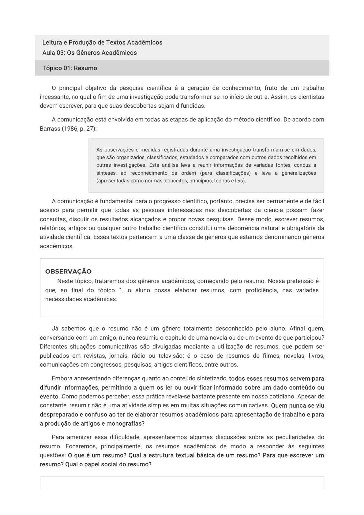 Leitura e Produção de Textos Acadêmicos Aula 03: Os Gêneros Acadêmicos Tópico 01: Resumo O principal objetivo da pesquisa científica é a geração de conhecimento, fruto de um trabalho incessante, no qual o fim de uma investigação pode transformar-se no início de outra. Assim, os cientistas devem escrever, para que suas descobertas sejam difundidas. A comunicação está envolvida em todas as etapas de aplicação do método científico. De acordo com Barrass (1986, p. 27): As observações e medidas registradas durante uma investigação transformam-se em dados, que são organizados, classificados, estudados e comparados com outros dados recolhidos em outras investigações. Esta análise leva a reunir informações de variadas fontes, conduz a sínteses, ao reconhecimento da ordem (para classificações) e leva a generalizações (apresentadas como normas, conceitos, princípios, teorias e leis). A comunicação é fundamental para o progresso científico, portanto, precisa ser permanente e de fácil acesso para permitir que todas as pessoas interessadas nas descobertas da ciência possam fazer consultas, discutir os resultados alcançados e propor novas pesquisas. Desse modo, escrever resumos, relatórios, artigos ou qualquer outro trabalho científico constitui uma decorrência natural e obrigatória da atividade científica. Esses textos pertencem a uma classe de gêneros que estamos denominando gêneros acadêmicos. OBSERVAÇÃO Neste tópico, trataremos dos gêneros acadêmicos, começando pelo resumo. Nossa pretensão é que, ao final do tópico 1, o aluno possa elaborar resumos, com proficiência, nas variadas necessidades acadêmicas. Já sabemos que o resumo não é um gênero totalmente desconhecido pelo aluno. Afinal quem, conversando com um amigo, nunca resumiu o capítulo de uma novela ou de um evento de que participou? Diferentes situações comunicativas são divulgadas mediante a utilização de resumos, que podem ser publicados em revistas, jornais, rádio ou televisão: é o caso de resumos de filmes, novelas, livros, comunicações em congressos, pesquisas, artigos científicos, entre outros. Embora apresentando diferenças quanto ao conteúdo sintetizado, todos esses resumos servem para difundir informações, permitindo a quem os ler ou ouvir ficar informado sobre um dado conteúdo ou evento. Como podemos perceber, essa prática revela-se bastante presente em nosso cotidiano. Apesar de constante, resumir não é uma atividade simples em muitas situações comunicativas. Quem nunca se viu despreparado e confuso ao ter de elaborar resumos acadêmicos para apresentação de trabalho e para a produção de artigos e monografias? Para amenizar essa dificuldade, apresentaremos algumas discussões sobre as peculiaridades do resumo. Focaremos, principalmente, os resumos acadêmicos de modo a responder às seguintes questões: O que é um resumo? Qual a estrutura textual básica de um resumo? Para que escrever um resumo? Qual o papel social do resumo? 38 impresso_parciais Leituraeproducaodetextosacademicos_aula_03