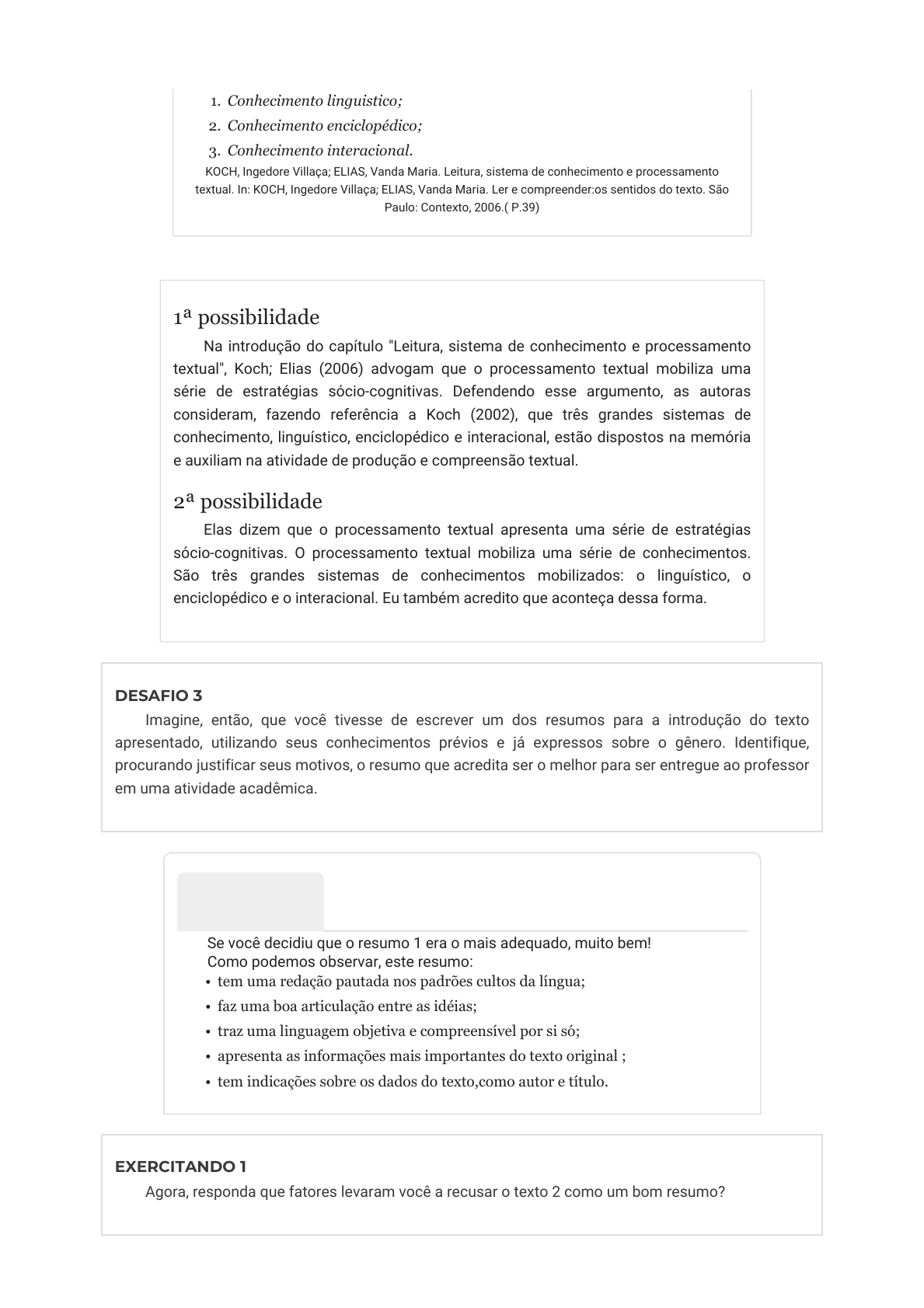 1. Conhecimento linguistico; 2. Conhecimento enciclopédico; 3. Conhecimento interacional. KOCH, Ingedore Villaça; ELIAS, Vanda Maria. Leitura, sistema de conhecimento e processamento textual. In: KOCH, Ingedore Villaça; ELIAS, Vanda Maria. Ler e compreender:os sentidos do texto. São Paulo: Contexto, 2006.( P.39) 1ª possibilidade Na introdução do capítulo "Leitura, sistema de conhecimento e processamento textual", Koch; Elias (2006) advogam que o processamento textual mobiliza uma série de estratégias sócio-cognitivas. Defendendo esse argumento, as autoras consideram, fazendo referência a Koch (2002), que três grandes sistemas de conhecimento, linguístico, enciclopédico e interacional, estão dispostos na memória e auxiliam na atividade de produção e compreensão textual. 2ª possibilidade Elas dizem que o processamento textual apresenta uma série de estratégias sócio-cognitivas. O processamento textual mobiliza uma série de conhecimentos. São três grandes sistemas de conhecimentos mobilizados: o linguístico, o enciclopédico e o interacional. Eu também acredito que aconteça dessa forma. DESAFIO 3 Imagine, então, que você tivesse de escrever um dos resumos para a introdução do texto apresentado, utilizando seus conhecimentos prévios e já expressos sobre o gênero. Identifique, procurando justificar seus motivos, o resumo que acredita ser o melhor para ser entregue ao professor em uma atividade acadêmica. Comentário... Se você decidiu que o resumo 1 era o mais adequado, muito bem! Como podemos observar, este resumo: • tem uma redação pautada nos padrões cultos da língua; • faz uma boa articulação entre as idéias; • traz uma linguagem objetiva e compreensível por si só; • apresenta as informações mais importantes do texto original ; • tem indicações sobre os dados do texto,como autor e título. EXERCITANDO 1 Agora, responda que fatores levaram você a recusar o texto 2 como um bom resumo? 41