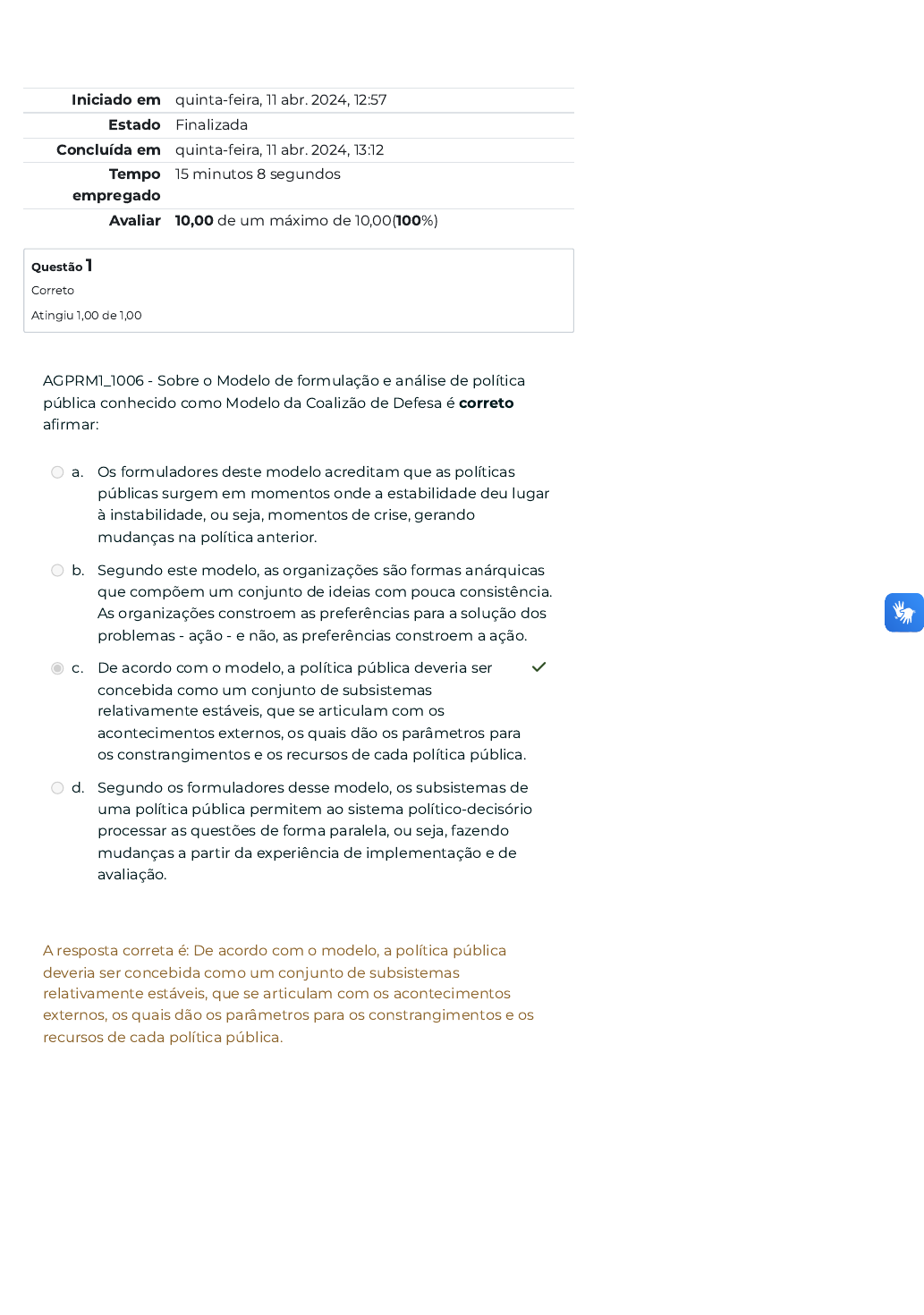 13/04/2024, 11:22 ATIVIDADE AVALIATIVA 01: Revisão da tentativa | EGPCE https://curso.egp.ce.gov.br/mod/quiz/review.php?attempt=7876&cmid=787 1/6 Iniciado em quinta-feira, 11 abr. 2024, 12:57 Estado Finalizada Concluída em quinta-feira, 11 abr. 2024, 13:12 Tempo empregado 15 minutos 8 segundos Avaliar 10,00 de um máximo de 10,00(100%) Questão 1 Correto Atingiu 1,00 de 1,00 AGPRM1_1006 - Sobre o Modelo de formulação e análise de política pública conhecido como Modelo da Coalizão de Defesa é correto a�rmar: a. Os formuladores deste modelo acreditam que as políticas públicas surgem em momentos onde a estabilidade deu lugar à instabilidade, ou seja, momentos de crise, gerando mudanças na política anterior. b. Segundo este modelo, as organizações são formas anárquicas que compõem um conjunto de ideias com pouca consistência. As organizações constroem as preferências para a solução dos problemas - ação - e não, as preferências constroem a ação. c. De acordo com o modelo, a política pública deveria ser concebida como um conjunto de subsistemas relativamente estáveis, que se articulam com os acontecimentos externos, os quais dão os parâmetros para os constrangimentos e os recursos de cada política pública. ✓ d. Segundo os formuladores desse modelo, os subsistemas de uma política pública permitem ao sistema político-decisório processar as questões de forma paralela, ou seja, fazendo mudanças a partir da experiência de implementação e de avaliação. A resposta correta é: De acordo com o modelo, a política pública deveria ser concebida como um conjunto de subsistemas relativamente estáveis, que se articulam com os acontecimentos externos, os quais dão os parâmetros para os constrangimentos e os recursos de cada política pública. 13/04/2024, 11:22 ATIVIDADE AVALIATIVA 01: Revisão da tentativa | EGPCE https://curso.egp.ce.gov.br/mod/quiz/review.php?attempt=7876&cmid=787 2/6 Questão 2 Correto Atingiu 1,00 de 1,00 Questão 3 Correto Atingiu 1,00 de 1,00 AGPRM1_1002 - Marque a opção correta sobre como são caracterizadas as políticas redistributivas. a. São políticas que atingem menor número de pessoas e impõe perdas concretas e no curto prazo para certos grupos sociais, e ganhos incertos e futuros para outros. b. São políticas que atingem maior número de pessoas e impõe perdas concretas e no curto prazo para certos grupos sociais, e ganhos incertos e futuros para outros. ✓ c. São mais visíveis ao público, envolvendo burocracia, políticos e grupos de interesse. d. São decisões tomadas pelo governo, que desconsideram a questão dos recursos limitados, gerando impactos mais individuais do que universais, ao privilegiar certos grupos sociais ou regiões, em detrimento do todo. A resposta correta é: São políticas que atingem maior número de pessoas e impõe perdas concretas e no curto prazo para certos grupos sociais, e ganhos incertos e futuros para outros. AGPRM1_1008 - Sobre os atores políticos ou stakeholders no contexto das políticas públicas assinale a opção correta: a. Entre os atores políticos, os atores públicos são aqueles que se distinguem por exercer funções públicas e por mobilizar os recursos associados a estas funções. ✓ b. Embora possam afetar o mercado e a oferta de empregos, os empresários são atores privados e, portanto, não são atores políticos. c. Consideram-se atores políticos apenas grupos ou organizações. d. Os atores políticos são aqueles cujos interesses poderão ser afetados apenas positivamente, pelo rumo tomado por uma determinada política pública. A resposta correta é: Entre os atores políticos, os atores públicos são aqueles que se distinguem por exercer funções públicas e por mobilizar os recursos associados a estas funções. 13/04/2024, 11:22 ATIVIDADE AVALIATIVA 01: Revisão da tentativa | EGPCE https://curso.egp.ce.gov.br/mod/quiz/review.php?attempt=7876&cmid=787 3/6 Questão 4 Correto Atingiu 1,00 de 1,00 Questão 5 Correto Atingiu 1,00 de 1,00 AGPRM1_1005 - Sobre os burocratas marque a opção INCORRETA: a. Possuem projetos políticos, que podem ser pessoais (como promoções, reconhecimento em termos de poder ou de grati�cações materiais ou simbólicas etc.) ou organizacionais (como a �delidade à instituição, o crescimento da organização à qual pertencem etc.). b. Devem a sua posição à ocupação de postos de trabalho que não requerem conhecimento especializado e que se situam em um sistema de cargos públicos. ✓ c. Controlam, principalmente, recursos de autoridade e informação. Embora não possuam mandato, os burocratas geralmente possuem “clientelas” setoriais. d. Praticamente não aparecem nos debates, mas têm interesses em jogo em uma dada política e podem in�uenciar fortemente o seu curso porque contam com recursos de poder, como informação, conhecimento do processo administrativo e autoridade. A resposta correta é: Devem a sua posição à ocupação de postos de trabalho que não requerem conhecimento especializado e que se situam em um sistema de cargos públicos. AGPRM1_1003 - De acordo com o texto, marque a opção que apresenta apenas modelos de formulação e análise de políticas públicas. a. Incrementalismo; Modelo da Coalizão de Defesa; Modelo garbage can; Ciclo da Política Pública. ✓ b. Arenas Políticas; Equilíbrio interrompido; Modelo de Aliança e Defesa; Incrementalismo; c. Arenas Sociais; Equilíbrio interrompido; Políticas Distributivas; Ciclo da Política Pública; d. Equilíbrio interrompido; Modelo garbage can; Ciclo de Políticas Públicas; Modelo de Aliança e Defesa. A resposta correta é: Incrementalismo; Modelo da Coalizão de Defesa; Modelo garbage can; Ciclo da Política Pública. 13/04/2024, 11:22 ATIVIDADE AVALIATIVA 01: Revisão da tentativa | EGPCE https://curso.egp.ce.gov.br/mod/quiz/review.php?attempt=7876&cmid=787 4/6 Questão 6 Correto Atingiu 1,00 de 1,00 Questão 7 Corr