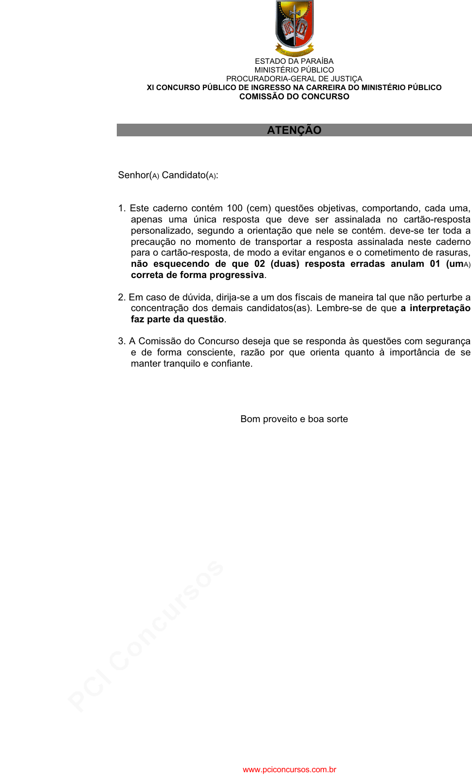 pcimarkpci MDAwMDowMDAwOjAwMDA6MDAwMDowMDAwOmZmZmY6YmI1ZjpmZjA2:U3VuLCAxMyBTZXAgMjAyMCAxNjoxODowMyAtMDMwMA== ESTADO DA PARAÍBA MINISTÉRIO PÚBLICO PROCURADORIA-GERAL DE JUSTIÇA XI CONCURSO PÚBLICO DE INGRESSO NA CARREIRA DO MINISTÉRIO PÚBLICO COMISSÃO DO CONCURSO ATENÇÃO Senhor(A) Candidato(A): 1. Este caderno contém 100 (cem) questões objetivas, comportando, cada uma, apenas uma única resposta que deve ser assinalada no cartão-resposta personalizado, segundo a orientação que nele se contém. deve-se ter toda a precaução no momento de transportar a resposta assinalada neste caderno para o cartão-resposta, de modo a evitar enganos e o cometimento de rasuras, não esquecendo de que 02 (duas) resposta erradas anulam 01 (umA) correta de forma progressiva. 2. Em caso de dúvida, dirija-se a um dos físcais de maneira tal que não perturbe a concentração dos demais candidatos(as). Lembre-se de que a interpretação faz parte da questão. 3. A Comissão do Concurso deseja que se responda às questões com segurança e de forma consciente, razão por que orienta quanto à importância de se manter tranquilo e confiante. Bom proveito e boa sorte www.pciconcursos.com.br pcimarkpci MDAwMDowMDAwOjAwMDA6MDAwMDowMDAwOmZmZmY6YmI1ZjpmZjA2:U3VuLCAxMyBTZXAgMjAyMCAxNjoxODowMyAtMDMwMA== 2 DIREITO CONSTITUCIONAL 1. Quanto à idade mínima prevista na CF, para exercício de certos cargos públicos e mandatos, é incorreto dizer que: A) a idade mínima é de 30 (trinta) anos para Senador. B) a idade mínima para ser Ministro do Supremo é ter mais de 35 (trinta e cinco) anos. C) a idade mínima é de 35 (trinta e cinco) anos para Presidente e Vice-Presidente da República. D) a idade mínima é de mais de 21 (vinte e um) anos para Juiz de Paz. E) a idade mínima para vereador é 18 (dezoito) anos. 2. Assinale a alternativa correta sobre a competência originária nos casos de crimes contra a administração pública: A) os membros dos Tribunais de Contas dos Estados são julgados originariamente pelos respectivos Tribunais de Justiça dos Estados; B) os membros dos Tribunais de Contas dos Estados são julgados originariamente pelo Superior Tribunal de Justiça; C) os membros dos Tribunais de Contas dos Estados são julgados originariamente pelos componentes dos Tribunais Regionais Federais; D) os membros dos Tribunais Regionais Federais são julgados pelo Supremo Tribunal Federal; E) os membros dos Tribunais de Contas dos Municípios são julgados originariamente pelos Tribunais de Justiça dos respectivos Estados. 3. A intervenção federal nos Estados é decretada: A) pelo Presidente da República, sendo sempre controlada pelo Senado Federal; B) pelo Presidente da República podendo ser, em casos determinados pela Constituição Federal, dispensada a apreciação pelo Congresso Nacional; C) pelo Presidente do Supremo Tribunal Federal, mas sempre depois de ouvido o Congresso Nacional; D) pelo Congresso Nacional após solicitação do Presidente da República; E) pelo Presidente da República por determinação do Poder Judiciário. 4. É correto dizer que o direito de ação quanto aos créditos resultantes das relações de trabalho: A) prescreve em três anos para o trabalhador urbano, contados da extinção do contrato; B) prescreve em dois anos, após a extinção do contrato, apenas para o trabalhador urbano; C) tem prazo prescricional de quatro anos para trabalhadores urbanos e rurais; D) tem prazo prescricional de seis anos para trabalhadores urbanos e rurais, sem considerar o tempo do contrato de trabalho; E) prescreve em dois anos para o trabalhador rural ou urbano o direito de reclamar diferença salarial. 5. Em relação ao Ministério Público é correto dizer que: A) considerando o princípio da unidade, o Ministério Público Federal pode atuar na Justiça Estadual e o Ministério Público Estadual atuar na Justiça Federal, na defesa de suas funções, prescindindo, para tanto, do litisconsórcio entre eles; B) a vitaliciedade constitui uma garantia do cargo, por isso, o representante do Parquet, depois de dois anos, só poderá perder o cargo por sentença judicial transitada em julgado ou decisão tomada em processo administrativo disciplinar; C) é função do Ministério Público promover, privativamente, a ação penal e a ação civil pública; D) a garantia da inamovibilidade dos representantes do Ministério Público só é conferida após o decurso do estágio probatório de três anos; E) é função institucional do Ministério Público exercer o controle externo da atividade policial. 6. Compete, concorrentemente, à União, aos Estados e ao Distrito Federal legislar sobre: A) serviço postal; B) direito processual; C) procedimentos em matéria processual; D) trânsito; E) organização judiciária da Defensoria Pública do Distrito Federal. www.pciconcursos.com.br pcimarkpci MDAwMDowMDAwOjAwMDA6MDAwMDowMDAwOmZmZmY6YmI1ZjpmZjA2:U3VuLCAxMyBTZXAgMjAyMCAxNjoxODowMyAtMDMwMA== 3 7. Não constitui cláusula pétrea: A) a forma federativa do Estado; B) o voto periódico; C) o voto universal; D) os direitos e garantias coletivas; E) os direitos e garantias individuais. 8. Ocorrendo impedimento, concomitantemente, do Presidente e do Vice-Presidente da República ou, no caso de vacância de ambos os cargos, convocar-se-á eleição direta para noventa dias depois da última vaga, se esta ocorrer antes de iniciar os dois últimos anos de mandato presidencial. Contudo, se a última vaga se der nos últimos dois anos: A) o Presidente da Câmara dos Deputados cumpre o tempo do mandato restante; B) o Presidente do Senado Federal cumpre o tempo do mandato restante; C) o Presidente do Supremo Tribunal Federal cumpre o tempo do mandato restante; D) o Congresso Nacional elege o Presidente e o Vice para cumprir o tempo do mandato restante; E) o Presidente do Congresso Nacional convoca eleição direta para preenchimento das vagas no prazo de trinta dias. 9. Assinale a alternativa co