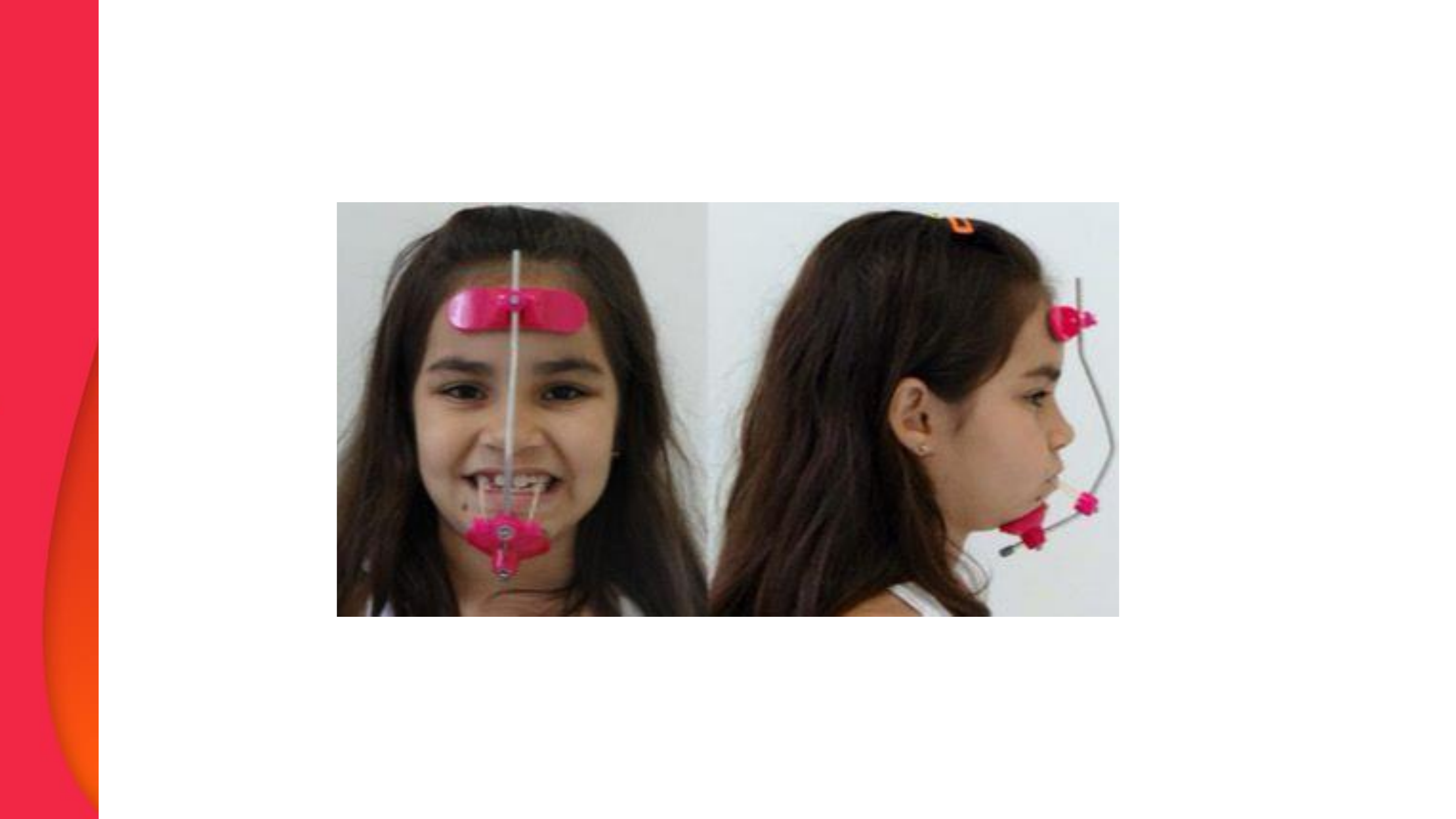MÁSCARA FACIAL Discentes: Estefany Vieira, Gabriel Teixeira, Kamylla Paula, Lídia Miranda e Maiana Vaz. MÁSCARA FACIAL DE PETIT • O apoio na testa, o suporte para tracionamento e a mentoneira, podem ter suas posições modificadas; • Após devidamente posicionados, deve-se reapertar os parafusos, até que os mesmos permaneçam devidamente fixados à haste central; • Concluído os ajustes ao paciente, faz-se necessária a remoção dos "excessos" de ambas extremidades da haste central. •Após a remoção, deve-se introduzir as ponteiras de proteção, na haste central, a fim de evitar possíveis acidentes. Máscara Facial: O estudo é um relato de caso clínico, de uma paciente com má oclusão do tipo classe III. Classe III: De origem genética e com prognatismo mandibular. HIPÓTESES DE PESQUISA: Acompanhar e tratar as alterações oclusais durante a fase de dentição mista, são ações importantes para alcançarem resultados satisfatórios. A expansão rápida da maxila e a tração reversa são capazes de fornecer sobrecorreção imediata com a manutenção de morfologia facial e oclusal. CASO CLÍNICO • Paciente ILS, sexo feminino, 7 anos; • Os pais se incomodavam em relação ao sorriso da criança, havia uma certa proeminência mandibular (principais características compatíveis a Classe III); • Desarmonia facial envolvendo ossos, dentes e músculos; • Crescimento excessivo mandibular em relação a maxila; • Mordida cruzada anterior; • Perfil côncavo. DIAGNÓSTICO • Padrão facial equilibrado; • Linha queixo-pescoço aumentada; • Perfil SUAVEMENTE côncavo; • Sulco nasolabial mais evidente que o sulco mentoniano; • Incisivos centrais inferiores mais evidente que os incisivos centrais superiores; • No exame extra bucal observa-se que os lábios inferiores são mais evidentes que o superiores. (FONTE: OLIVEIRA, 2021). EXAME INTRABUCAL • Paciente com 1/4 de classe III, bilateral; • Mordida cruzada anterior; • Distema anterior compatível com a idade; • Paciente em período transitório; • Apenas os incisivos centrais inferiores são permanentes. Figura 2: Fotos intrabucais iniciais. A. Foto intrabucal frontal; B. Foto intrabucal lateral direita; e C. Foto intrabucal lateral esquerda. (FONTE: OLIVEIRA, 2021). EXAME RADIOGRÁFICO Figura 3: Radiografia panorâmica inical. Figura 04: Avaliação extra-oral (foto perfil) e Telerradiografia em normal lateral. (FONTES: OLIVEIRA, 2021). OPÇÕES DE TRATAMENTO • FORAM PROPOSTOS: a) expansão ortopédica da maxila; b) aguardar o término do crescimento esquelético, para posterior intervenção ortodôntica. OPÇÕES DE TRATAMENTO • Moldagem dos arcos para a confecção do aparelho de Eschler (Arco Progênico). Figura 5: Fotos iniciais do tratamento. A. Vista lateral esquerda; B. Foro frontal; e C. Vista lateral direita. (FONTE: OLIVEIRA, 2021). • DURANTE 5 MESES com 2/4 de voltas. • 7° MÊS APARELHO QUEBROU. ALTERAÇÃO NO TRATAMENTO • O tratamento foi alterado para o aparelho Bihelice associado ao uso de máscara de tração reversa. Figura 6: Fotos intrabucais após a instalação do aparelho bihélice. a.Vista lateral esquerda; b.B. Vista frontal; c.C. Vista lateral direita; d.D. Vista Oclusal (FONTES: OLIVEIRA, 2021). • O elástico de eleição foi o 5/16 com orientação para utilização de 8 a 12 horas por dia, no uso da máscara facial, sendo realizada a troca semanal dos elásticos (figura 8 e 9). Figura 8: Fotos extrabucais e intrabucais. A. Foto extrabucal de frontal após a instalação da mascára facial; B. Foto extrabucal de perfil após a instalação da máscara facial (FONTE: OLIVEIRA, 2021). Figura 9: Fotos intrabucais. A. Foto intrabucal frontal após a instalação da BTP; B. Foto oclusal após a instalação da BTP; C. Foto intrabucal lateral direita após a instalação da BTP; e F. Foto intrabucal lateral esquerda após a instalação da BTP. (FONTE: OLIVEIRA, 2021). INÍCIO DO TRATAMENTO CORRETIVO • O início do tratamento corretivo foi feito com o uso do dispositivo biofuncional. Figura 10: Fotos intrabucais após remoção mascara. A. Foto intrabucal frontal; B. Foto intrabucal lado direito; C. Foto intra bucal lado esquerdo (FONTE: OLVEIRA, 2021). Figura 11: Fotos intrabucais da finalização com elásticos linha média e intercuspidação. A. Foto intrabucal frontal; B. Foto intrabucal lado direito; e C. Foto intrabucal lado esquerdo (FONTE: OLVEIRA, 2021). Figura 13: Radiografia panorâmica após finalização do tratamento ortodôntico, evidenciando a ausência do segundo molar superior. (FONTES: OLIVEIRA, 2021) DOCUMENTAÇÃO FINAL Figura 12: Radiografia periapical, evidenciando a instalação da contenção 3x3. Figura 15: Foto extra-oral, evidenciando o perfil facial após o término do tratamento (FONTE: OLVEIRA, 2021). Figura 16: Foto intra-oral, evidenciando a oclusão ao final do tratamento. (FONTE: OLVEIRA, 2021). RESULTADOS • O tratamento foi concluído com a instalação da placa de Hawley e da contenção inferior. • É possível observar as alterações ocorridas no tratamento através da sobreposição das telerradiografias da fase inicial até a final. • Ao final do tratamento, observa-se um aumento do ANB, mantendo um boa relação entre a maxila e a mandíbula, demonstrado pelo aumento do SNA e SNB • Do ponto de vista das relações dentarias, observa-se incisivo central superior com vestibularização e uma protrusão no tratamento ortopédico, seguida de retrusão na fase corretiva. • Para os incisivos inferiores ocorreu uma vestibularização, protusão na fase ortopédica e retrusão no tratamento corretivo. • Houver também um aumento do OverJet de 2,5mm em cada uma das fases totalizando em 5mm ao final da fase corretiva. • Com o término do tratamento, chegou-se a uma oclusão funcional com melhoria da assimetria fácil e correção das alterações dentarias e do perfil classe III da paciente. DISCUSSÃO • O tr