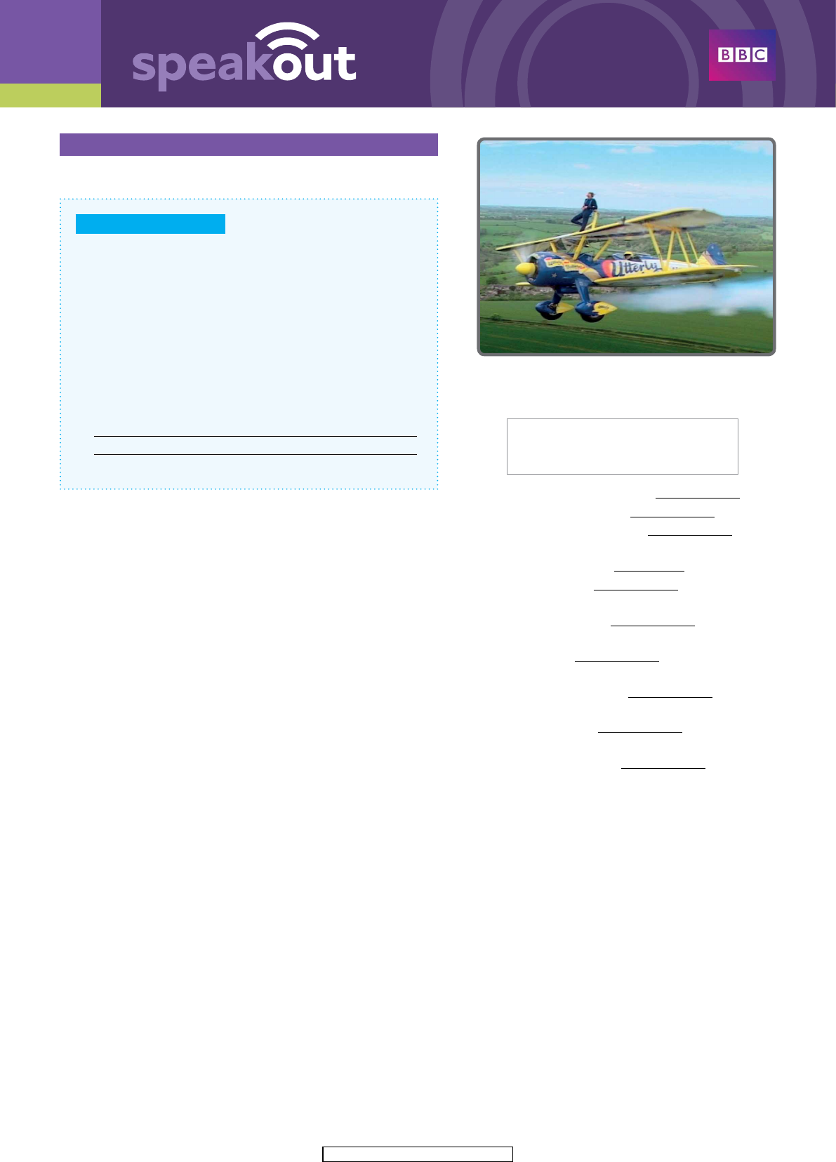 1 © Pearson Education Limited 2016 DVD EXTRA UPPER-INTERMEDIATE UNIT 1 1 A Read the questionnaire and add two more experiences. B Work in pairs. Ask each other the questions on your questionnaire and give points for things your partner has done. If he/she answers ‘yes’, ask questions to fi nd out more information. Who has had the most experiences? 2 Watch the DVD and number the activities in the order you see them. a) wingwalking b) swimming with dolphins c) driving Route 66 d) bungee jumping e) husky sledding 3 A Choose the correct alternative to complete the extracts from the DVD. Which activity does each one relate to? 1 For many, it’s remembered as the road/path to opportunity. 2 Totally silent apart from the sound of the sled and the dogs’ feet/paws . 3 Just to fl y like that, and end up being stretched and pulled/bounced back up. Great fun. 4 Two thousand four hundred miles, eight states / countries , three time zones, one incredible journey. 5 Once you swim with them, you want to/don’t want to leave them. 6 Their legendary curiosity and playfulness have enchanted/amazed us for generations. 7 The snow has got little bits of crystal/ice all over it. 8 Next up, something you’ve let get as popular/high as seventeen on this list. 9 It’s been wonderful. An amazing experience/day . 10 I’m feeling excited, a little bit scared/nervous , can’t wait, raring to go. B Watch the DVD again to check. 4 A Match the adjectives in the box to the things they describe in the DVD. awesome beautiful legendary excited famous fantastic magical lucky silent strong 1 the snow in Finland 2 Husky sledding 3 how Rebecca feels 4 what the wind is like while wingwalking 5 Route 66 6 the route from Chicago to Los Angeles 7 what the experience of bungee jumping is like 8 what the experience of swimming with dolphins is like 9 what the dolphins feel like to the presenter 10 how the presenter feels when she swims with dolphins B Watch the DVD again to check. 5 A EITHER choose something you’d like to do before you die OR choose one of the activities below and fi nd out as much as you can about it. Use questions 1–3 to help you. • fl y in a hot-air balloon • go paragliding • drive a Formula-1 car • do the Cresta Run 1 Where can you do it? 2 How much does it cost? 3 Do you need any special training and/or equipment? B Work in groups. Ask and answer questions about the activity you chose. Life experiences Have you ever: • fl own a plane? • ridden a horse? • visited the Arctic or Antarctica? • eaten a strange food? • met someone famous? • given a speech? • cooked a meal for more than six people? • climbed a mountain? • • Score one point for each ‘yes’.