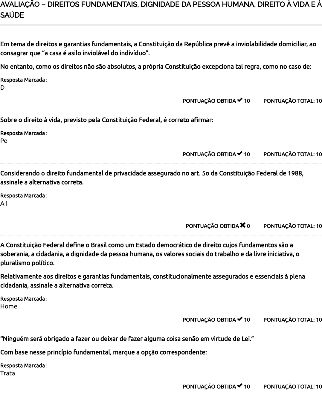 14/04/2024 11:34 Course Status – Faculdade Educavales https://ava.educavales.universaeducacional.com.br/course-status/ 1/2 AVALIAÇÃO – DIREITOS FUNDAMENTAIS, DIGNIDADE DA PESSOA HUMANA, DIREITO À VIDA E À SAÚDE PONTUAÇÃO TOTAL: 10PONTUAÇÃO OBTIDA 10 Em tema de direitos e garantias fundamentais, a Constituição da República prevê a inviolabilidade domiciliar, ao consagrar que “a casa é asilo inviolável do indivíduo”. No entanto, como os direitos não são absolutos, a própria Constituição excepciona tal regra, como no caso de: Resposta Marcada : Determinação judicial, apenas durante o dia. PONTUAÇÃO TOTAL: 10PONTUAÇÃO OBTIDA 10 Sobre o direito à vida, previsto pela Constituição Federal, é correto a�rmar: Resposta Marcada : Permite-se, excepcionalmente, a instituição de pena de morte no Brasil. PONTUAÇÃO TOTAL: 10PONTUAÇÃO OBTIDA 0 Considerando o direito fundamental de privacidade assegurado no art. 5o da Constituição Federal de 1988, assinale a alternativa correta. Resposta Marcada : A interceptação das comunicações telefônicas pode ser decretada por ordem judicial em processo de natureza penal, civil ou administrativa, na forma da lei. PONTUAÇÃO TOTAL: 10PONTUAÇÃO OBTIDA 10 A Constituição Federal de�ne o Brasil como um Estado democrático de direito cujos fundamentos são a soberania, a cidadania, a dignidade da pessoa humana, os valores sociais do trabalho e da livre iniciativa, o pluralismo político. Relativamente aos direitos e garantias fundamentais, constitucionalmente assegurados e essenciais à plena cidadania, assinale a alternativa correta. Resposta Marcada : Homens e mulheres são iguais em direitos e obrigações. PONTUAÇÃO TOTAL: 10PONTUAÇÃO OBTIDA 10 “Ninguém será obrigado a fazer ou deixar de fazer alguma coisa senão em virtude de Lei.” Com base nesse princípio fundamental, marque a opção correspondente: Resposta Marcada : Trata do princípio da legalidade. 14/04/2024 11:34 Course Status – Faculdade Educavales https://ava.educavales.universaeducacional.com.br/course-status/ 2/2 80 / 100 PONTUAÇÃO TOTAL: 10PONTUAÇÃO OBTIDA 10 Os direitos fundamentais, é classi�cado por alguns doutrinadores como de três gerações, nesse sentido, marque a alternativa correta: Resposta Marcada : Os direitos de primeira geração que trazem o reconhecimento das liberdades, seriam então os direitos fundamentais do homem como indivíduo. PONTUAÇÃO TOTAL: 10PONTUAÇÃO OBTIDA 10 Com base nos estudos realizados, podemos conhecer diferentes perspectivas acerca dos direitos fundamentais, tendo como respaldo os pensamentos de Robert Alexy, marque a alternativa incorreta: Resposta Marcada : Conforme o autor, esses direitos não precisam de proteção especial pois tudo o que a Constituição dispõe possui a mesma importância, deste modo, qualquer necessidade é considerada fundamental. PONTUAÇÃO TOTAL: 10PONTUAÇÃO OBTIDA 10 A Constituição Federal/88 garante o direito à livre manifestação do pensamento e, para tanto, em relação ao manifestante, impõe: Resposta Marcada : A vedação ao anonimato. PONTUAÇÃO TOTAL: 10PONTUAÇÃO OBTIDA 10 Quando o assunto é direitos fundamentais, destaca Dirley da Cunha Júnior que: “Como princípios jurídico-constitucionais especiais que concretizam o respeito à dignidade da pessoa humana, surgiram com a criação do Estado Constitucional, no �nal do século XVIII, fruto do seu reconhecimento pelas primeiras normas constitucionais.” Complete as lacunas acima: Resposta Marcada : “Jurídico-constitucionais”, “Estado Constitucional” e “século XVIII”. PONTUAÇÃO TOTAL: 10PONTUAÇÃO OBTIDA 0 Os direitos fundamentais são compreendidos com uma garantia da dignidade da pessoa humana, com base nesse preceito, marque a alternativa incorreta: Resposta Marcada : Os direitos fundamentais devem criar e manter as condições elementares para assegurar uma vida em liberdade e a dignidade humana. Total